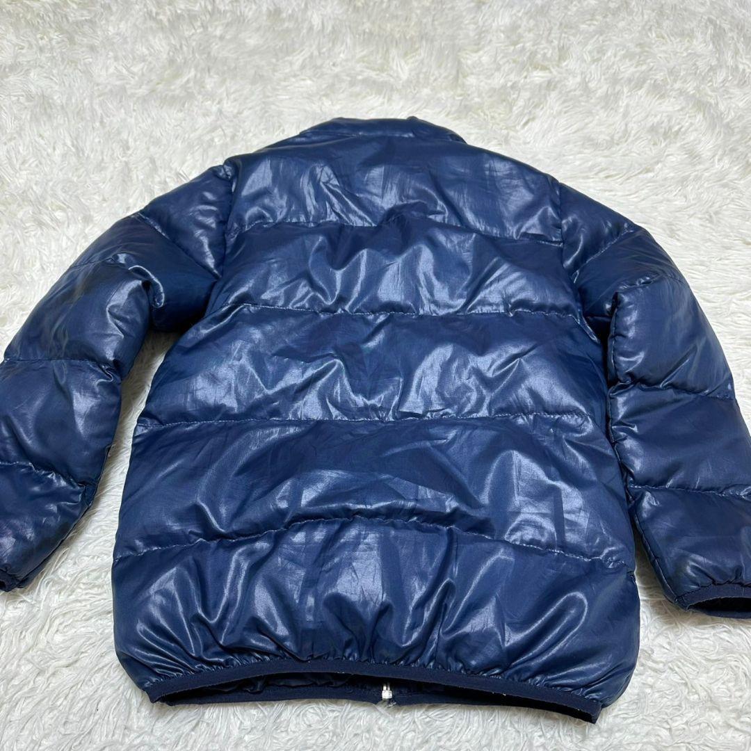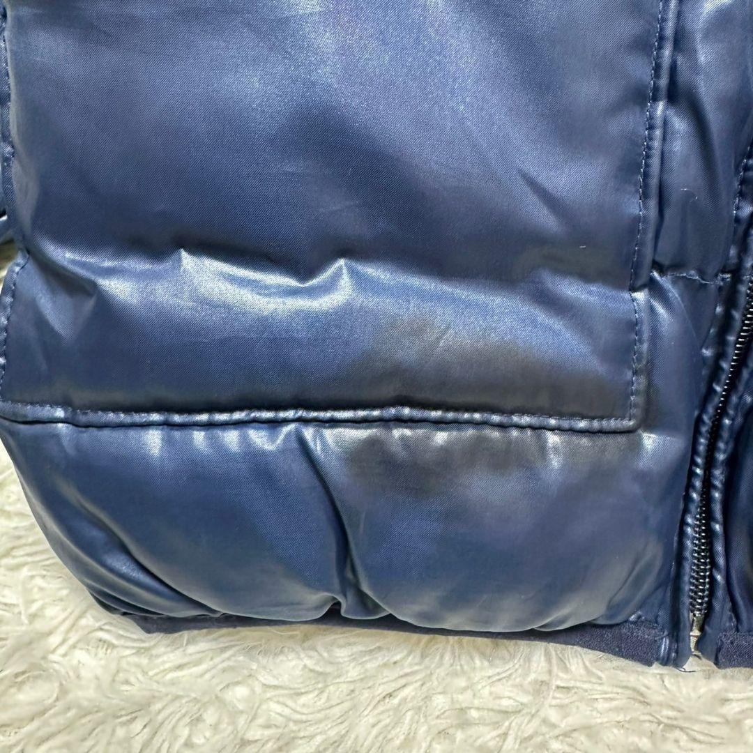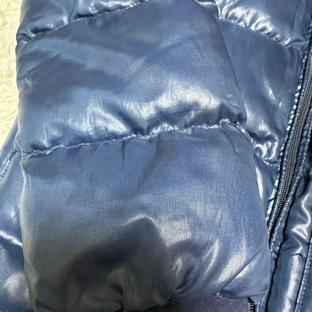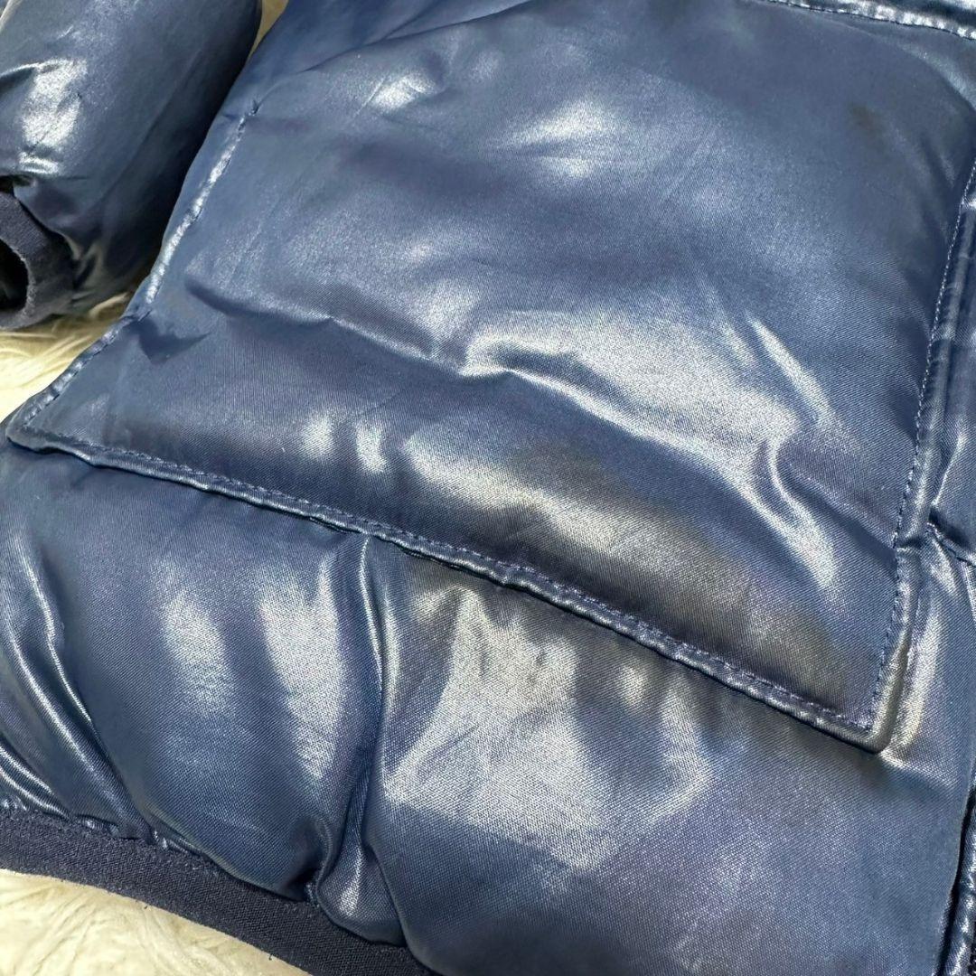 光沢のあるネイビーのダウンジャケット、スタンドカラーと前面ポケット付き。