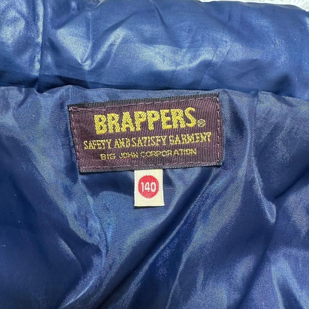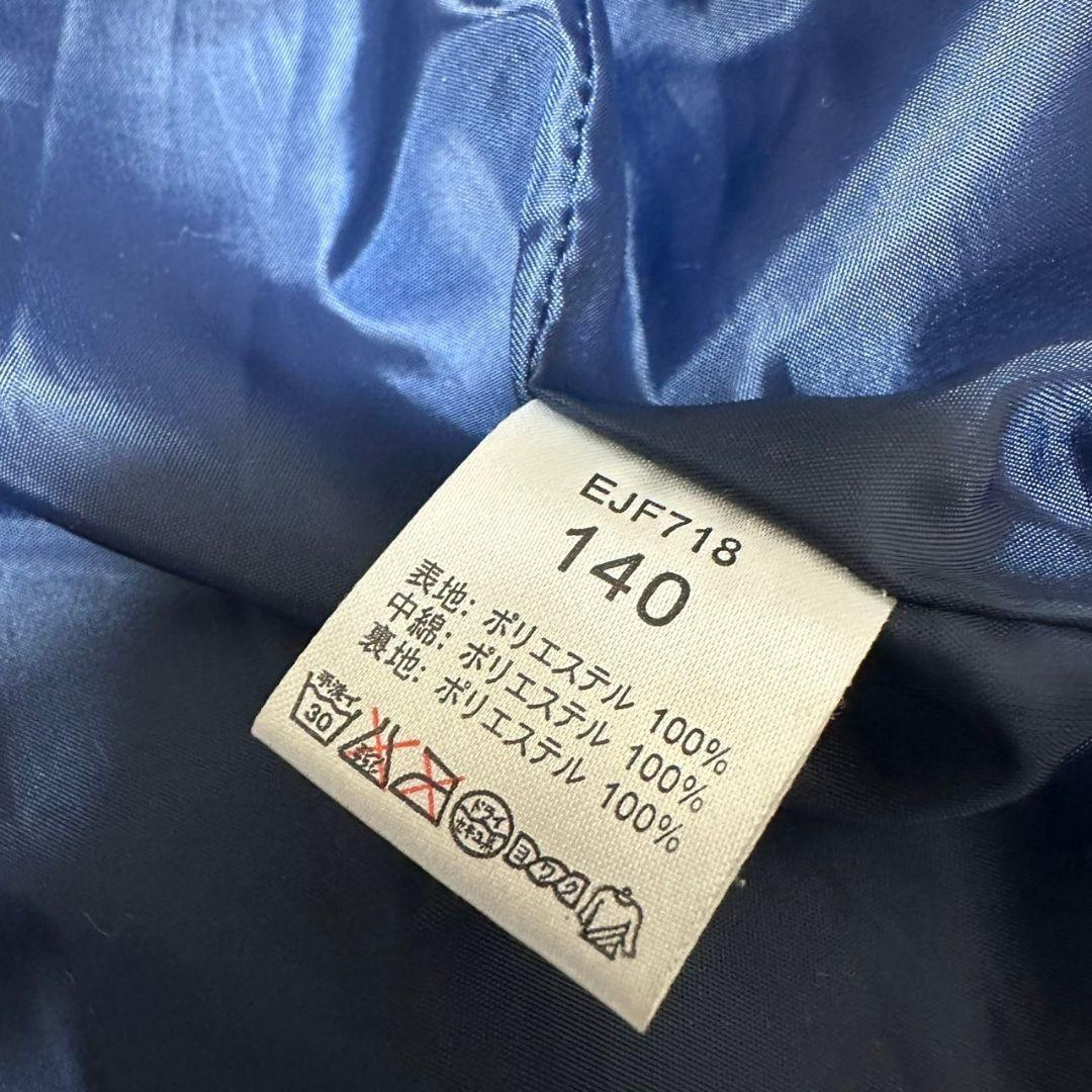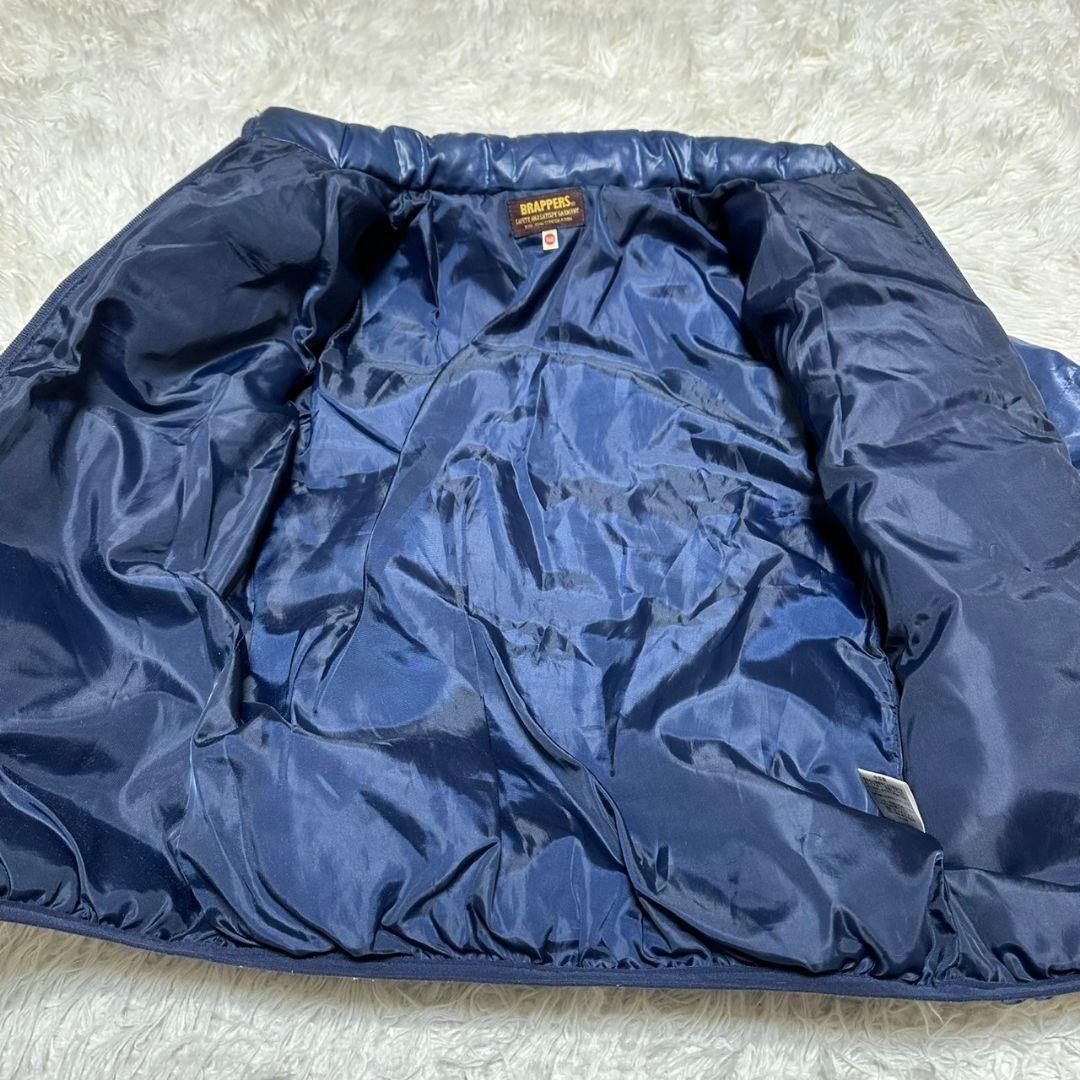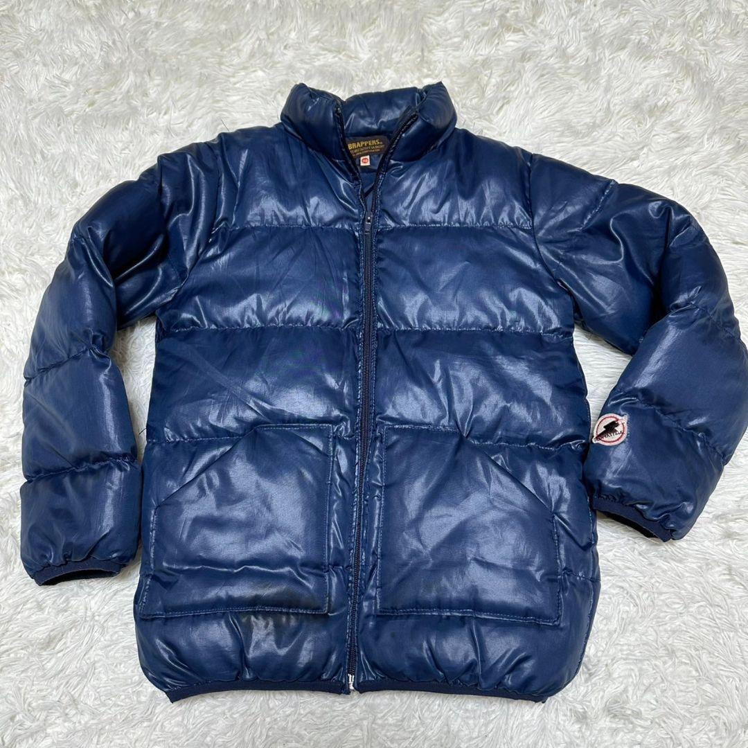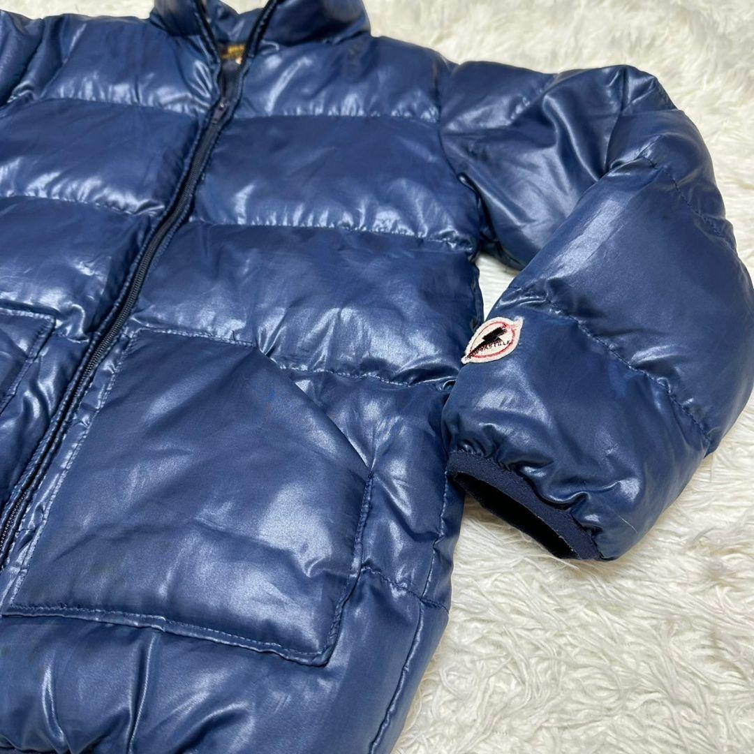 光沢のあるネイビーのダウンジャケット、スタンドカラーと前面ポケット付き。