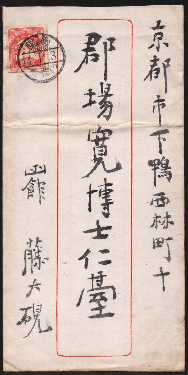 ★ 植物学者郡場寛博士あて封筒 ★ 震災3銭貼函館14.1.3消印 ★25954★