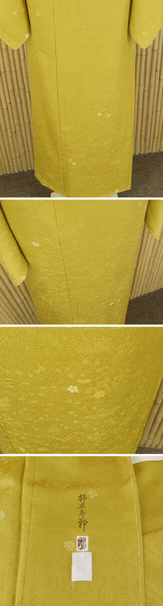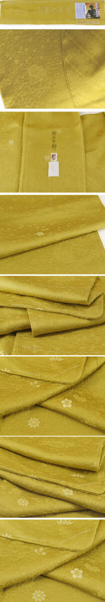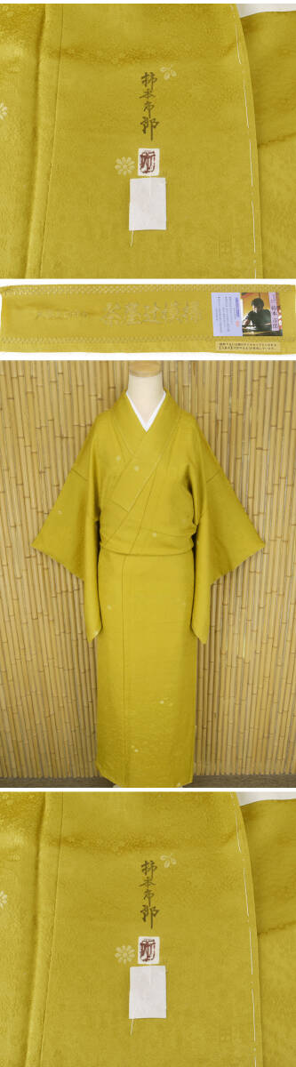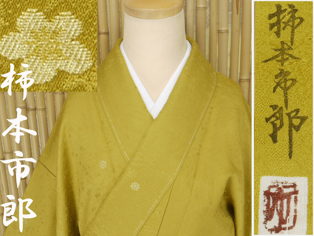 正絹 ●―――――――――――― コメント ――――――――――――― 【加賀友禅の名匠 作家 柿本市郎】絹のダイヤモンド「天蚕糸の輝き」色無地(紋なし)茶屋辻 丹後ちりめん 共八掛地紋入り スーパーガード加工 躾糸付未着用仕立て上がり 手縫い仕立て 今回ご紹介のお品は、加賀友禅作家の柿本市郎氏監修のもと、 加賀五彩からの色彩で染め上げた最高級色無地となっております。 柿本市郎氏という方はとても有名で石川県指定の無形文化財を認定されてます。 現在、加賀友禅作家の中でも間違いなく最高峰の技術とセンスを持つ本加賀を代表する作家です 人間国宝・木村雨山氏に直接師事し… 本加賀友禅といえば、真っ先にお名前のあがる「柿本市郎」氏。 ご存知の通り、その名は本加賀友禅界で一、二を争うほど。 ふんわりと優しく、程よいハリ感のある上質な生地に茶屋辻の地模様が織られております。 上品で綺麗な絹光沢を存分に感じて頂ける無地でも存在感のあるお着物となっております。 ふうわり浮かぶ絹の光沢。しとやかで上品、無地でありながらのこの存在感。 最高級の天蚕糸によって丁寧に織り上げられた極上の絹布は、 思わず頬ずりをしたくなるほどの素晴らしい風合い。 お身体にもよく馴染む天蚕糸は誰の目にも美しく映えるドレープを生み出し、 またいつまでも脱ぎたくなくなるほどの素晴らしい着心地をご堪能頂けます。 絹のダイヤモンド【天蚕糸】を贅沢にもふんだんに用いた、 正に《最高級の色無地》 本加賀友禅の名匠【柿本市郎】作品らしい 格調高い意匠と、極上の着心地を叶えてくれる天蚕糸によって、 最高の贅沢と美しい着姿とを同時に運んでくれる特選品です。 ぜひこの機会にこちらの作品を身に纏って頂き、 お気に入りの帯との素敵なコーディネートと、気品に溢れる着姿を多くのシーンにてお楽しみ下さい。 【加賀友禅の名匠 作家 柿本市郎】 人間国宝である木村雨山と、その弟子である金丸充夫、能川光陽の元で 加賀友禅の技術を学んだ柿本市郎は、加賀友禅作家としての才能を開花させていき、 加賀友禅工芸展や加賀友禅競技会などでたくさんの賞を受賞しました。 石川県無形文化財 加賀友禅技術保存会 会員 加賀友禅作家 昭和12年 金沢市に生まれる。 昭和30年 金丸充夫氏に師事。その間、木村雨山、能川光陽両氏に指導を受ける。 昭和42年 賀友禅作家として独立。 昭和54年 第1回伝統加賀友禅工芸展にて銀賞。 昭和56年 第7回加賀友禅新作競技会にて石川県知事賞。 昭和61年 第8回伝統加賀友禅工芸展にて金賞。 平成2年 (協)加賀染振興協会理事。 平成4年 第14回伝統加賀友禅工芸展にて金賞。 平成5年 第14回加賀友禅新作競技会にて中部通商産業局長賞。 平成6年 石川県指定無形文化財「加賀友禅技術保存会会員」に認定。 躾糸付未着用の綺麗な美品のお品でございます。 現物は画像以上に色合い・生地共に素晴らしいものですので、この機会に是非ともどうぞ! 格安でお安く出品致します。即決は送料無料となっております。是非この機会にいかがでしょうか。 |