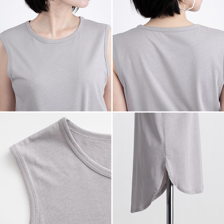 ・綿とレーヨンを混紡した柔らかな肌触りのカットソーを使用したノースリーブTシャツ