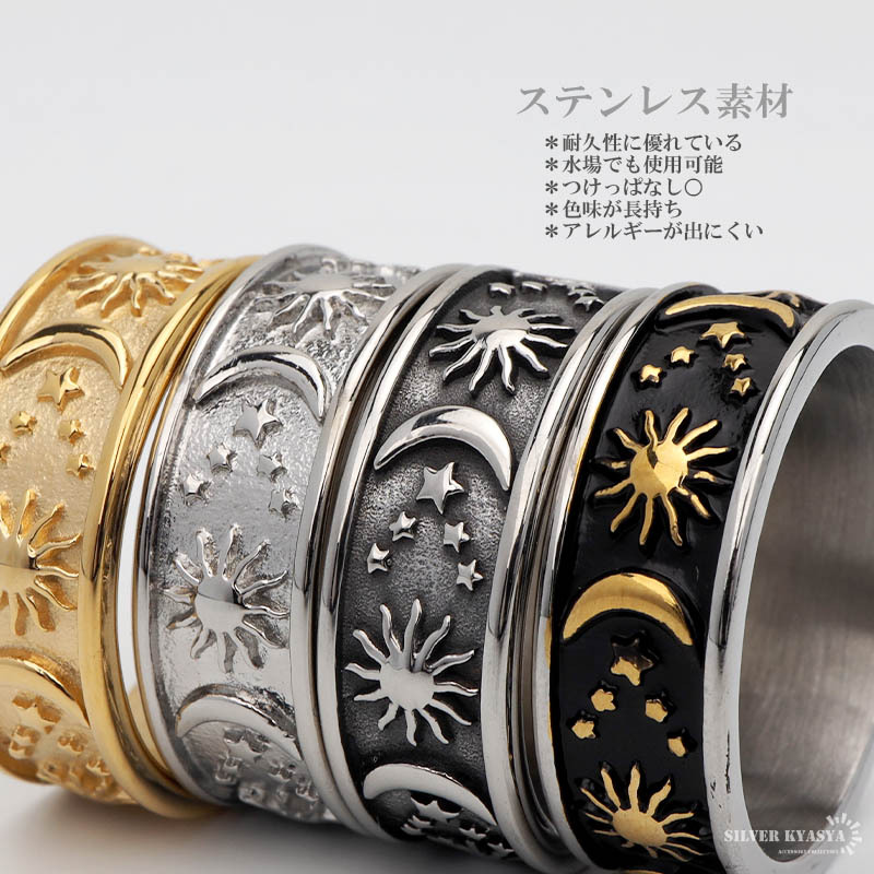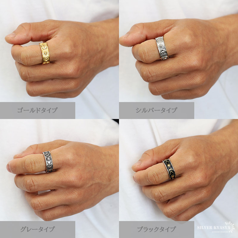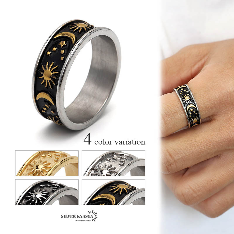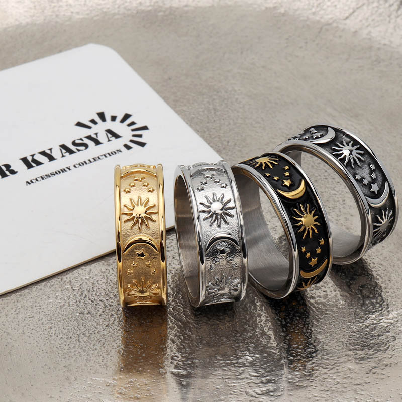 朝と夜をモチーフにしたリング。魅惑的な浮き彫り仕様。全4カラー。ユニークなデザインで指元のアクセントにおすすめです。