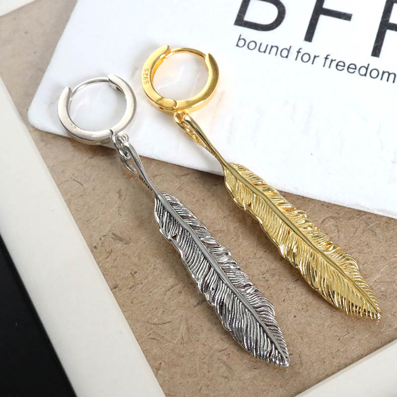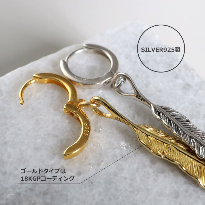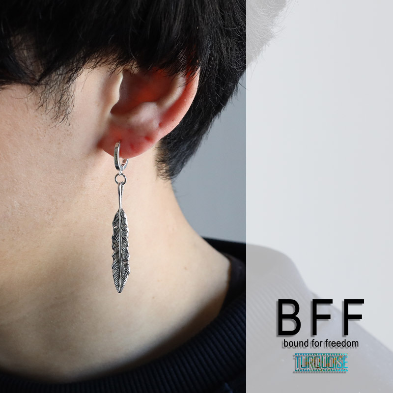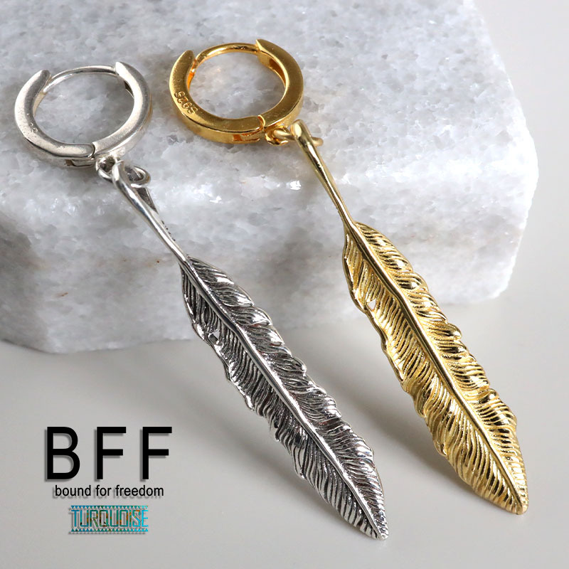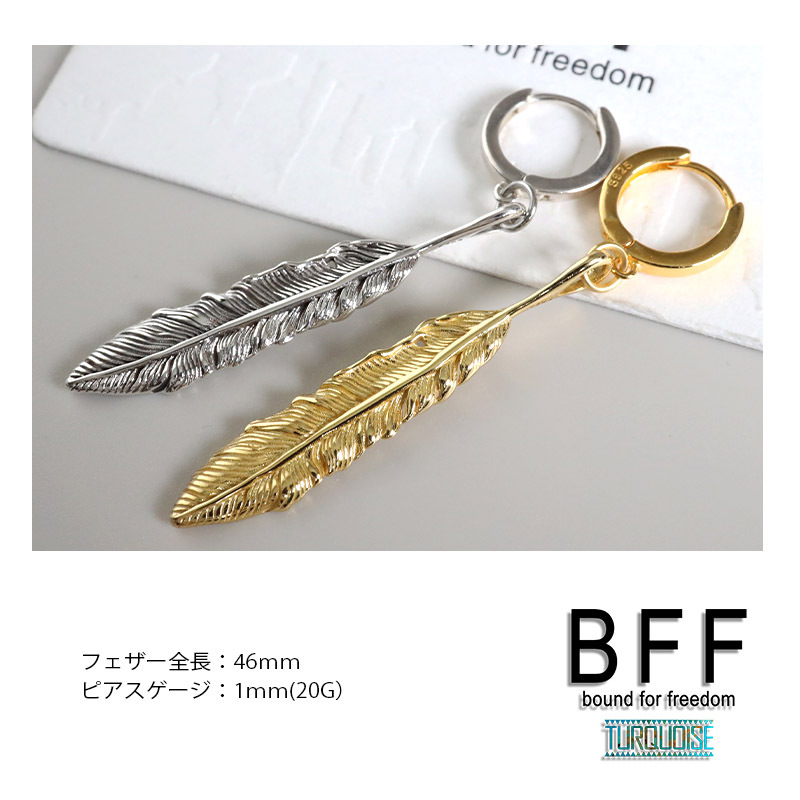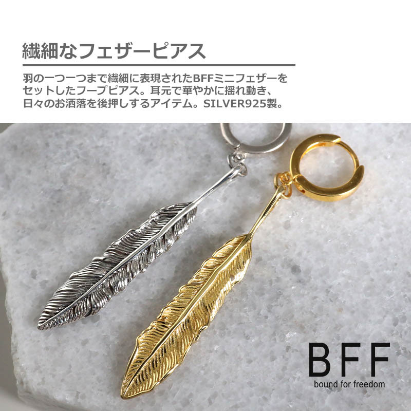 繊細な作り込みながらも躍動感のあるデザインが特徴的なBFFフェザーをセットしたフープピアス。耳元で揺れ動き注目を誘うアイテムです。ゴールド・シルバーの2カラー。