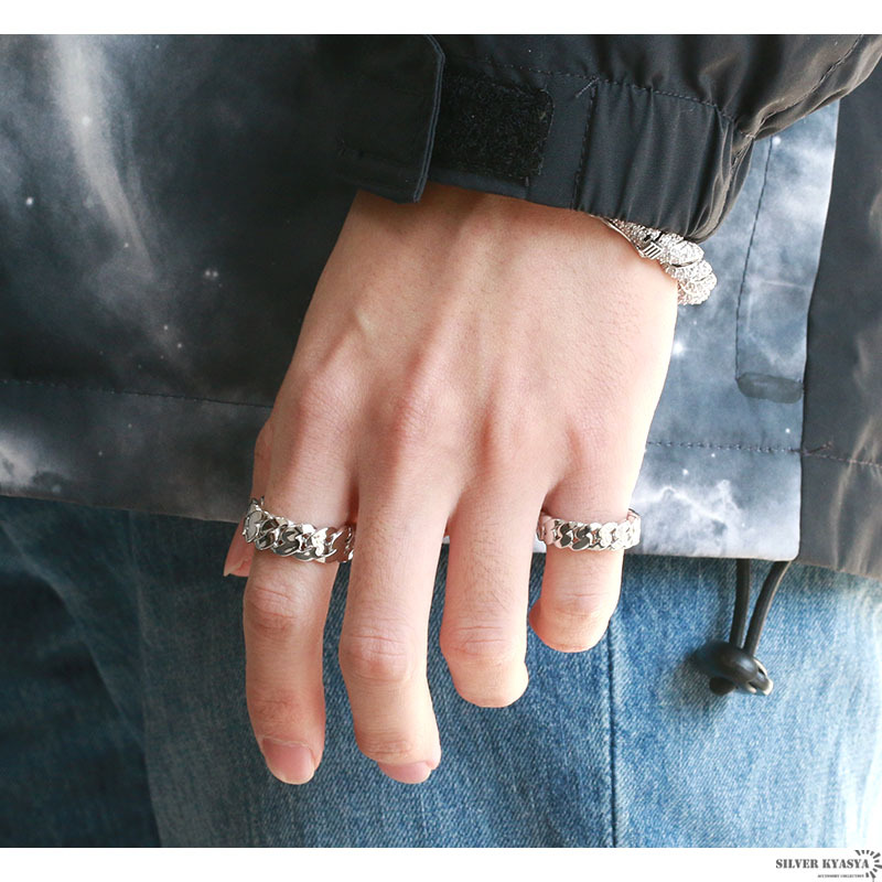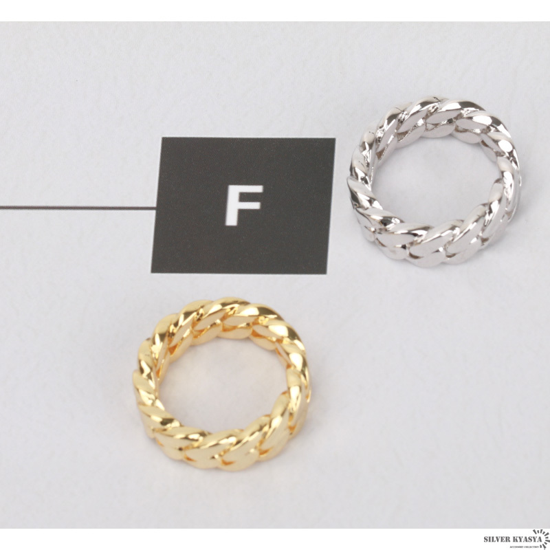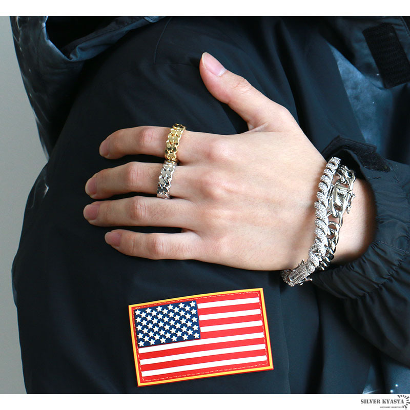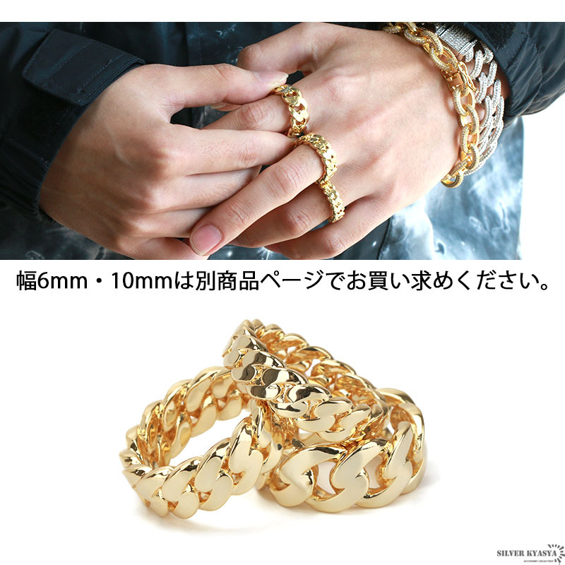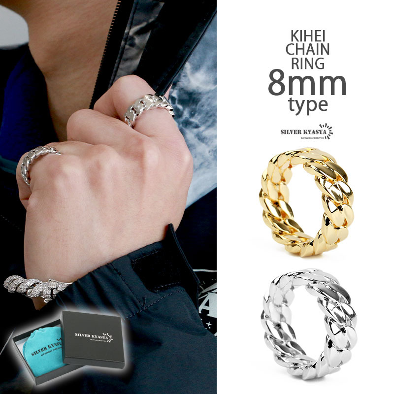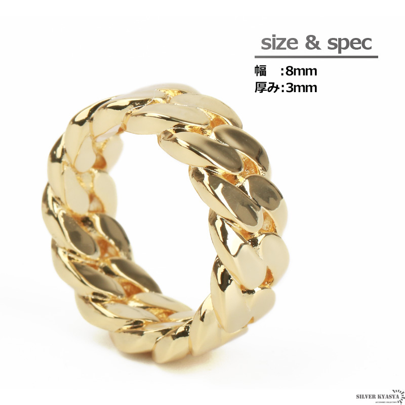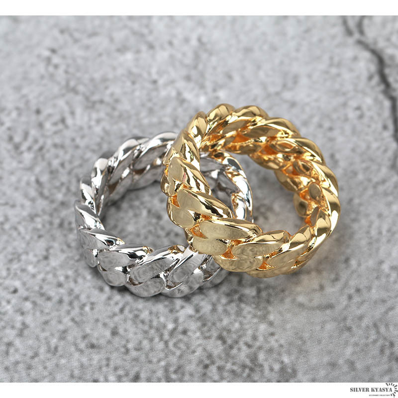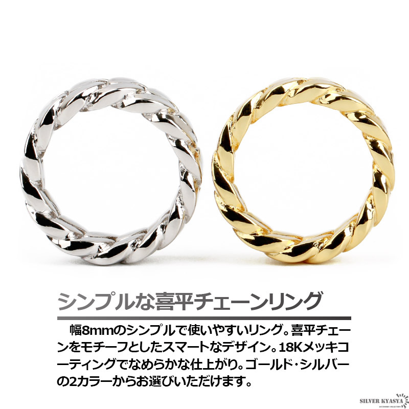 幅8mmのシンプルで使いやすいリング。喜平チェーンをモチーフとしたスマートなデザイン。18Kメッキコーティングでなめらかな仕上がり。ゴールド・シルバーの2カラーからお選びいただけます。
