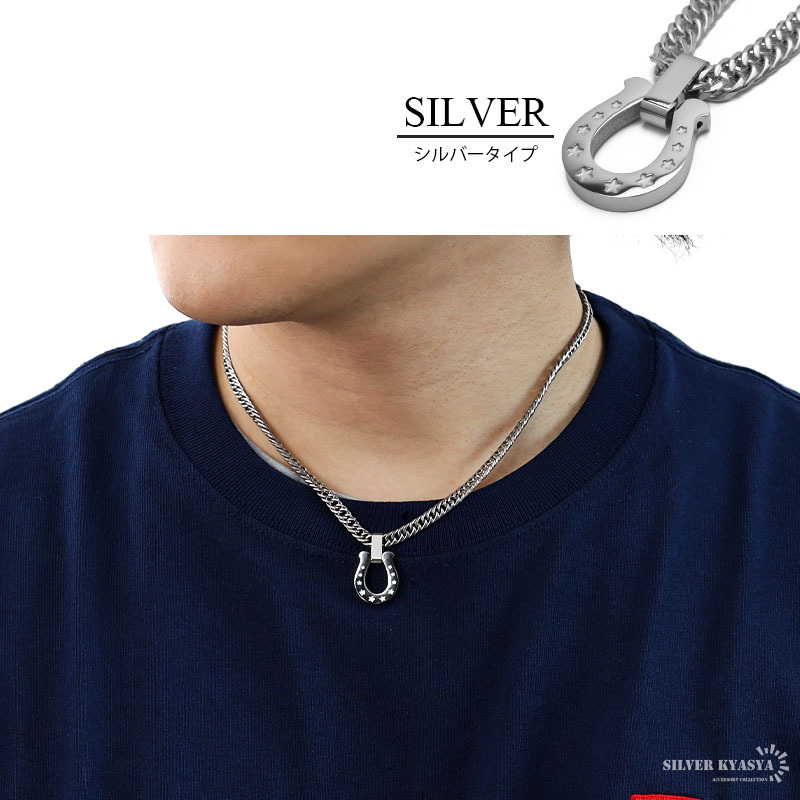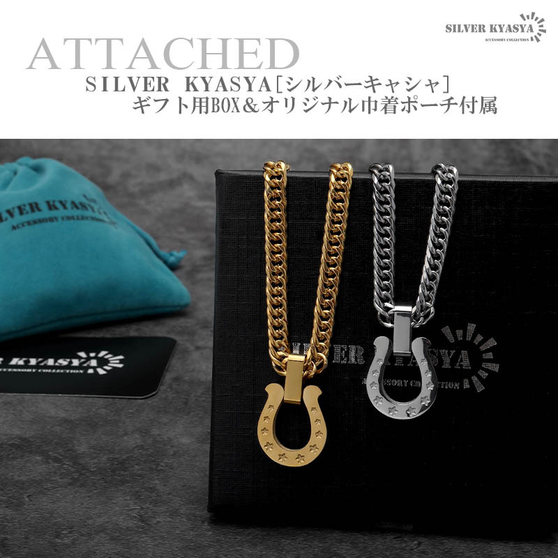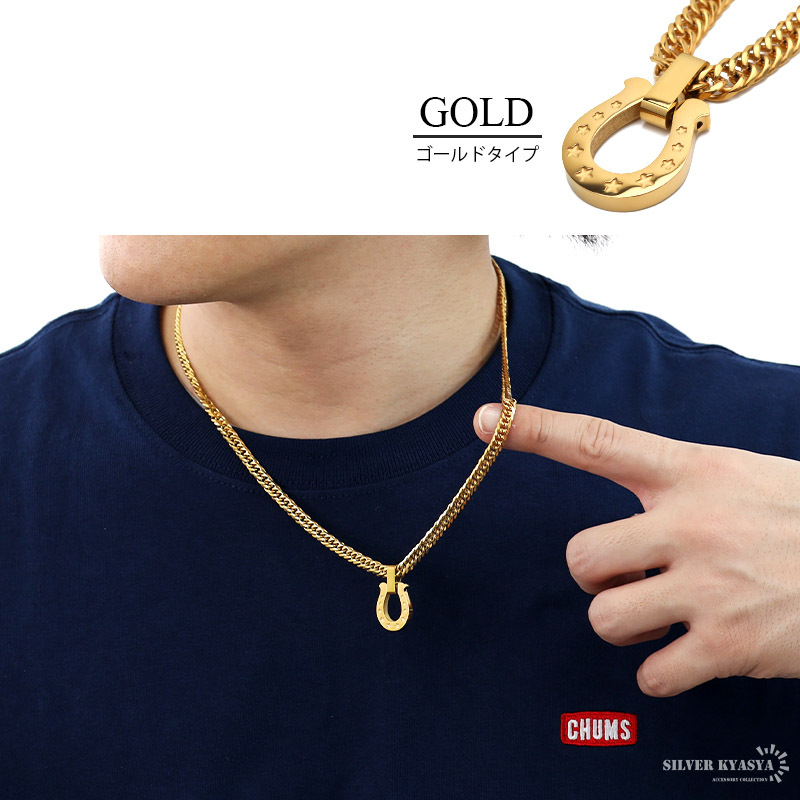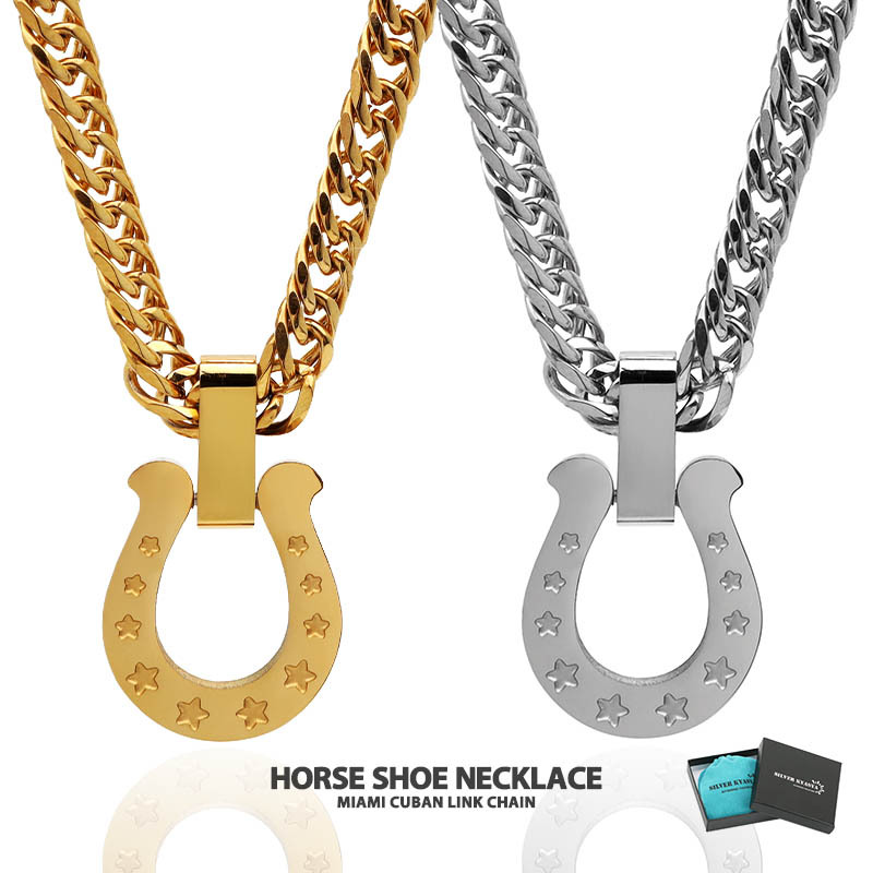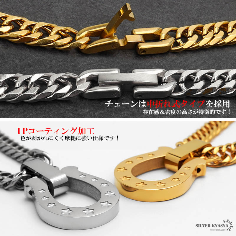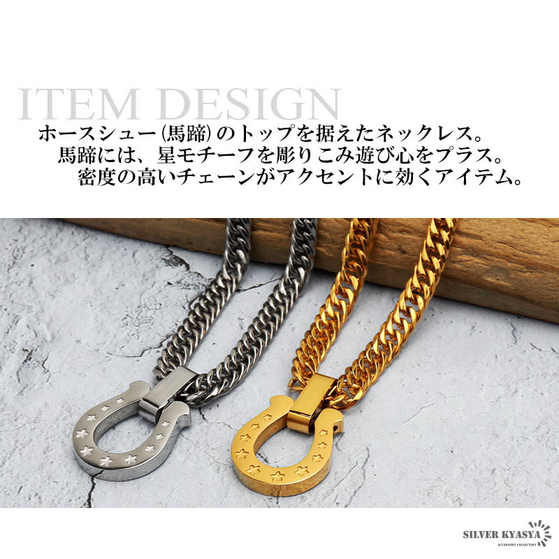 定番人気のホースシュー(馬蹄)ネックレス。チェーンには、密度が高く存在感のあるダブル喜平を使用。ゴールドとシルバーの2カラー展開。