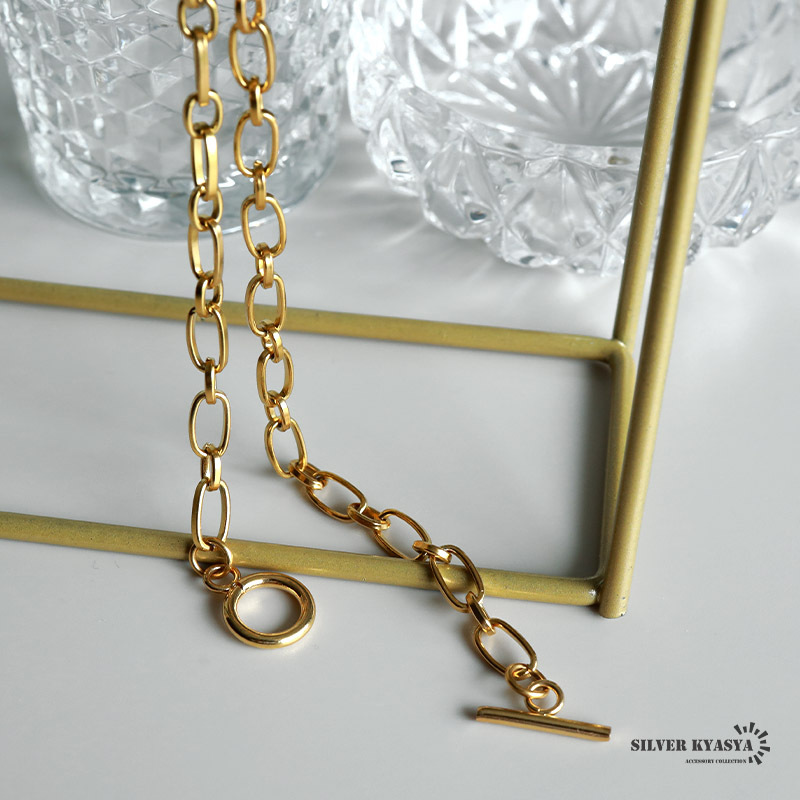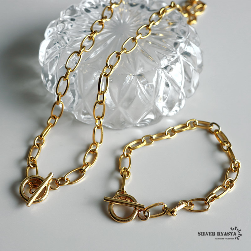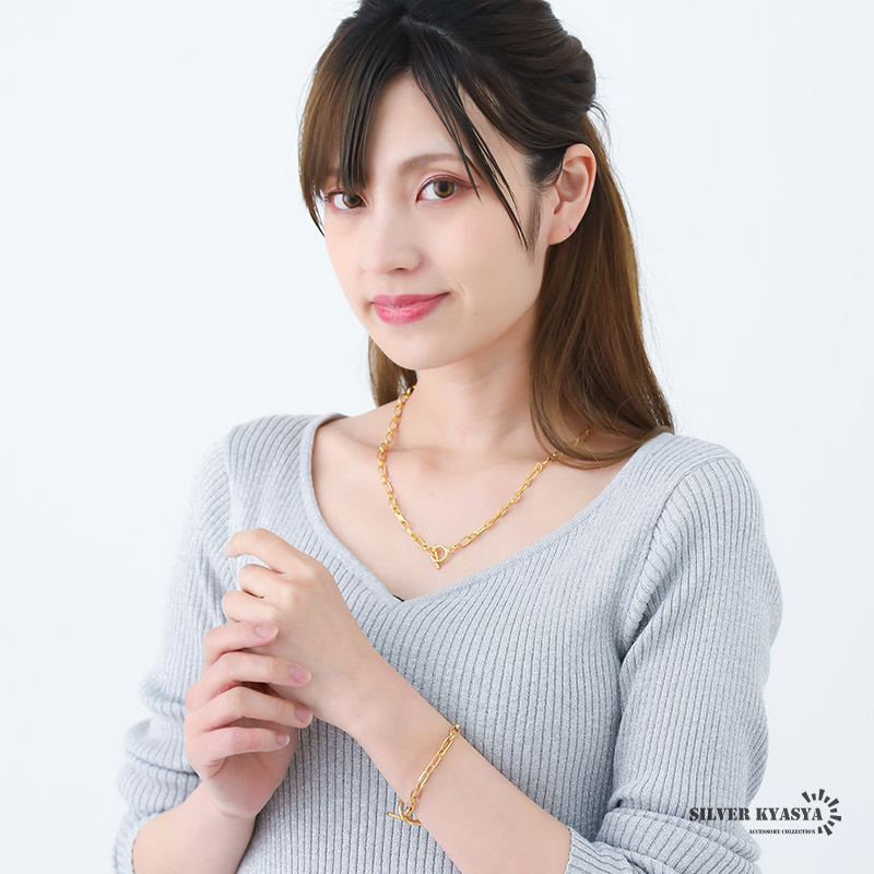 大小のコマを連ねたこなれ感あるフィガロチェーンのアイテム。留め具は人気のマンテルタイプです。ブレスレットとネックレスのセットで統一感あるスタイルを楽しめます。