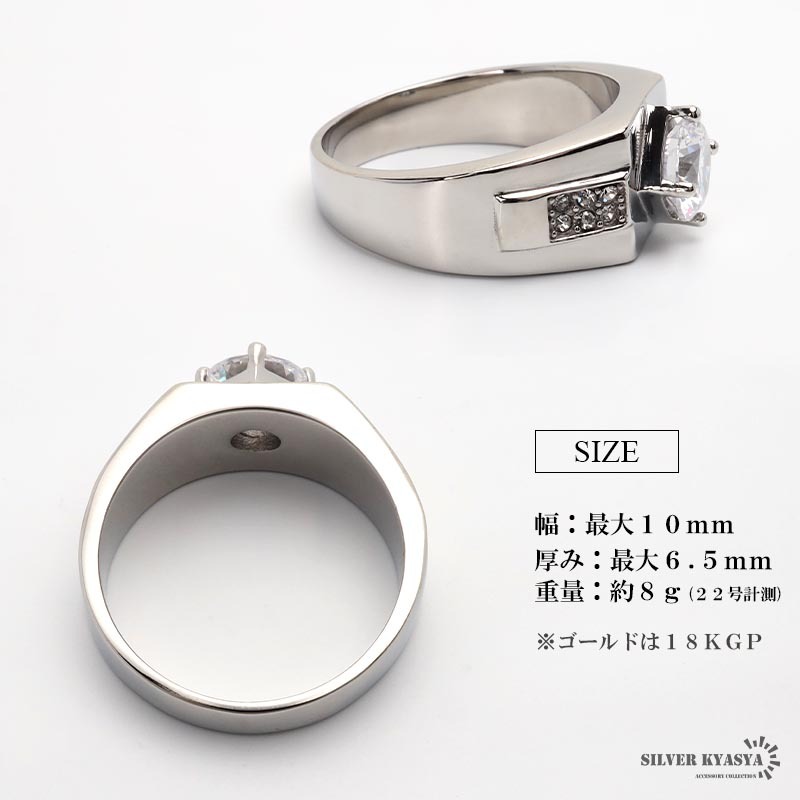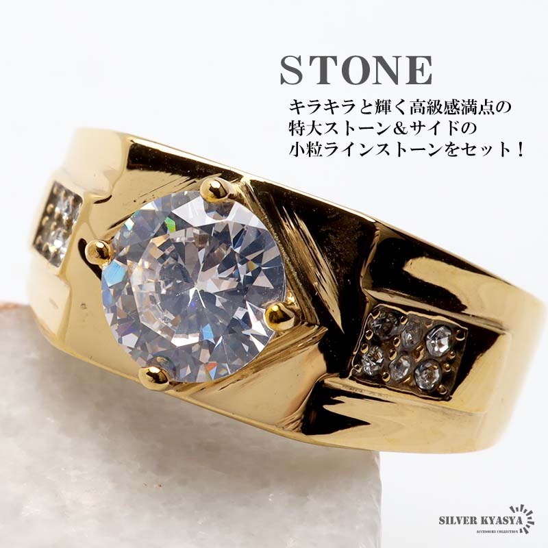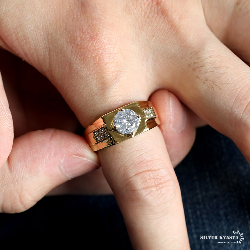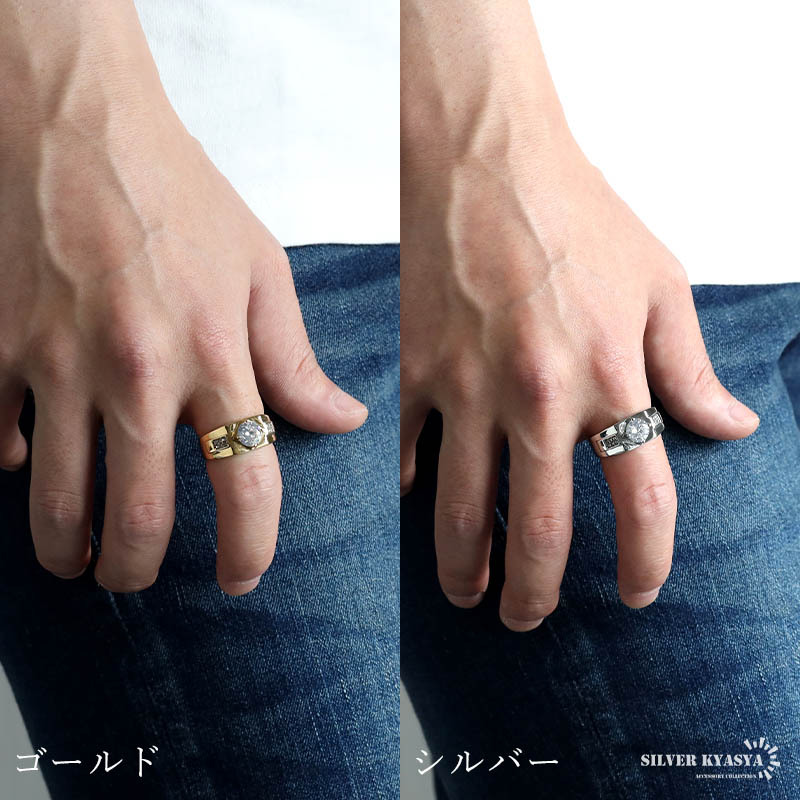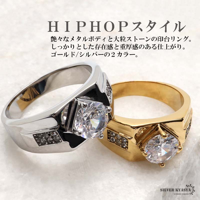 艶々なメタルボディと大粒ストーンの印台リング。しっかりとした存在感と重厚感のある仕上がり。ゴールド/シルバーの2カラー。