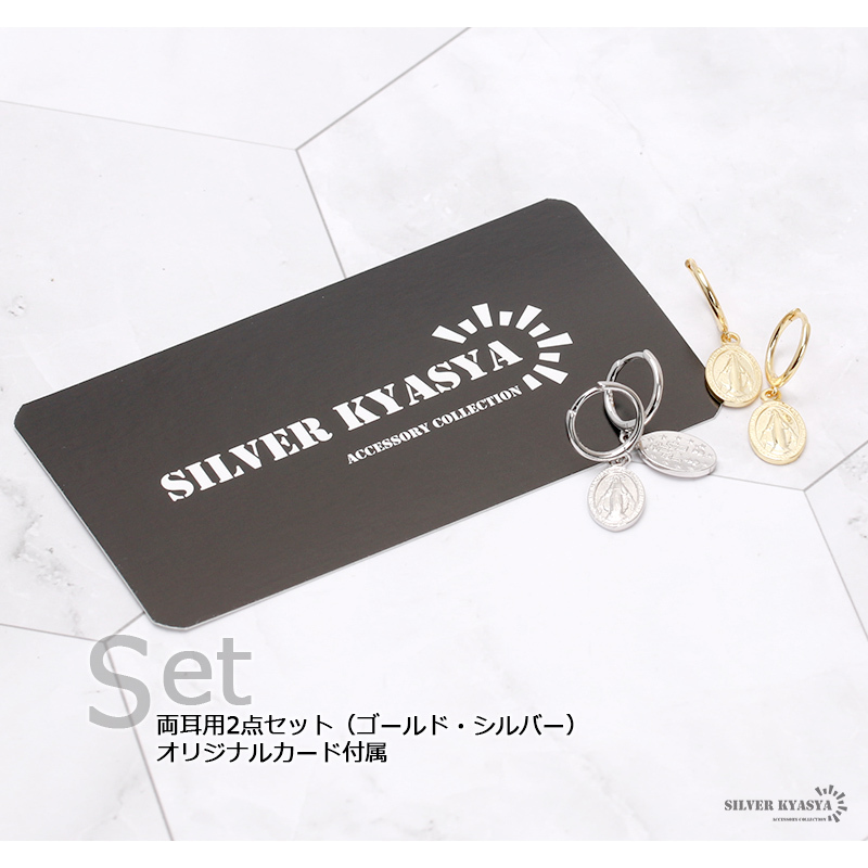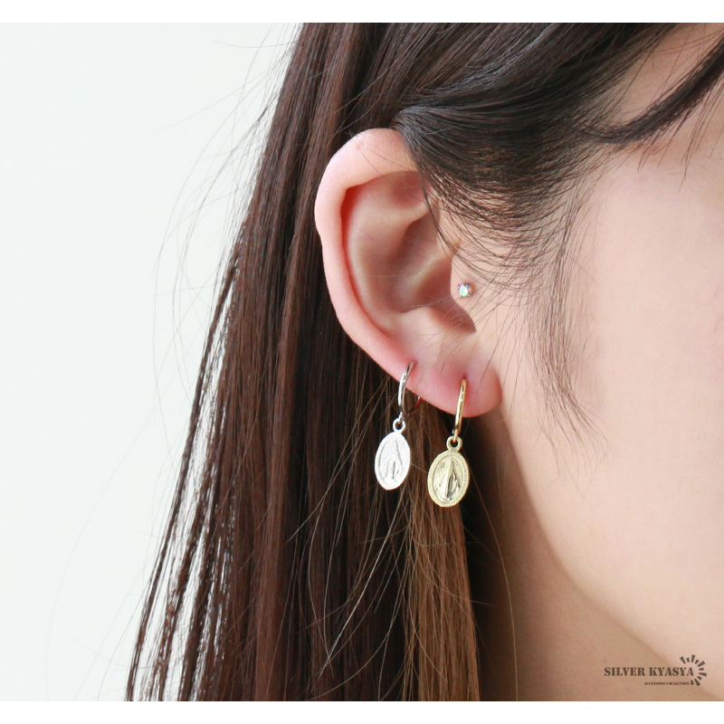 揺れるメダイと聖母マリアがデザインされたピアスです。