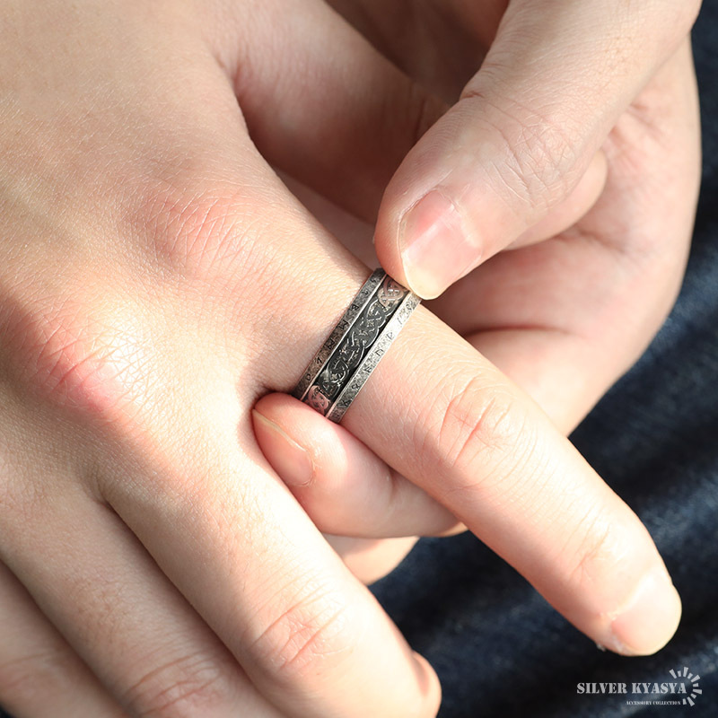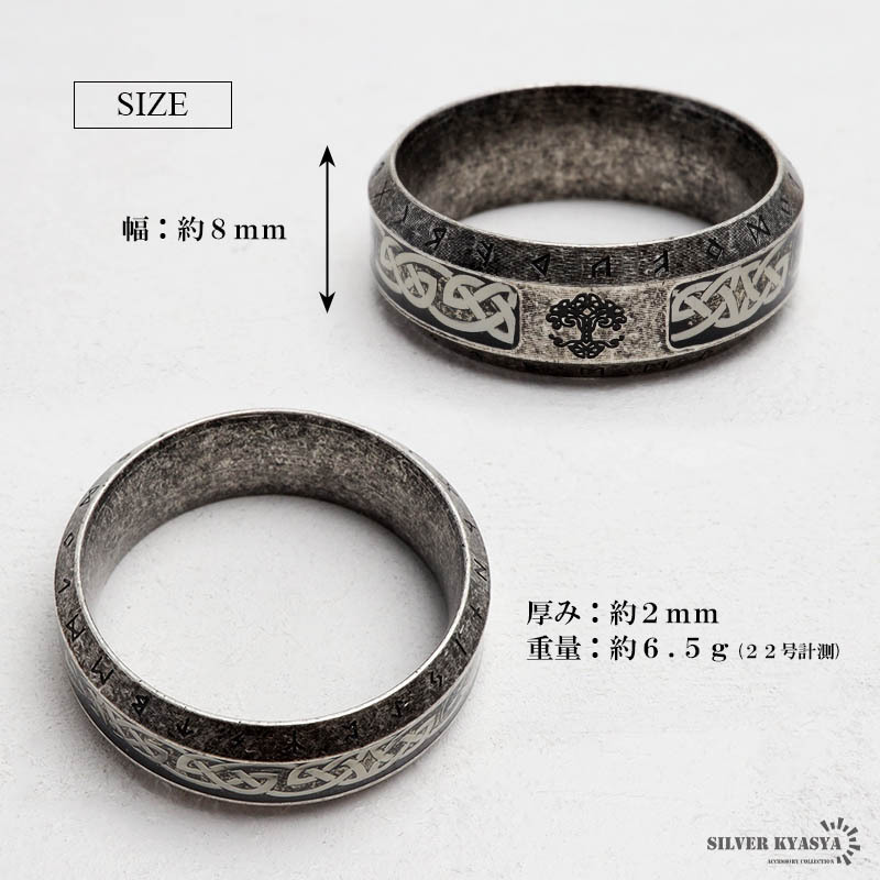 | 商品概要 | ■幻想的なケルト文様 ケルト文様とケルト文字の組み合わせで幻想的な雰囲気のあるリング。アンティークなシルバーカラーが映えます。 ■ステンレス素材を使用 金属部分は頑丈なことで知られるステンレス素材を採用。耐久性はもちろん耐水性も高く水場での着用も可能。金属アレルギーも出にくいとされている金属です。 |
