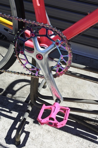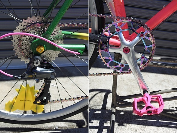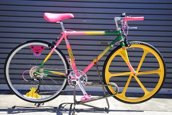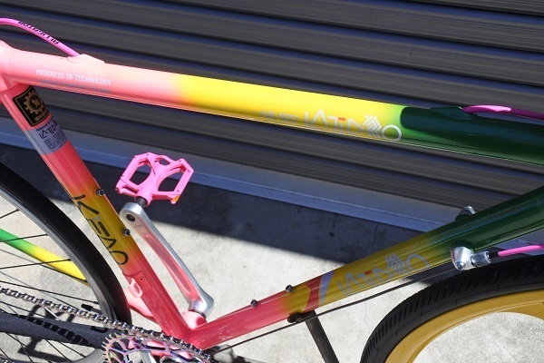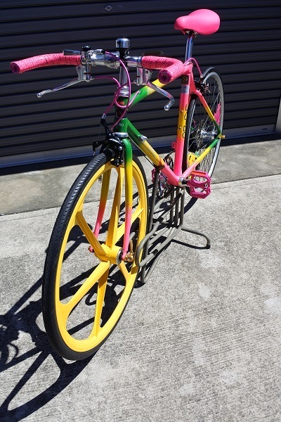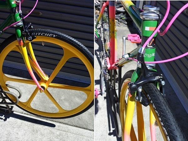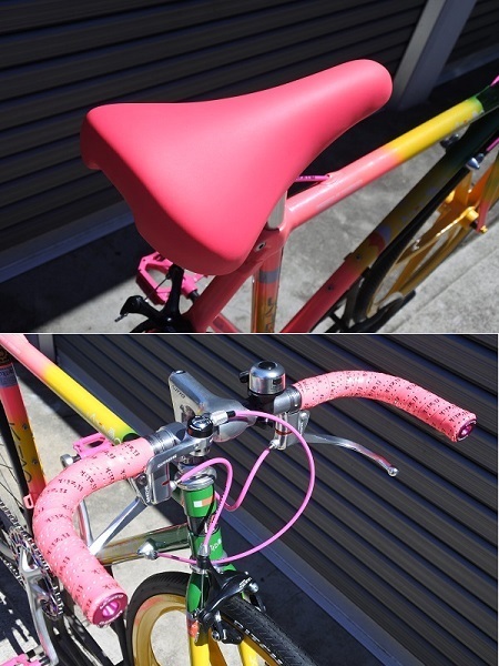 いかにも90年代らしいネオンカラーペイントに合わせてヴィスコンティの91年製蛍光ピンクの新品サドルやおそらく同年代頃のフィジークのバーテープを探して装着しました!