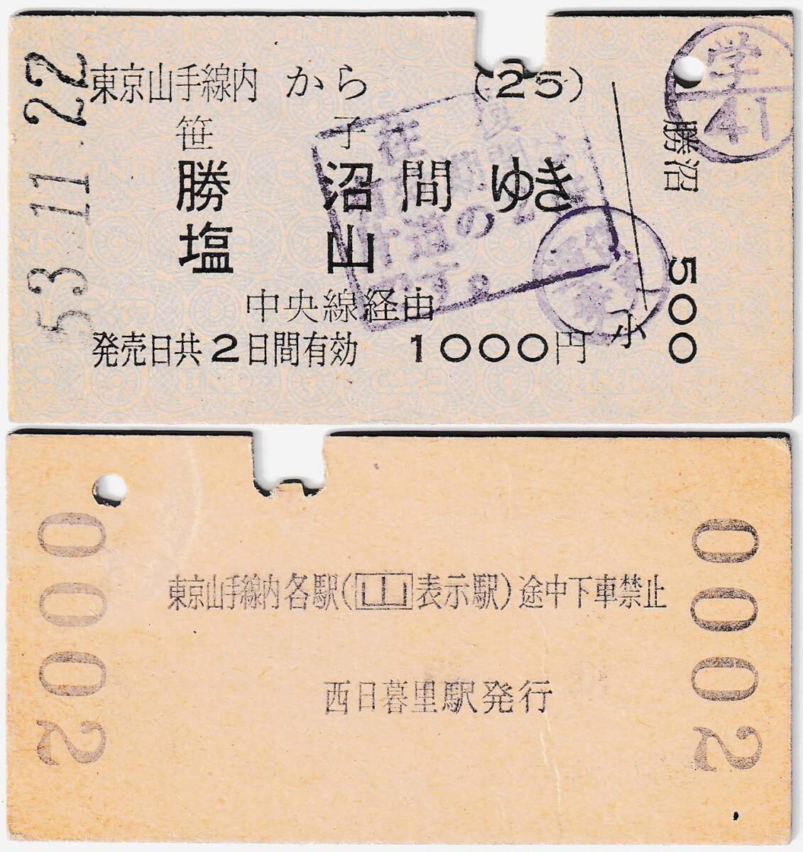 国鉄 コード付き乗車券  25 昭和53年 東京山手線内 → 笹子・勝沼・塩山間ゆき