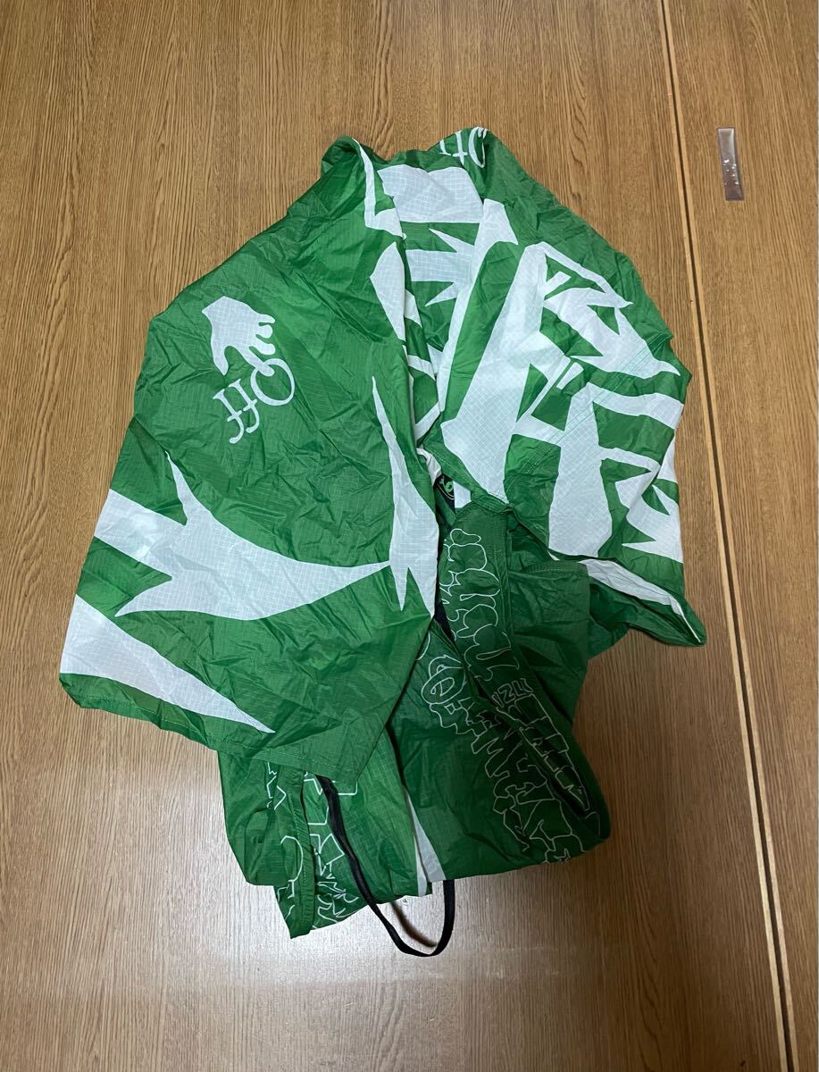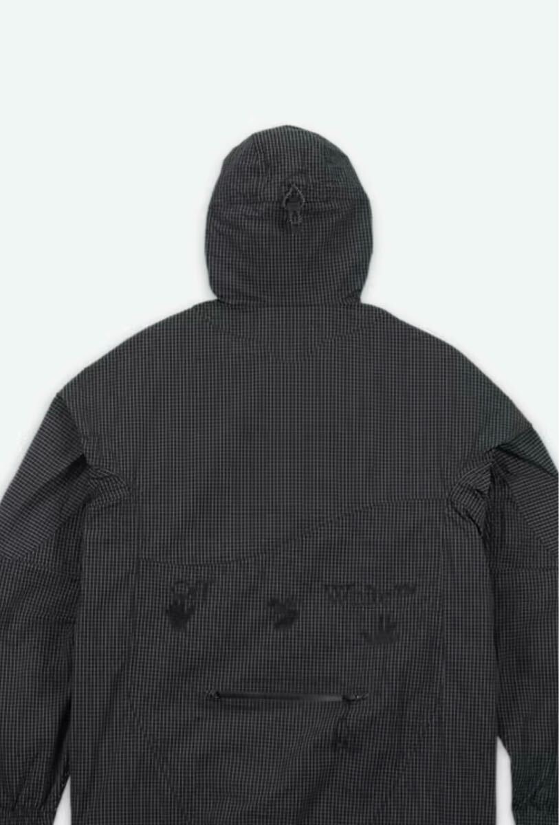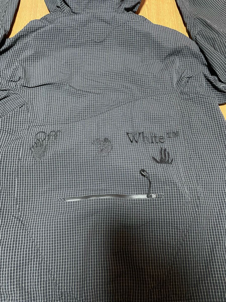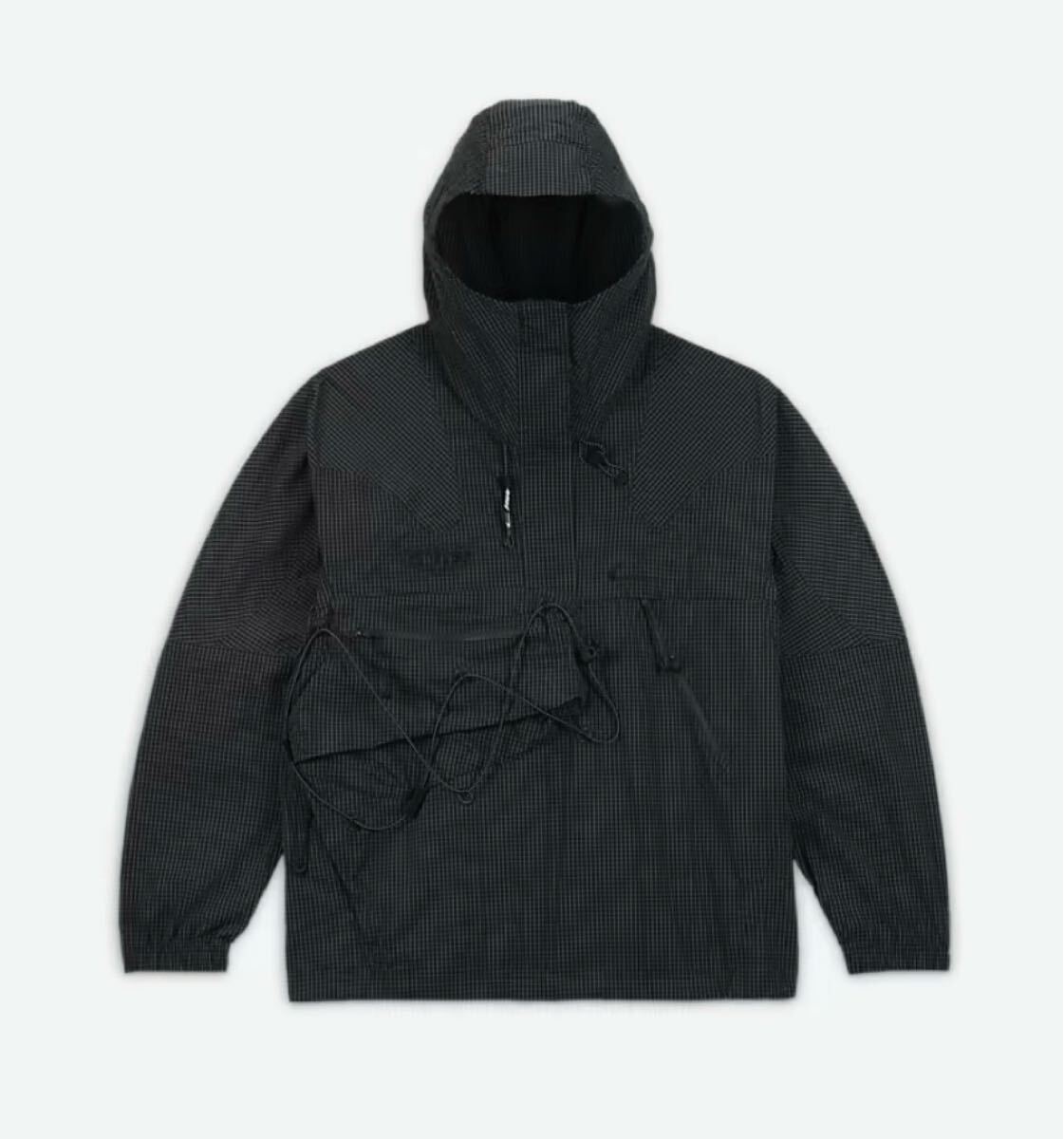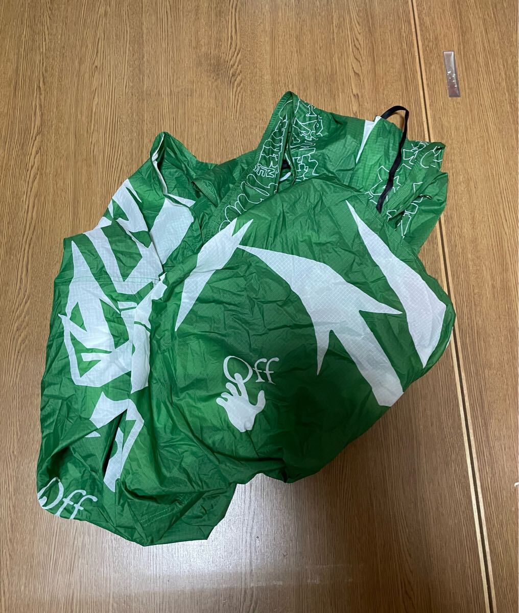 張りがあり、耐久性に優れ、撥水加工を施したナイキxOff-Whiteのアノラック。取り付け可能なパラシュートが付属しています。その理由は、思いもよらないでしょう。パラシュートがあれば、突然思い立った筋力トレーニングのために公園に広げたり、万が一の事態に着地を和らげたりできます。前面のポケットバッグの特徴的なケージコードは、Off-White ダンクやAF1