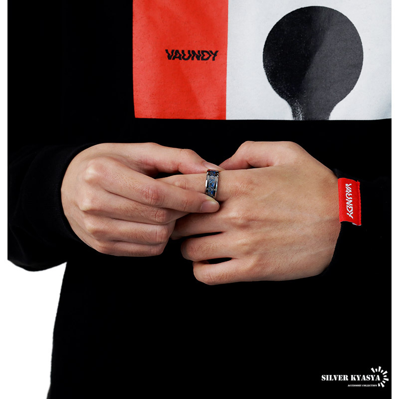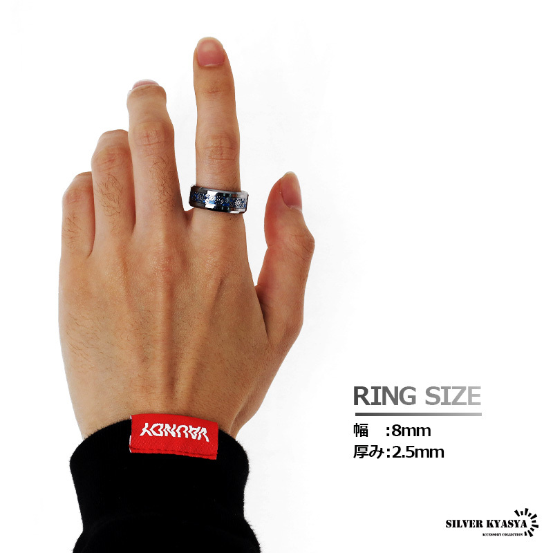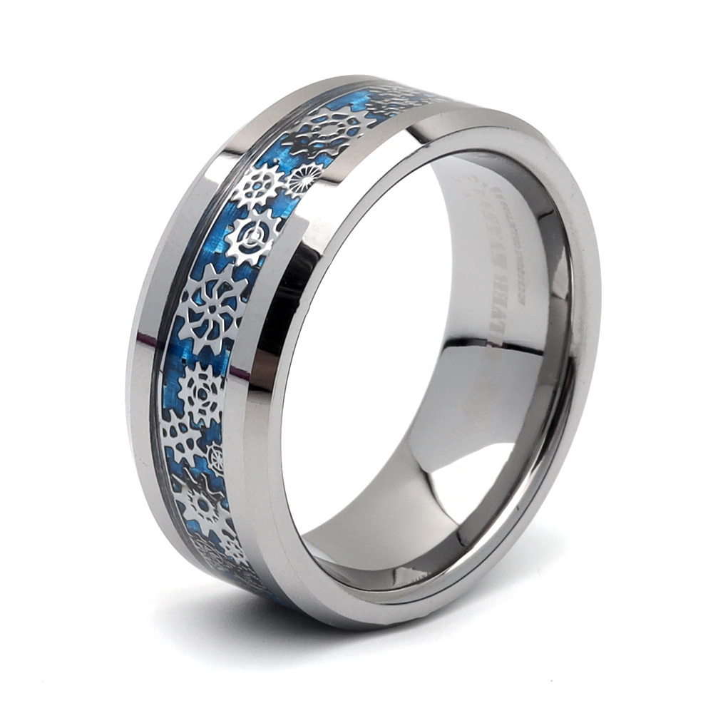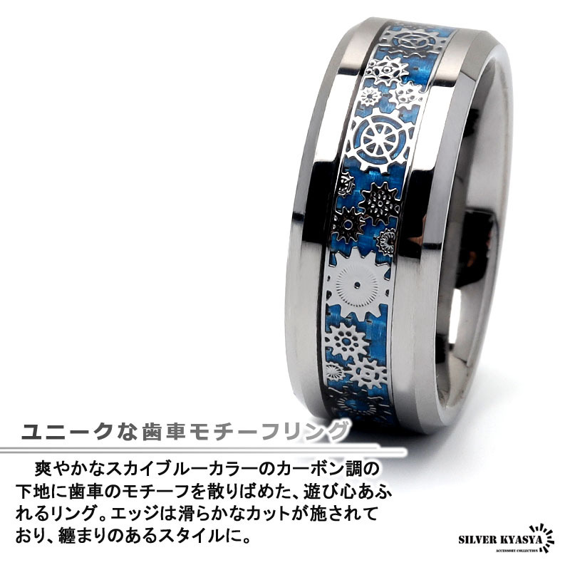 爽やかなスカイブルーカラーのカーボン調の下地に歯車のモチーフを散りばめた、遊び心あふれるリング。エッジは滑らかなカットが施されており、纏まりのあるスタイルに。