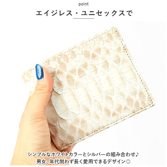 | 商品説明 | ・・ふっくら滑らかな蛇革を使用したZOO ブリーチパイソン財布(2つ折り財布)が発売♪ ・【ダイヤモンドパイソン】 ・世界最長の蛇「ダイヤモンドパイソン」の革生地を採用。ダイヤ型のような斑紋、模様が特徴的。 ・革質は滑らかながらも、他の他種の蛇革と比べ丈夫で鱗が剥がれ落ちにくいのも嬉しいポイント。他の皮革商品と同様経年変化も楽しめるアイテム◎ ・【ヌメ革使用】 ・インナーにはヌメ革を使用。内部まで品質にこだわり温かみのある仕上がりに。 ・【収納力抜群】 ・カードポケットを複数搭載しており、普段使うポイントカードやクレジットカード、診察券もひとまとめに♪ ・お札入れは2つ付いており、領収書やレシートなども分けて収納可能。 ・小銭入れは折りマチ構造で見た目以上に入り、現金派の方もキャッシュレス派の方も満足できる作り。 ・【日本製】 ・安心と信頼のmade in Japan。 ・【エイジレス・ユニセックスで】 ・シンプルなホワイトカラーとシルバーの組み合わせ♪男女、年代問わず長く愛用できるデザイン◎ ・【大切な方への贈り物に】 ・縁起物としても有名な白蛇革のお財布。化粧箱入りで大切な方への贈り物にも最適☆ ・【ポケット仕様】 ・カード入れ×4、フリーポケット×1、小銭入れ×1、お札入れ×2 |