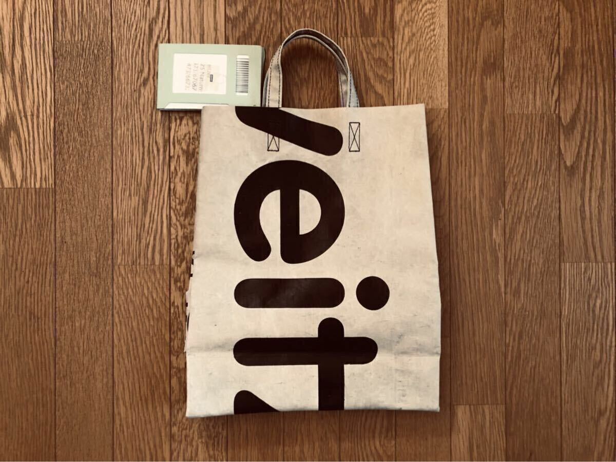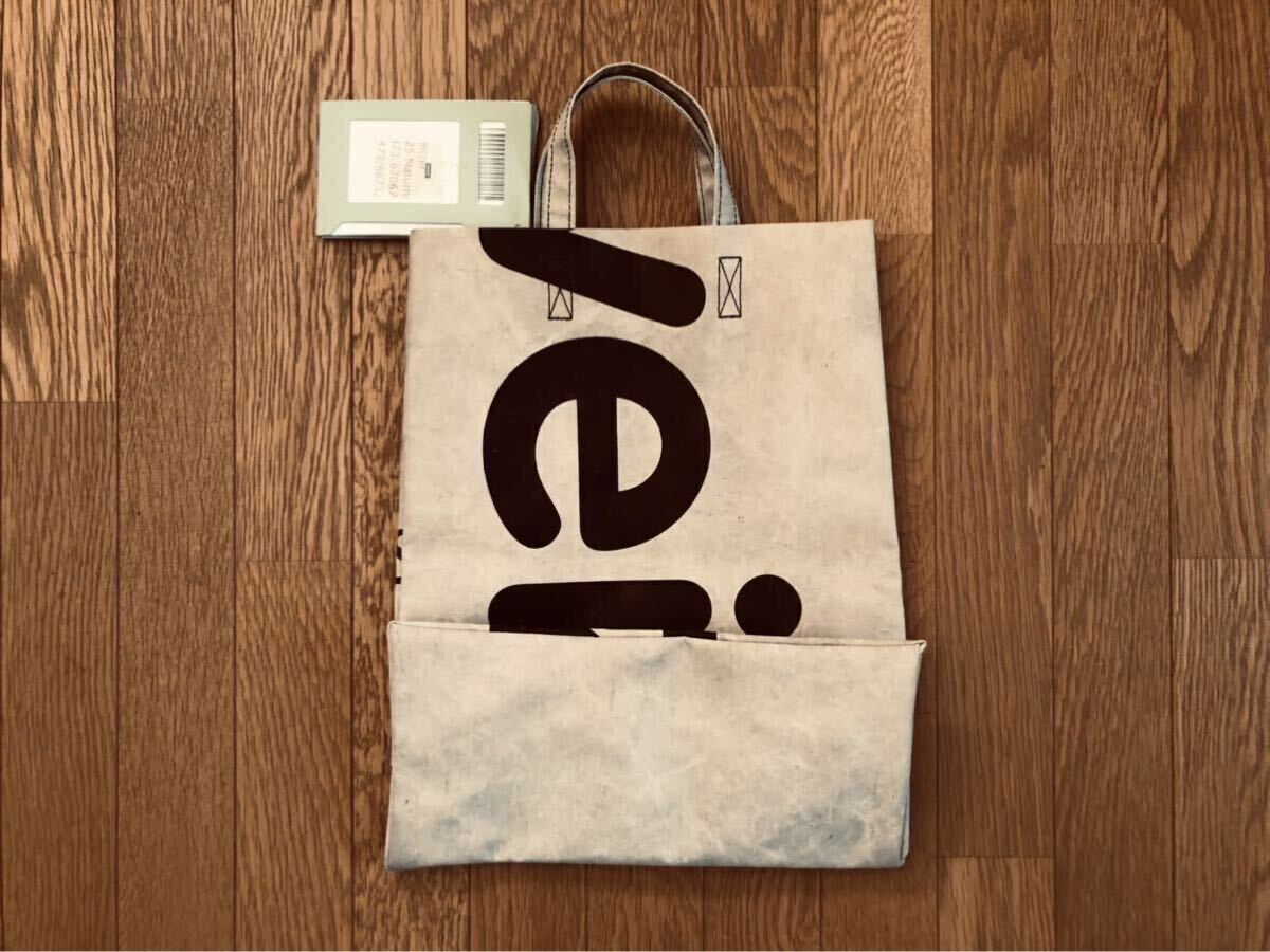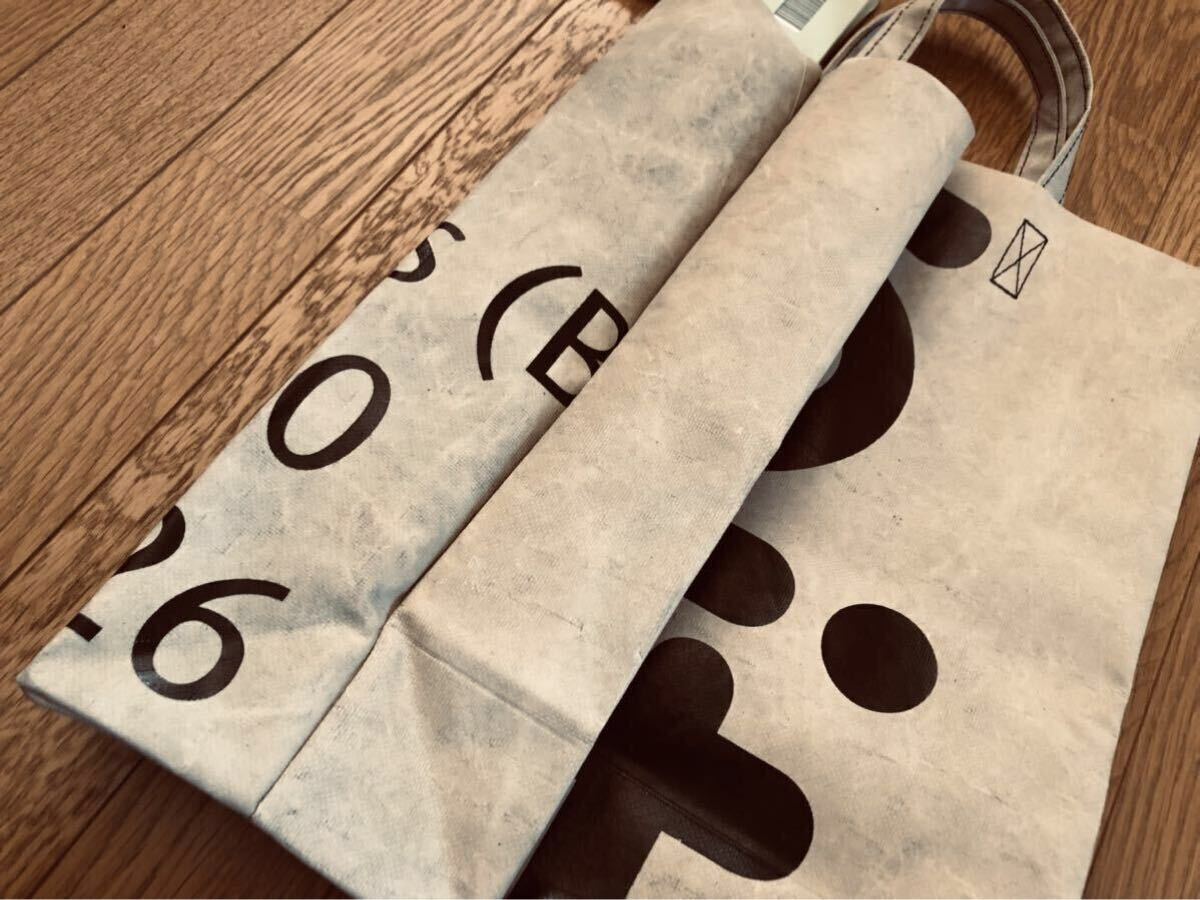 小さな文字が側面までビッシリとプリントされた前面に対して、背面には大きな文字がドンと縦に入っており、どちら側で持っていただいても楽しめるかと思います。