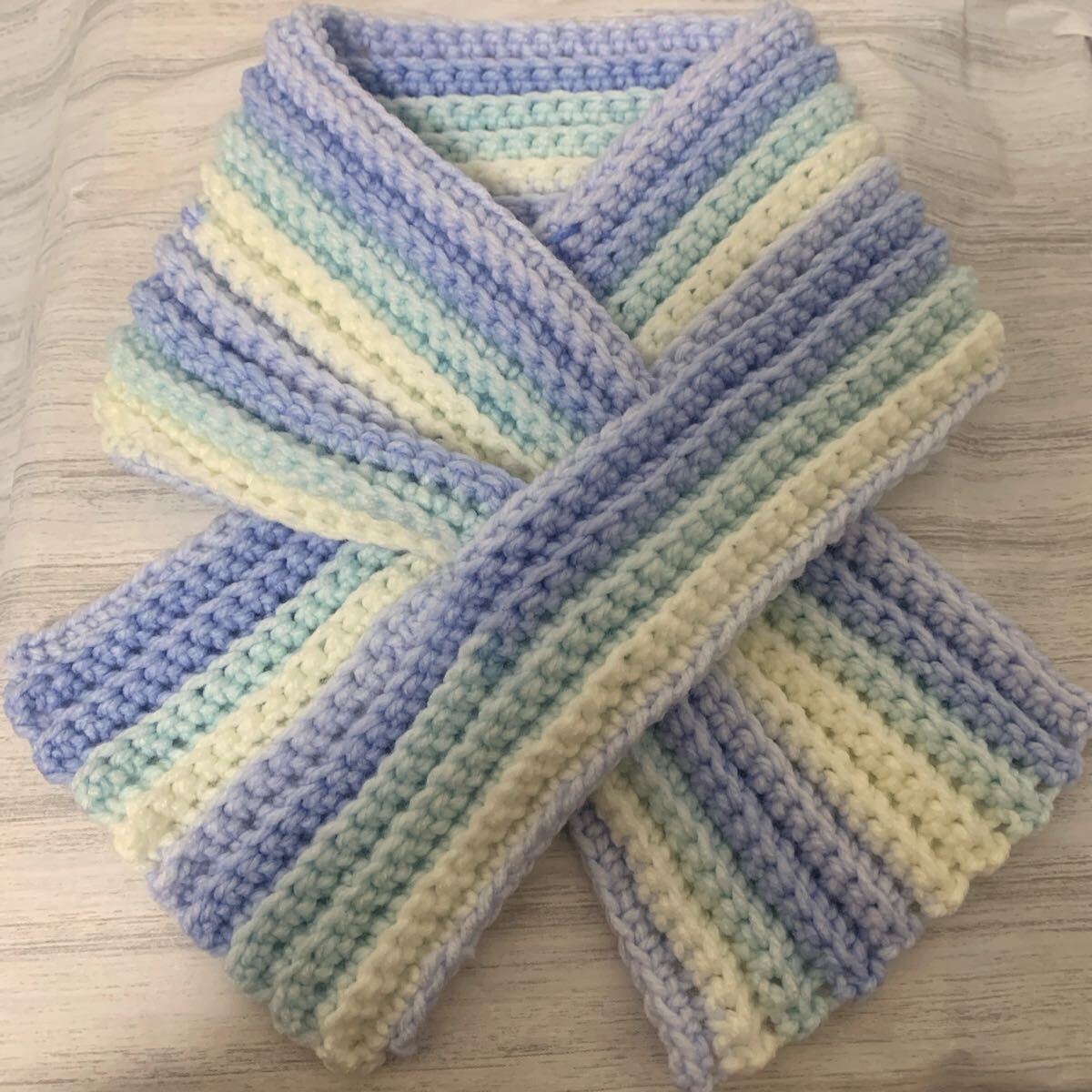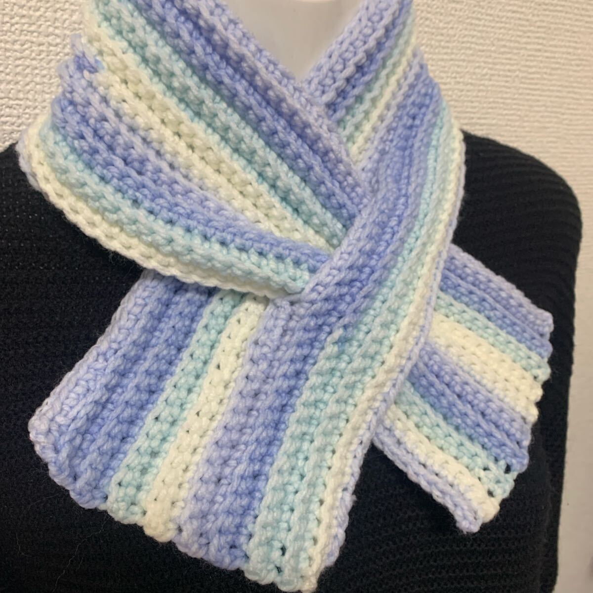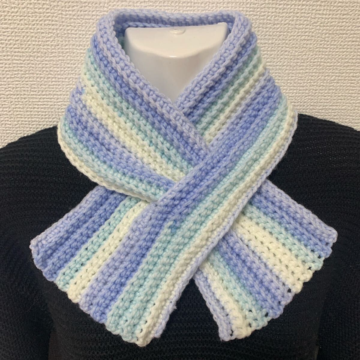 冬 秋 秋冬 梅雨 雨 防寒 マフラー 手編み 編み物 かぎ針編み 手作り ふわふわ もこもこ デート ショート リボン もこもこ ふわふわ 簡単 楽ちん ブルー 青 水色 ホワイト 白 寒色 段染め グラデーション 淡色 くすみ パステル 夢 夢可愛い メルヘン オーシャン 海 マーメイド 雨 梅雨