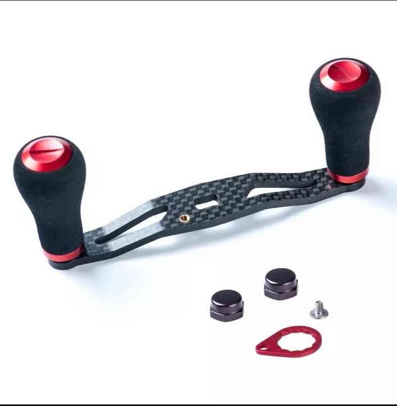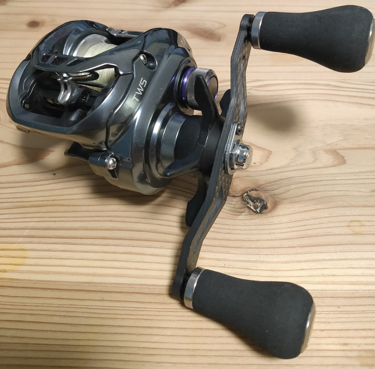 サンプルとして2枚目にハンドル(105mm×シルバー)の装着例を載せておきます。(ナットは元のリールのものを使用しています)