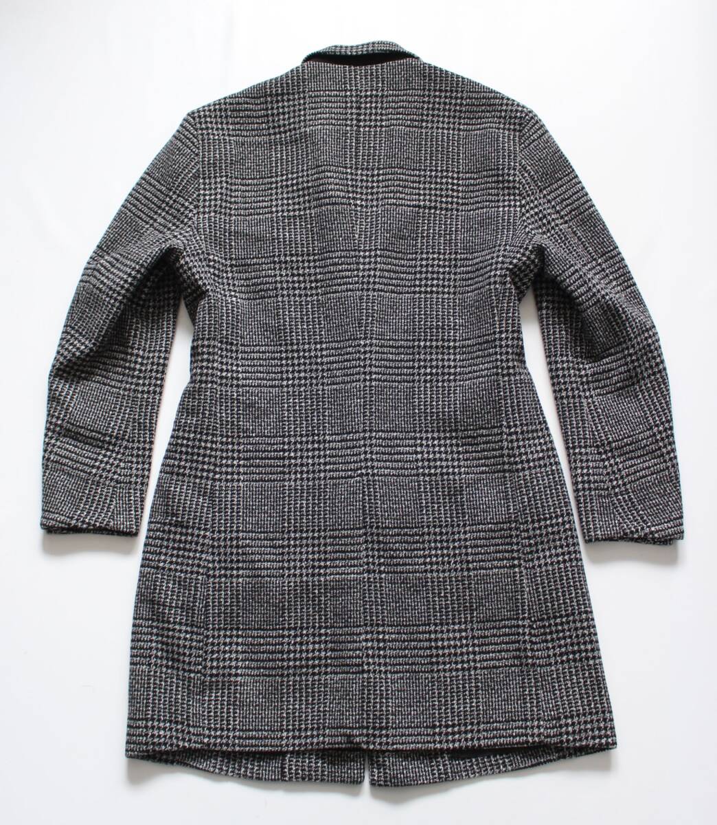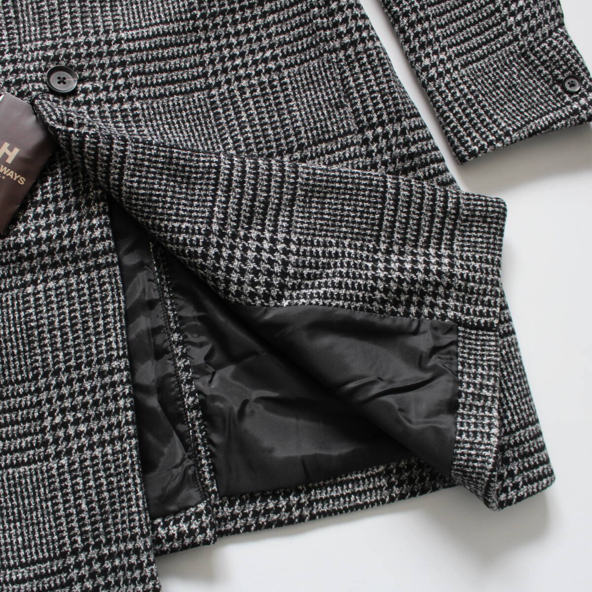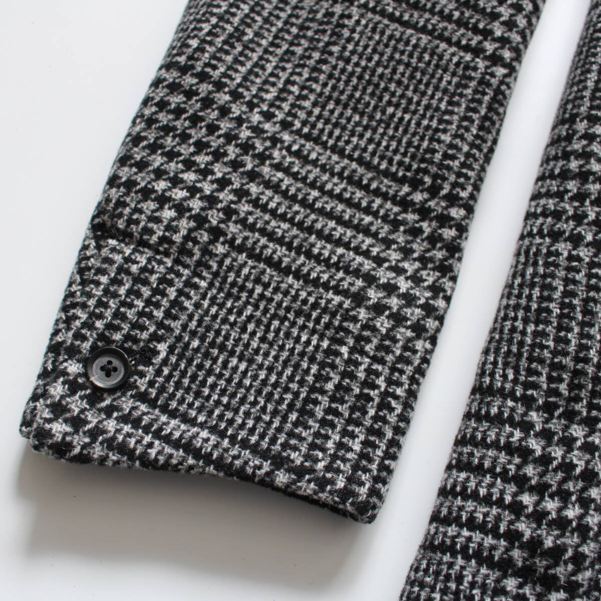 グレンチェック柄のハイブリットメルトン素材で、前はボタン留め、ポケットは前に3つ、