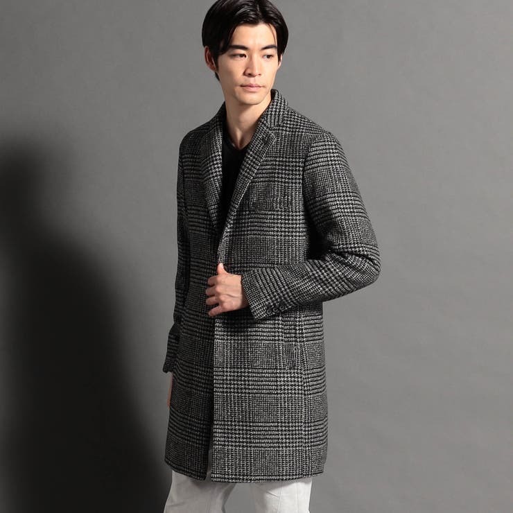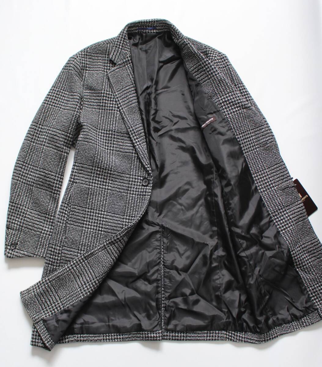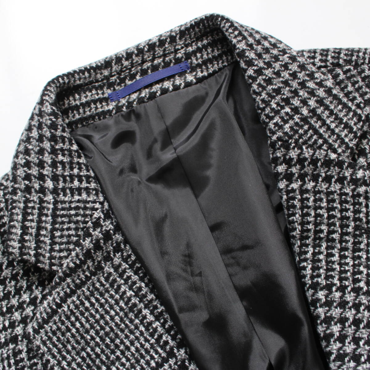 グレンチェック柄のハイブリットメルトン素材で、前はボタン留め、ポケットは前に3つ、