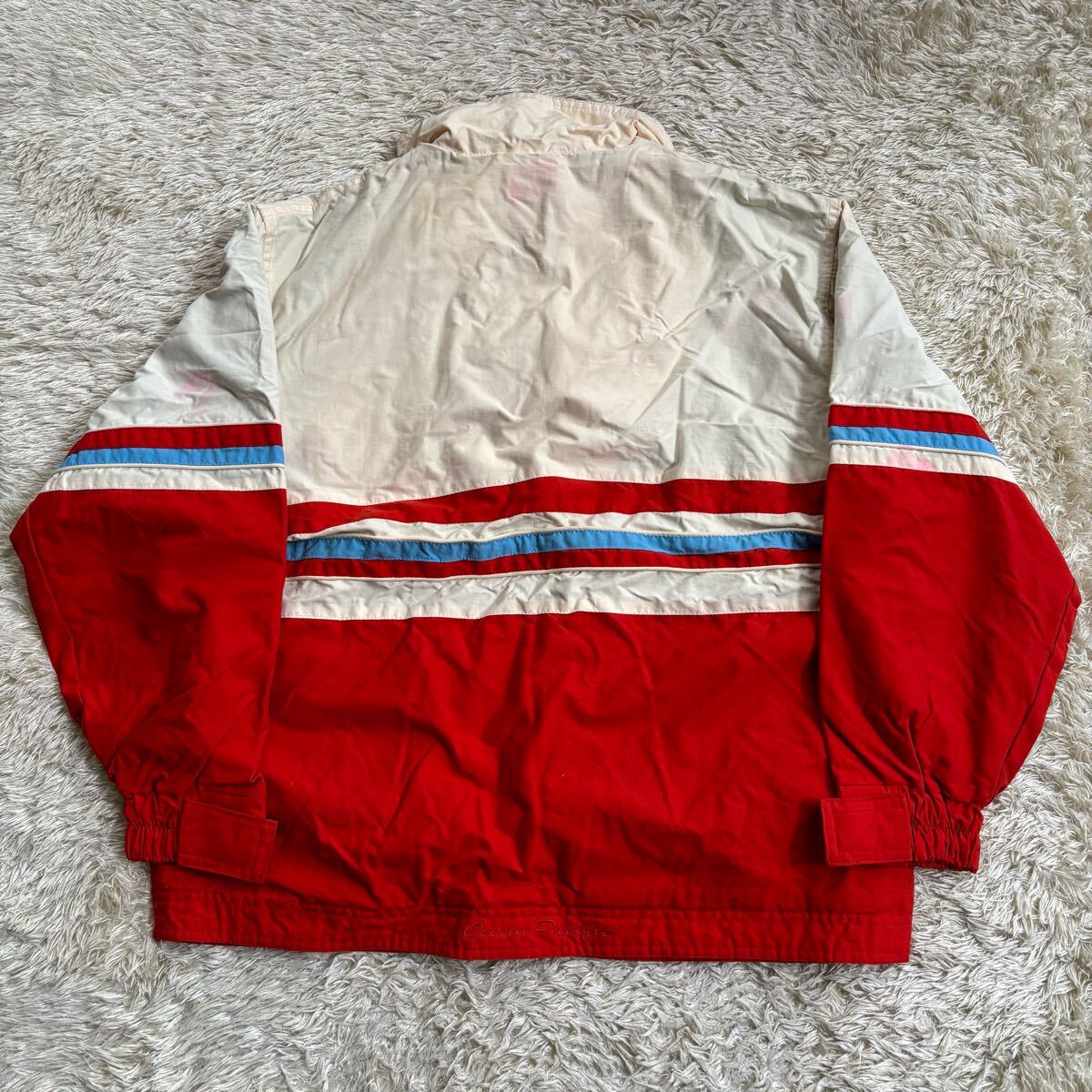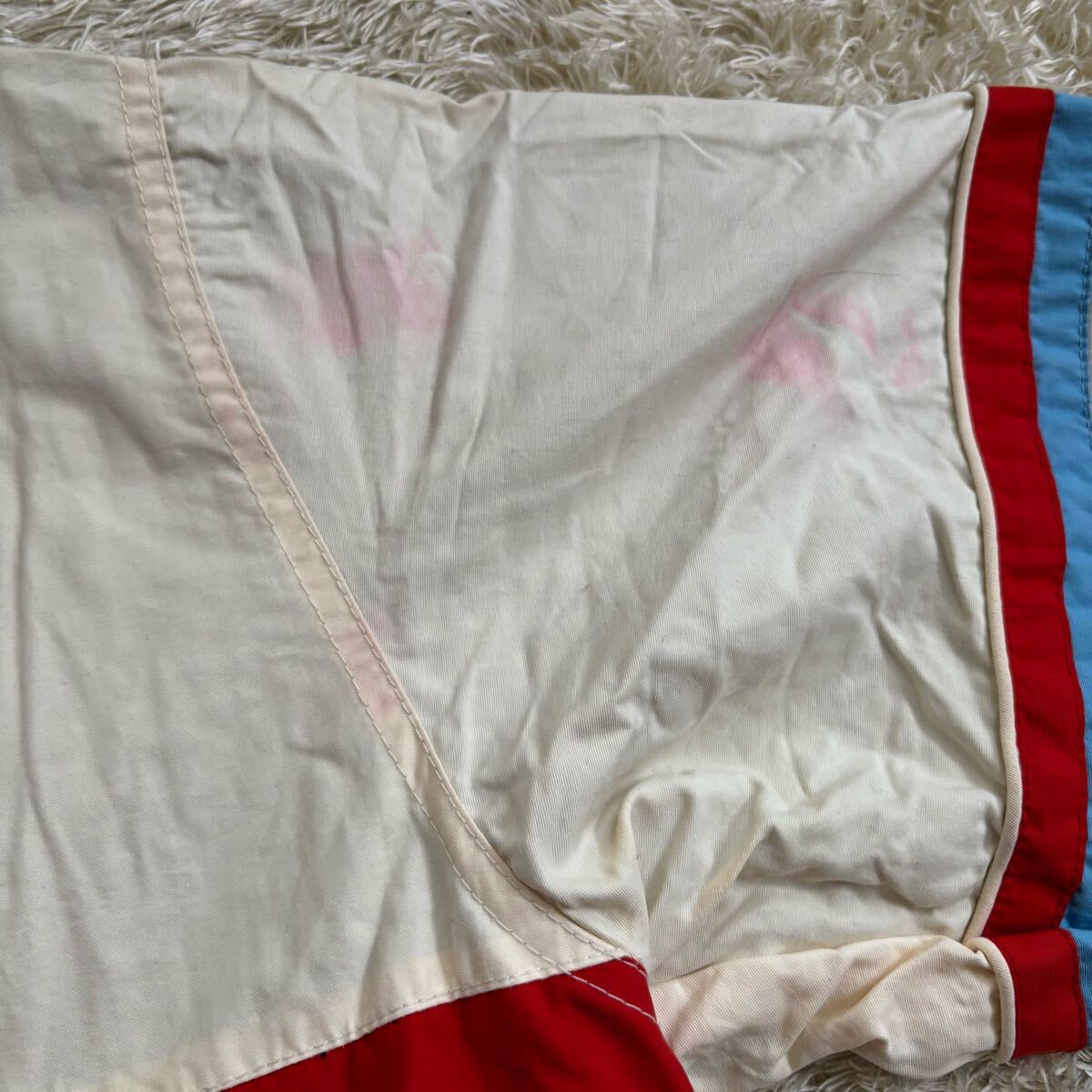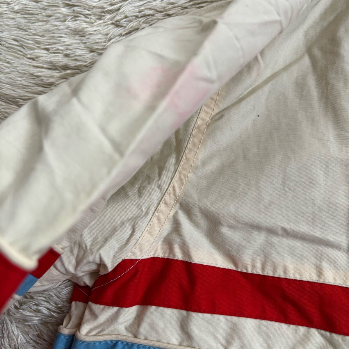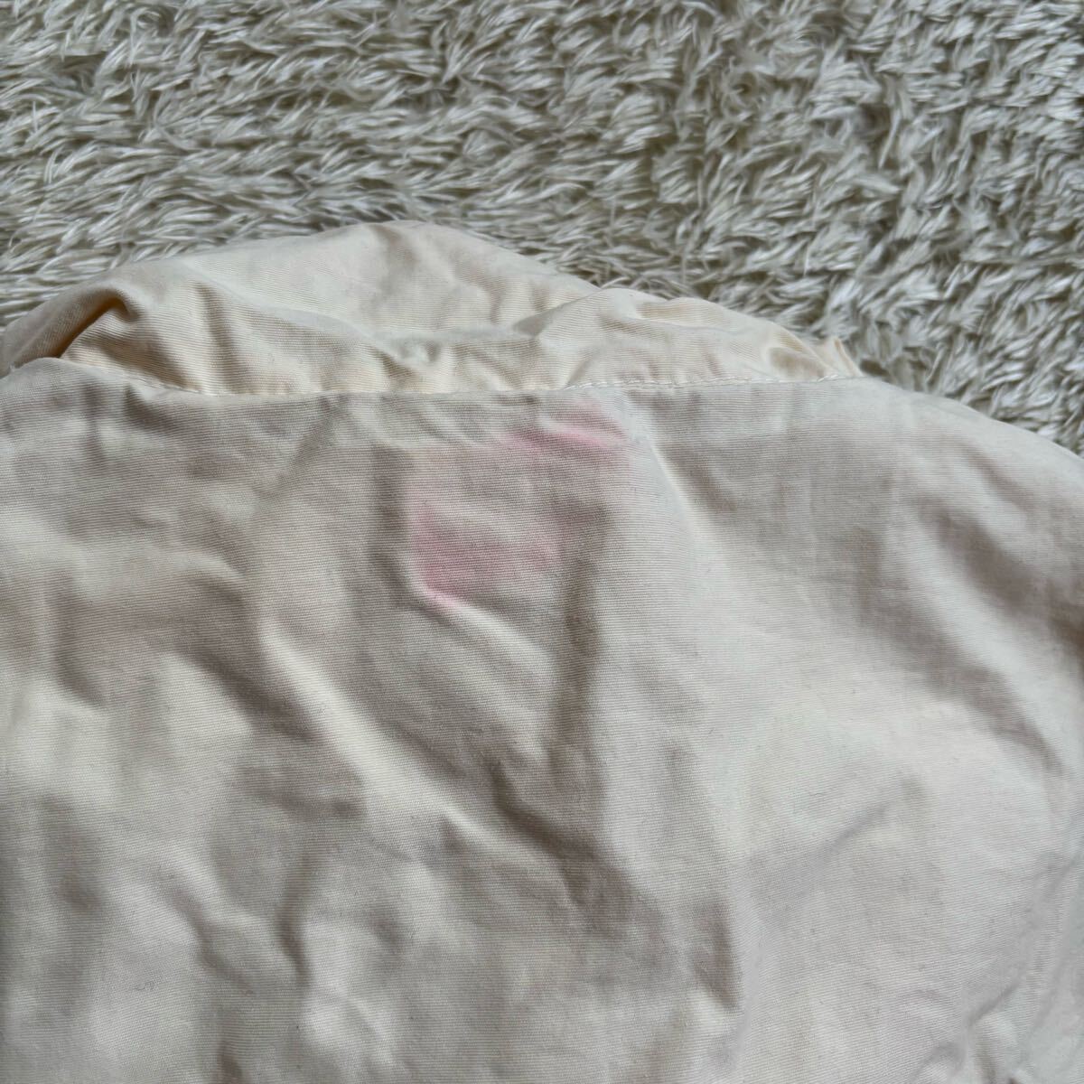 胸元シミ、腕、首、肩辺りに赤い色移りみたいなものがありますが、生地はしっかりしておりまだまだ着れますが中古品の為神経質な方にはお勧め致しかねます。