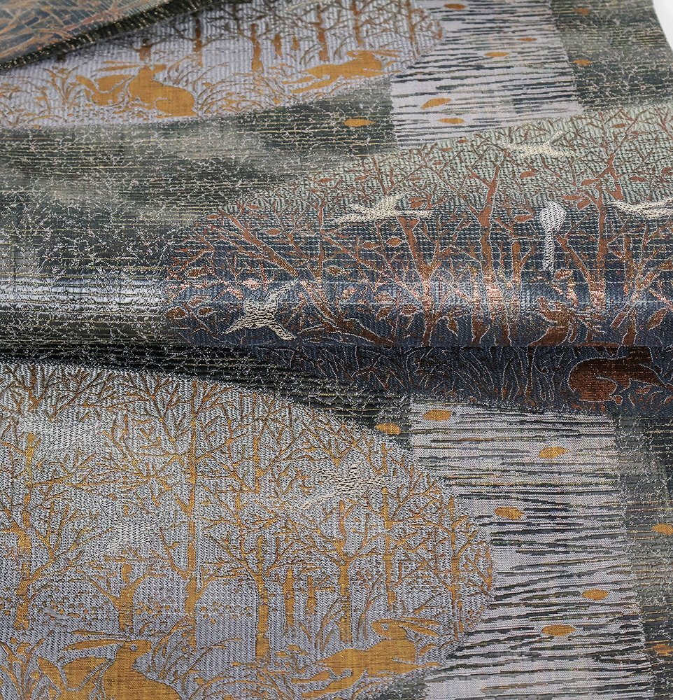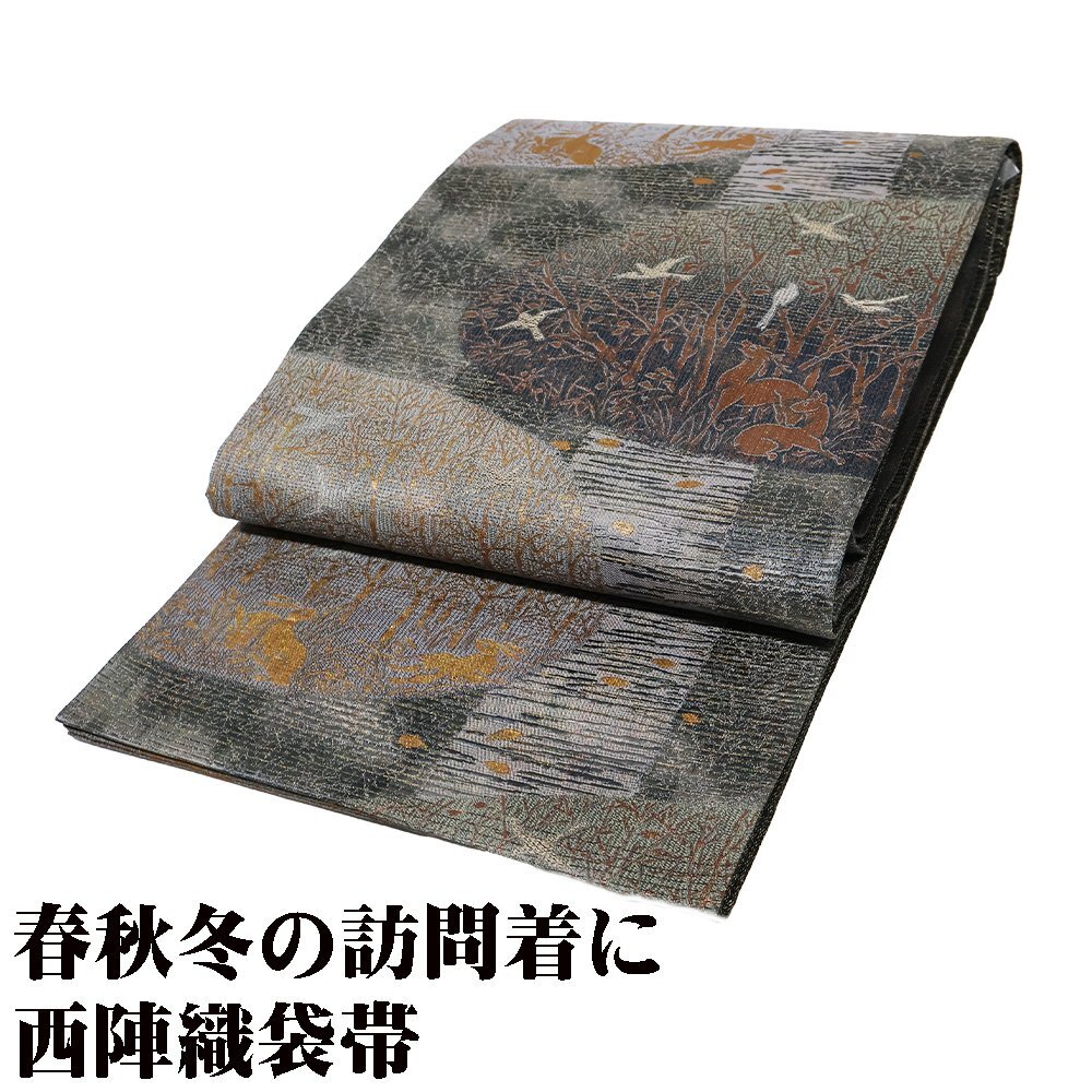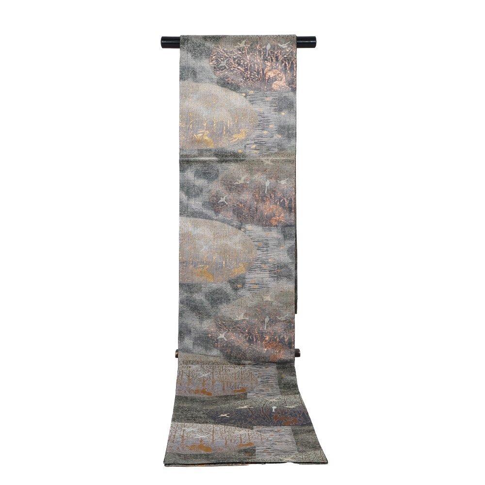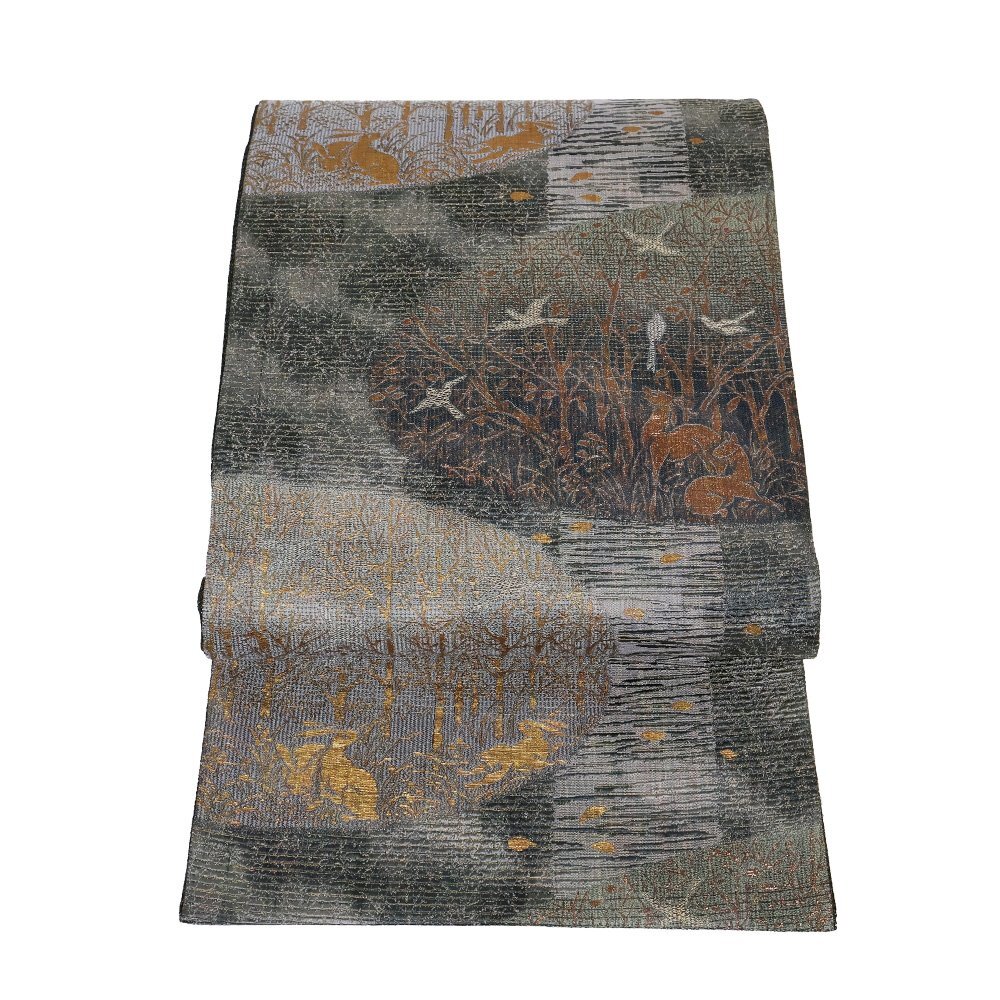| 西陣織袋帯 グレー・黒・金箔地 兎・鹿・花鳥文 未使用品 仕立て上がり |