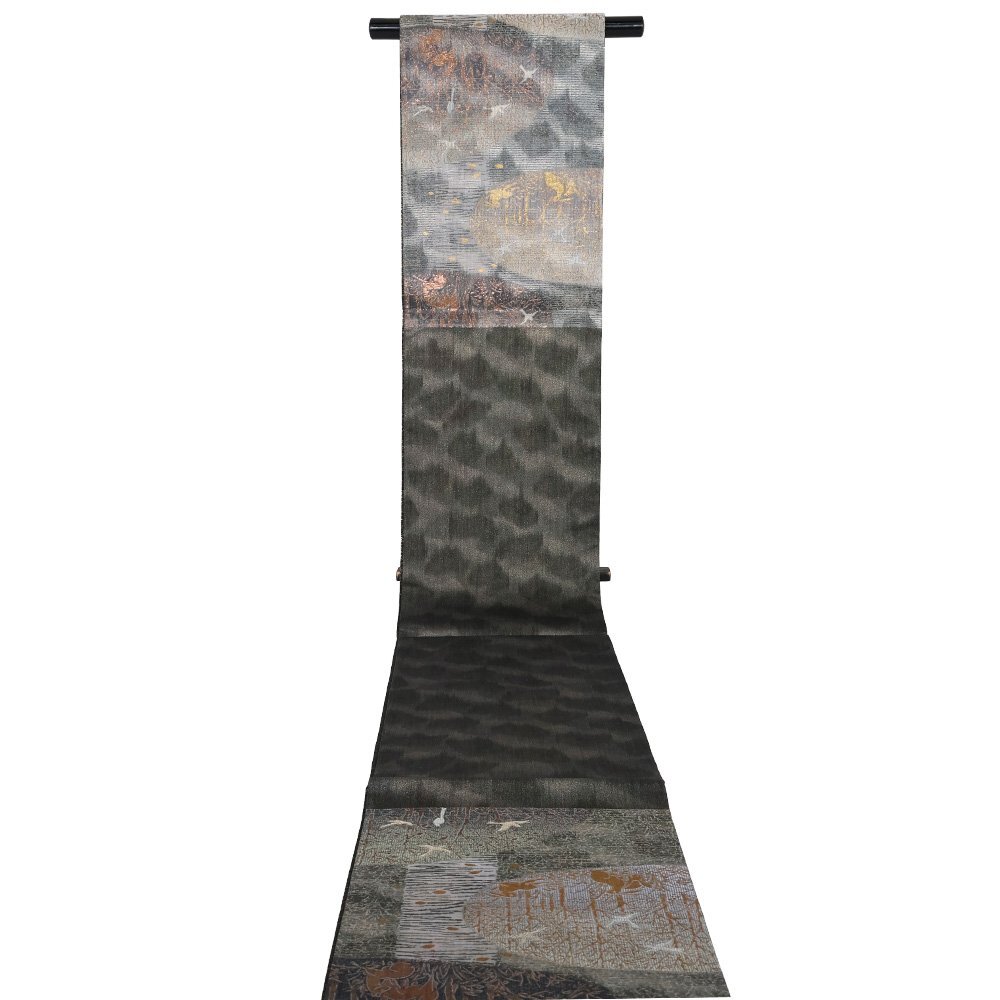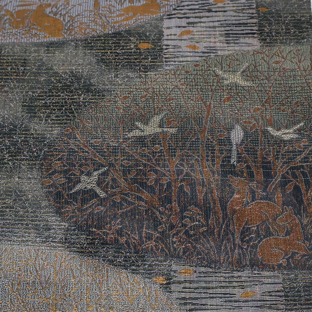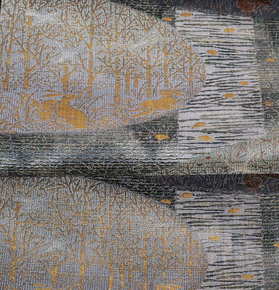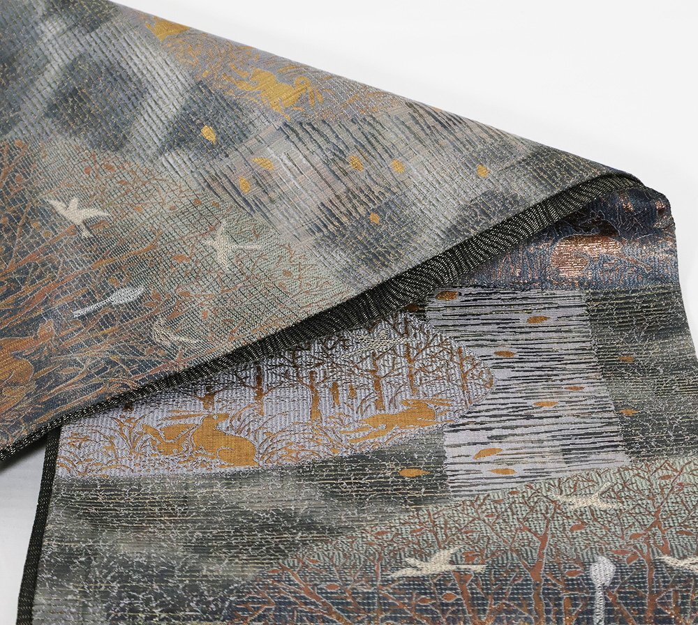 | 西陣織袋帯 グレー・黒・金箔地 兎・鹿・花鳥文 未使用品 仕立て上がり |