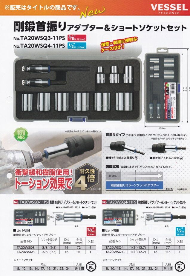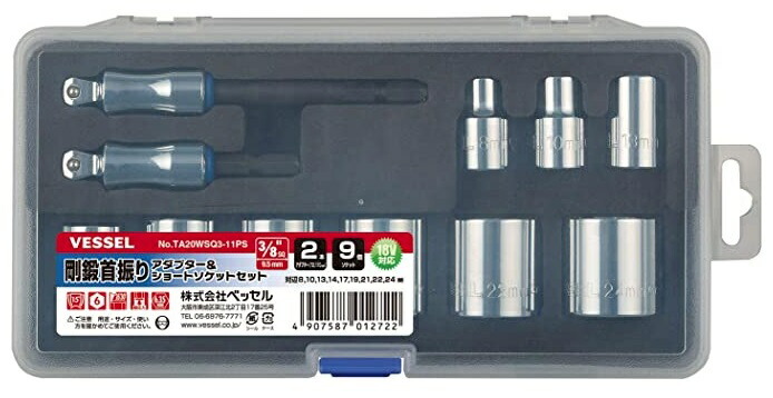 ベッセル VESSEL剛鍛首振りアダプター&ショートソケットセット 9個組No.TA20WSQ3-11PS■特徴・ショートソケットとアダプターのセット。・アダプターは首振りタイプ。角ギワ作業や狭い箇所での使用に便利です。軸部に衝撃緩和樹脂使用で4倍の耐久性が(当社比較)があります。・ソケットは面接触六角タイプ。・収納、保管に便利なプラスチックケース入り。■内容・ショートソケット:対辺8/10/13/14/17/19/21/22/24mm…各1個、差込角9.5mm (3/8インチ)・アダプター:首振りタイプ 全長77mm、115mm…各1本 ソケット差込角9.5mm (3/8インチ)・収納、保管に便利なケース入り