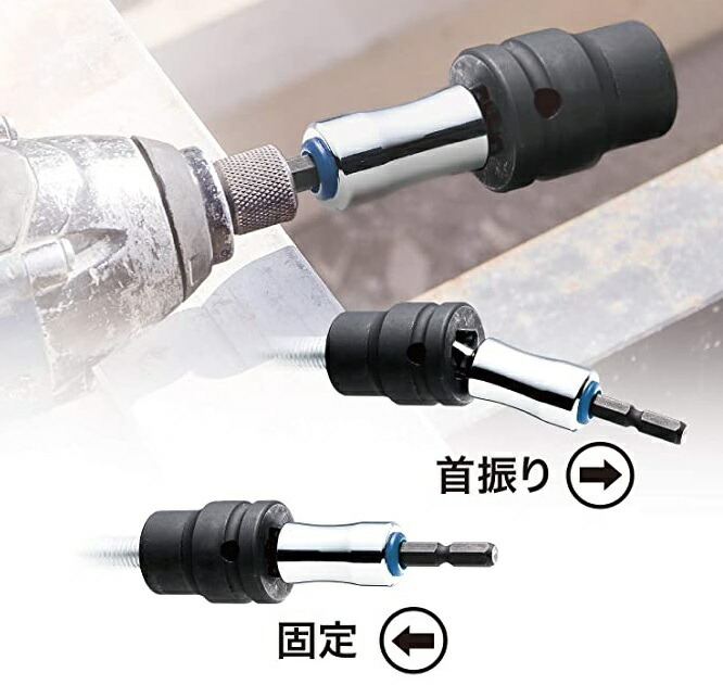 ・アダプターは首振りタイプ。角ギワ作業や狭い箇所での使用に便利です。軸部に衝撃緩和樹脂使用で4倍の耐久性が(当社比較)があります。