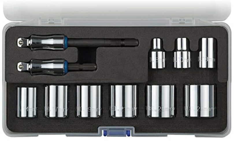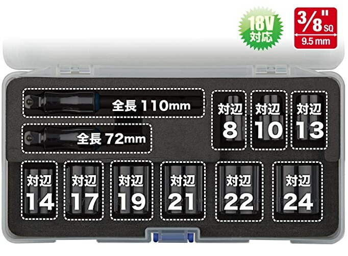 ・ショートソケット:対辺8/10/13/14/17/19/21/22/24mm…各1個、差込角9.5mm (3/8インチ)