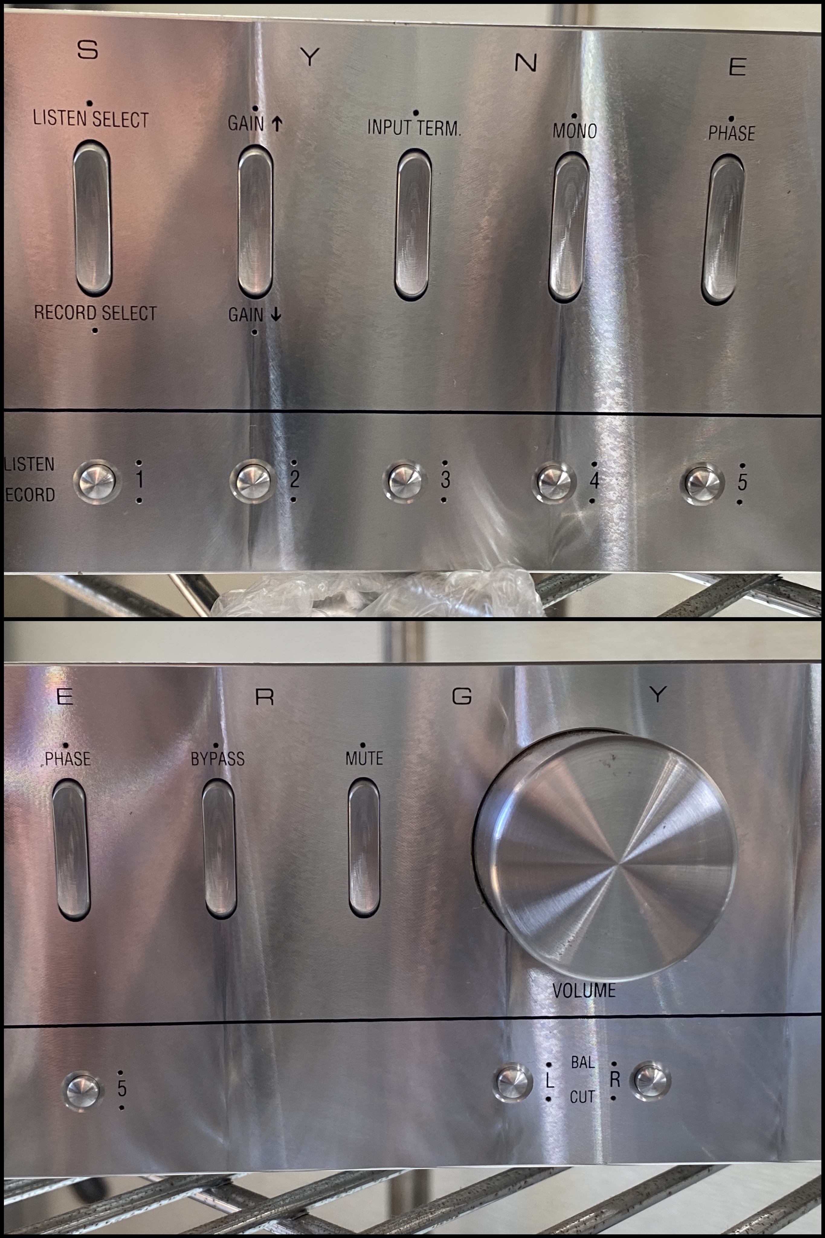 ■メーカー Jeff Rowland ジェフ・ローランド ■品名 Synergy Preamplifier シナジー・プリアンプ ■型式 コントロールアンプ ■入力 XLR:5系統 バイパス XLR:1系統 ■出力 main out:XLR:1系統 record out:XLR:1系統 ■入力感度 各チャンネル毎に個別設定可能 ■インプットインピーダンス 36kΩ、600Ω(バランス、アンバランス共通) ※各インプットで選択可能 ■アウトプットインピーダンス 40Ωバランス 80Ωアンバランス ■最大入力レベル 13Vrms(0dBゲイン) ■最大出力レベル 13Vrms(24dBm)96dB以上 ■THDノイズ 0.0016%(10Vアウトプット、600Ωロード) ■ゲインレンジ 63.5dB、127等分増幅 ■ミューティング あり ■アブソリュートフェイズ スイッチにより変換 ■チャンネルセパレーション 100dB以上(20Hz~20kHz) ■チャンネルバランス 0.5dB±0.03dB ■出力ノイズレベル 12μV(20Hz~20kHz、0dBゲイン) ■電源 AC100V、50Hz/60Hz ■最大消費電力 25W ■外形寸法 プリアンプ部 幅/445mm x 奥行/153mm × 高さ/80mm 電源部 幅/445mm x 奥行/122mm × 高さ/38mm ■重量 プリアンプ部 11kg 電源部 3kg ■輸入 大場商事(正規輸入品) ■備考 リモコンは欠品しております