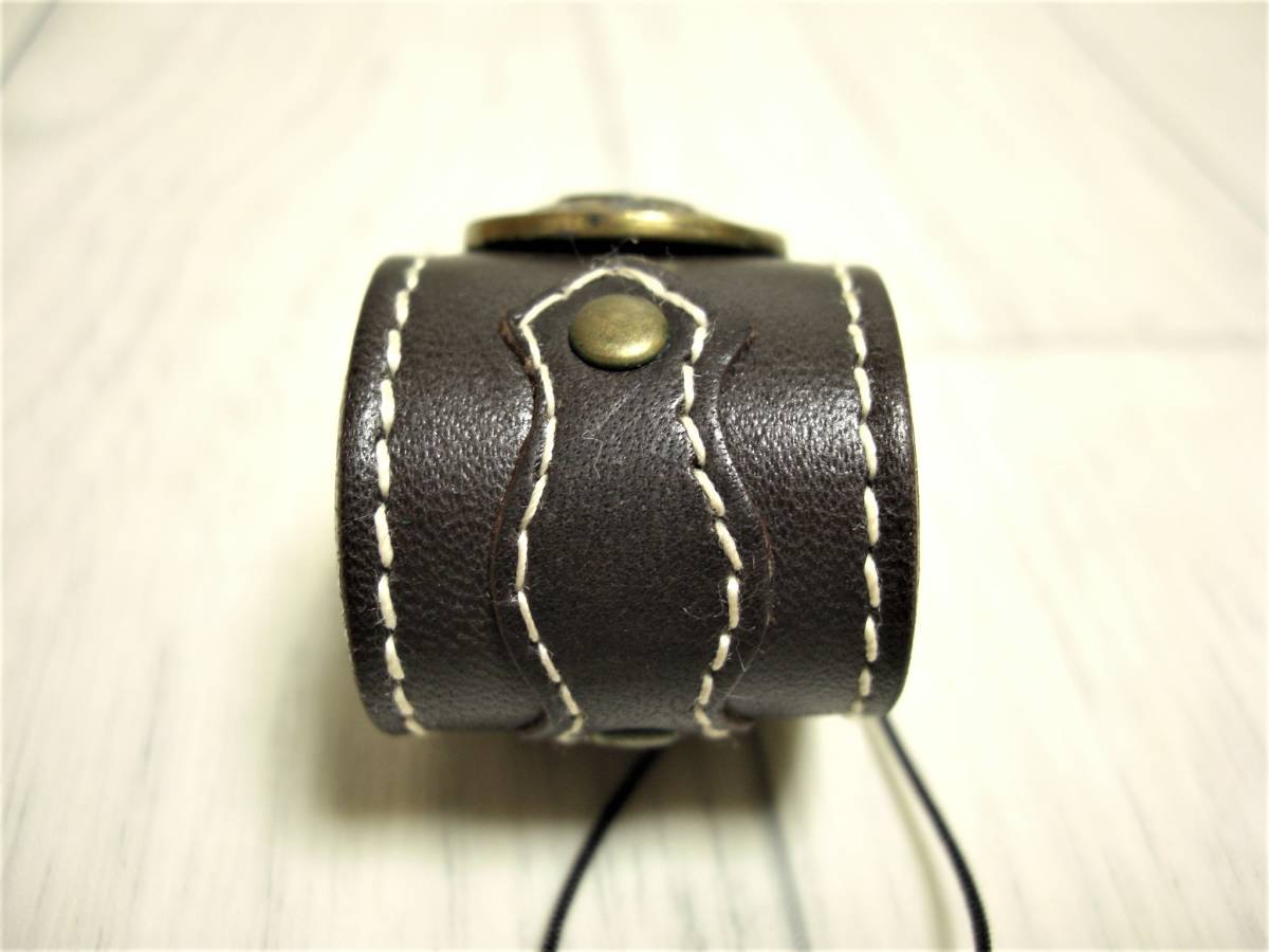 【カラー】ダークブラウン・レザーカラー(焦げ茶色)xホワイト系ステッチ。メタルカラーは、アンティーク・ブロンズゴールド系