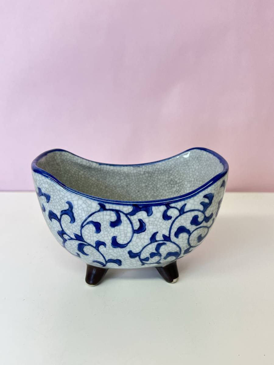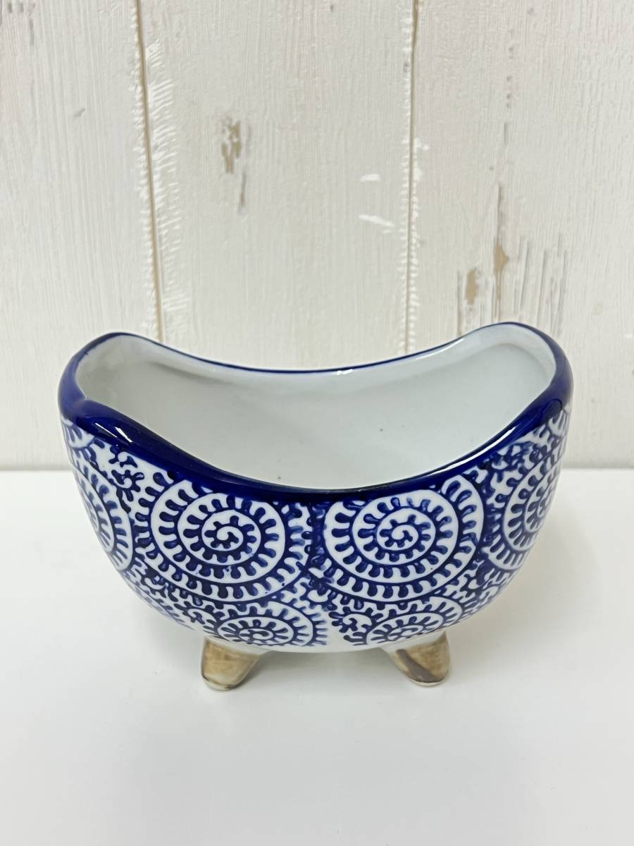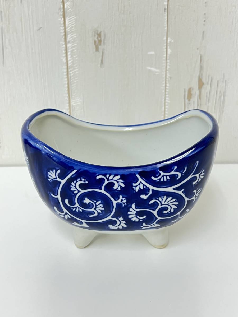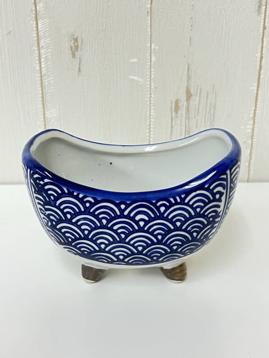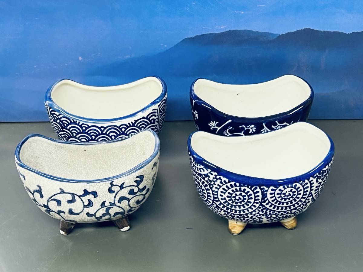 陶器 【三日月型 植木鉢 4点セット 柄ランダム】 染付 盆栽 植物 多肉 庭園 お庭 人気