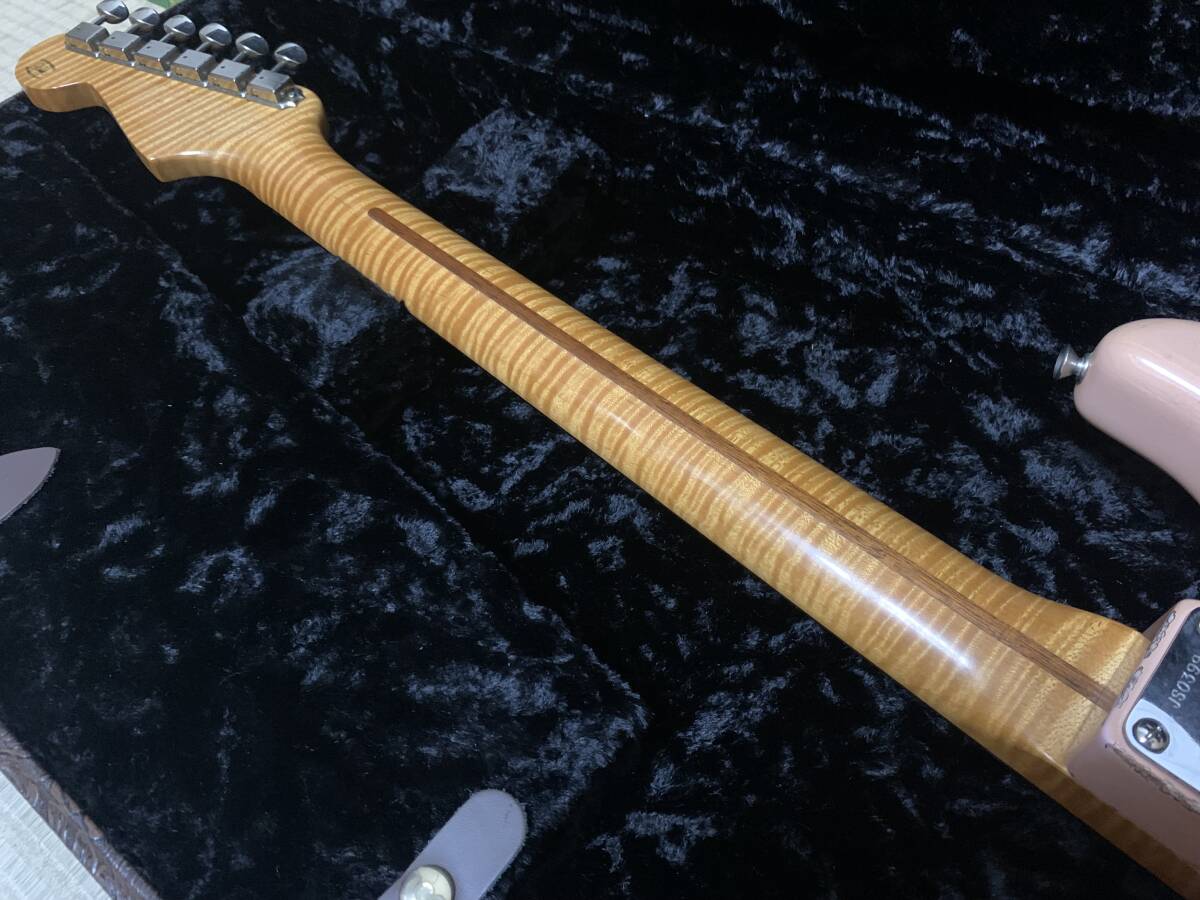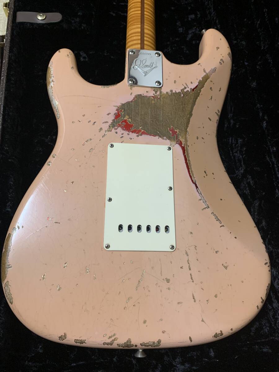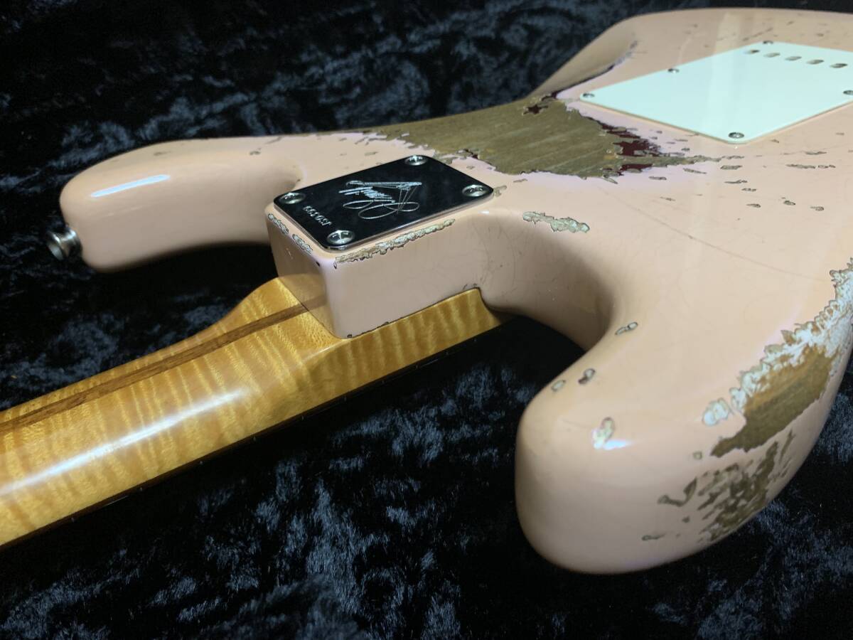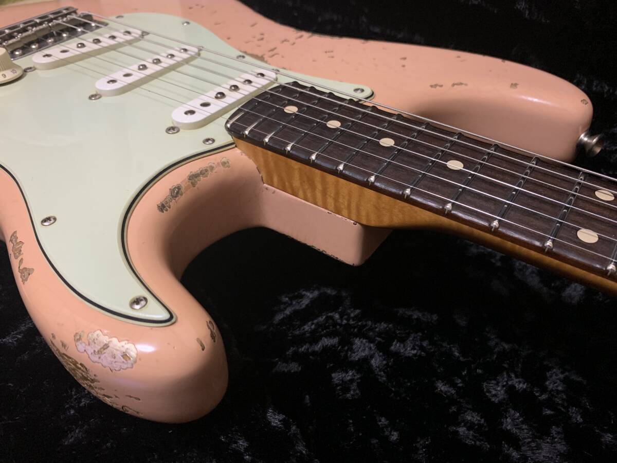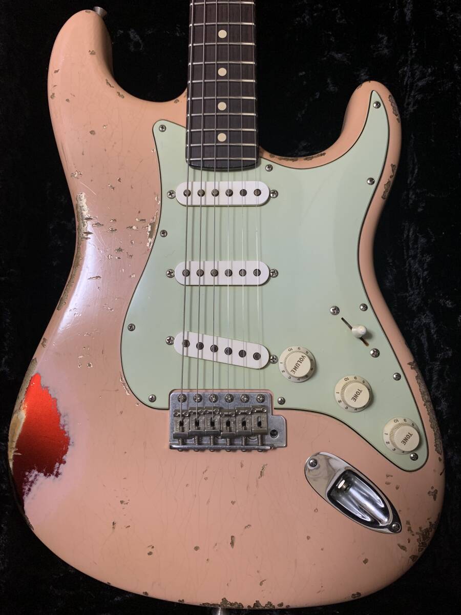 下地にホワイト、ゴールドを吹いたキャンディ・アップル・レッドにシェル・ピンクを重ねることでレリック箇所が実に様々な表情を見せており、生々しい迫力を持ったギターに仕上がっております。