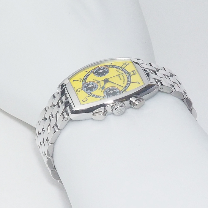 備考:トノウ(樽)とカーベックス(湾曲)を組み合わせた立体的な3次元構造が特徴の、フランクミュラーの代表作「トノウカーベックス」。華やかなイエローエナメルダイヤルが目を惹く、手巻きモデルです。ケースにわずかな小スレがございますが、目立つような大きな傷は無く、状態の良いお品となっております。