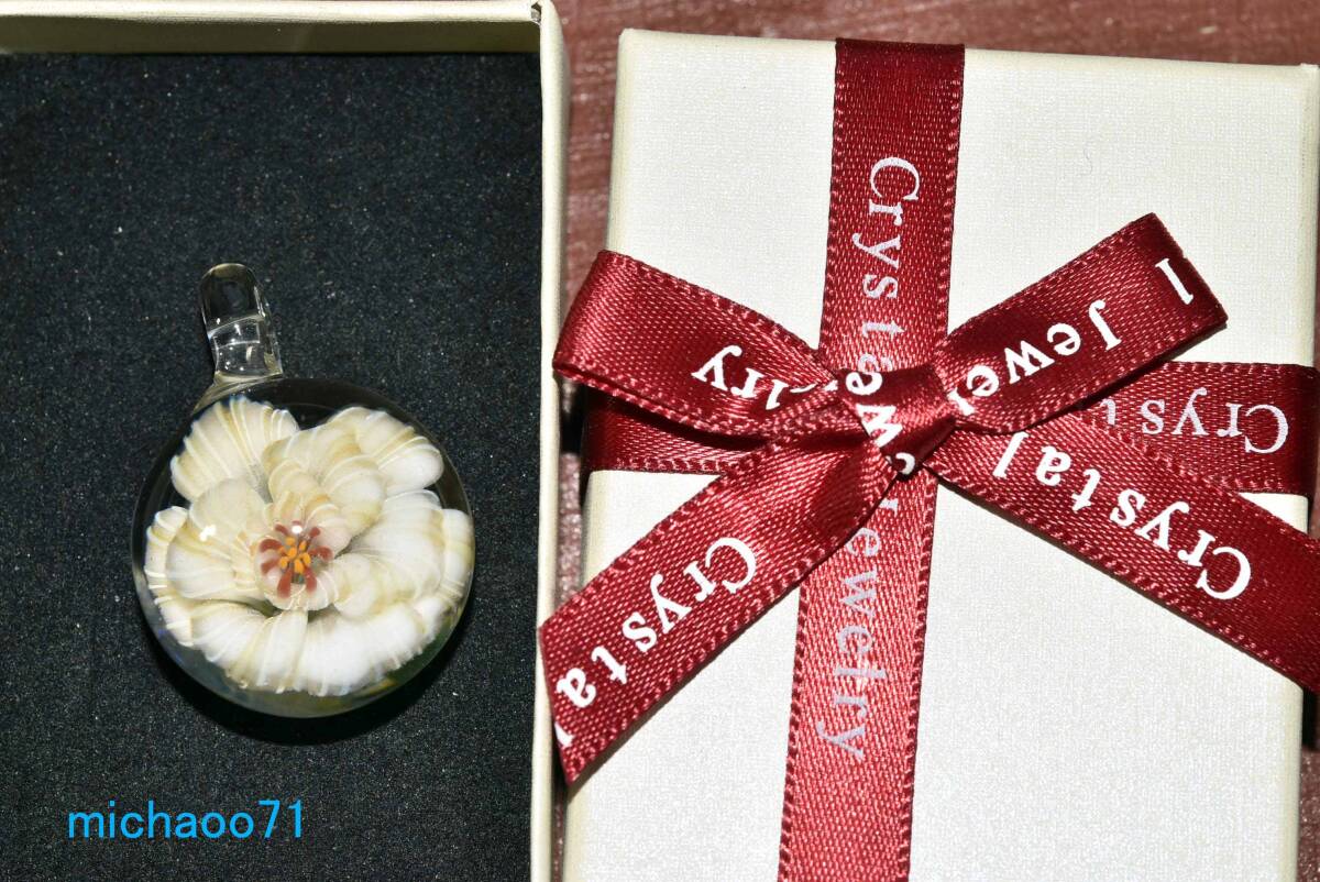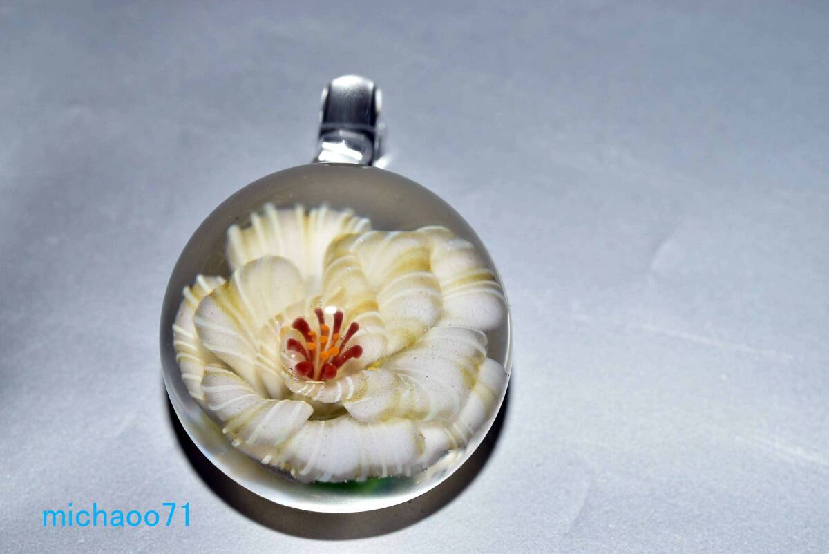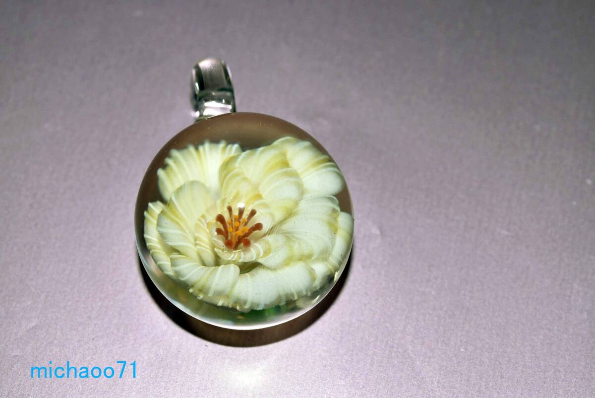 ●このフラワー ガラスのペンダントトップは、透き通ったガラスの中に鮮やかに咲く花を生み出した特別なデザインです。軽やかな造りなので、日常的なコーディネートにぴったりマッチします。球面レンズ効果で実物より奥深く見え、太陽光の下では特に美しく鑑賞できます