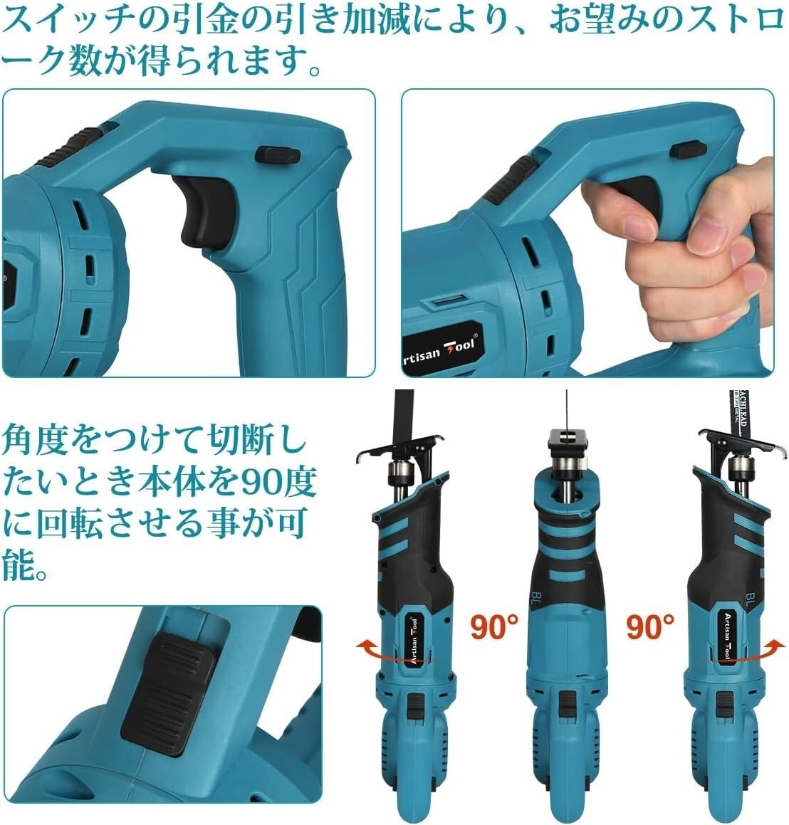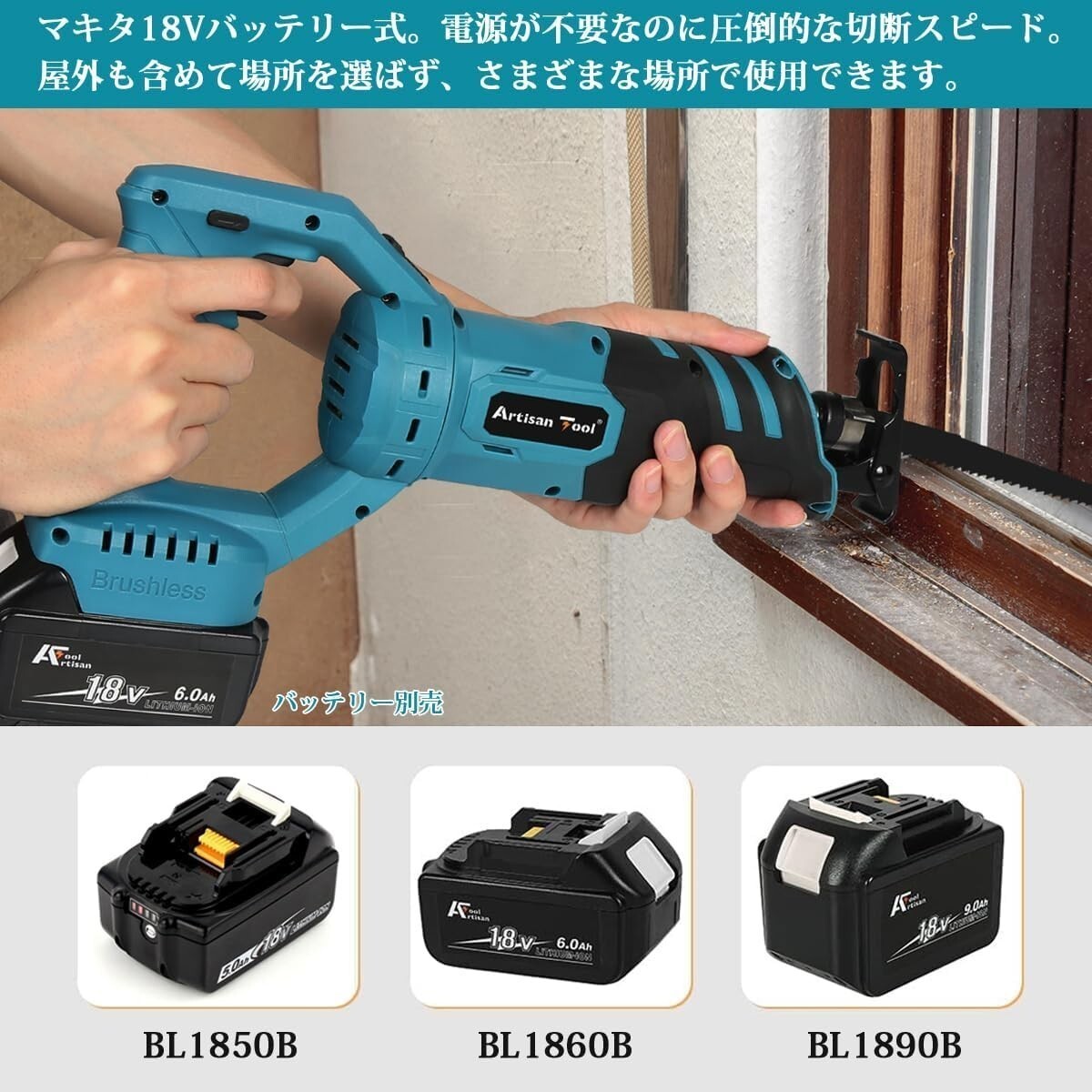 バッテリー別売り 【商品仕様】充電式レシプロソーATRS01Bは、サイズが長さ380mm×幅80mm×高さ170mmで、質量は1.57kgです。ストローク量は28mm、最大無負荷回転数は0〜2,700min-1であり、ブラシレスモーターを搭載しています。切断能力は、パイプの外径130mm、木材の厚さ250mm、軟鋼材20mmまで対応しています。こブレードの交換も簡単であり、本レシプロソーブレードを付属しております。DIYやプロジェクトに最適な充電式レシプロソーとなっています。 【幅広い用途】充電式レシプロソーATRS01Bは手軽に持ち運びができるハンディタイプの電動工具です。木材や金属、プラスチックなど、様々な素材を切断することができます。、壁紙やパネル、床材、玄関ドアなどのカットにも使用できるため、住宅リフォームや修繕に役立ちます。水道管やガス管などのパイプ切断や、枝木の伐採、フェンスの製作にも最適です。建設現場でも活躍し、鉄筋の切断にも使用できます。縦方向だけでなく、横方向や斜め方向への切断も可能で、作業効率が格段にアップします。強力なブラシレスモーターを搭載しているため、高速かつ滑らかな切断が可能です。 【本体90°回転機能】本体90°回転機能を搭載しています。ハンドルの上にあるボタンを押すことで、本体を90°回転させることができ、作業がより便利になり、自在な作業が実現します。狭いスペースや天井裏など、通常では難しい場所でも作業が行え斜め方向や横方向への切断も可能となり、作業効率が格段にアップします。 【ブレード取り付け方法】工具不要で、簡単にブレードを取り付けることができます。まず、ドライビングスリーブのレバーを逆時計方向に回して最も奥まで移動させます。次に、ブレードをスリーブに差し込みます。スリーブが回転し、レバーが固定位置になるまでブレードを引っ張って引き抜くことで、正しくブレードが取り付けられているか確認してください。 【マキタ18Vバッテリー対応】充電式 レシプロソーATRS01Bは、マキタ18Vバッテリーbl1850b、bl1860b、bl1890bなどのバッテリーが使用できます(※バッテリーは別売りです)。既にマキタ18Vバッテリーを所有する方に、この充電式レシプロソーがおすすめです。既存のマキタ18Vバッテリーを利用することができ、追加の購入費用を抑えながら、高性能かつ効率的な作業を実現できます。