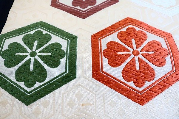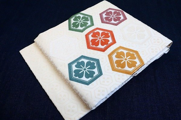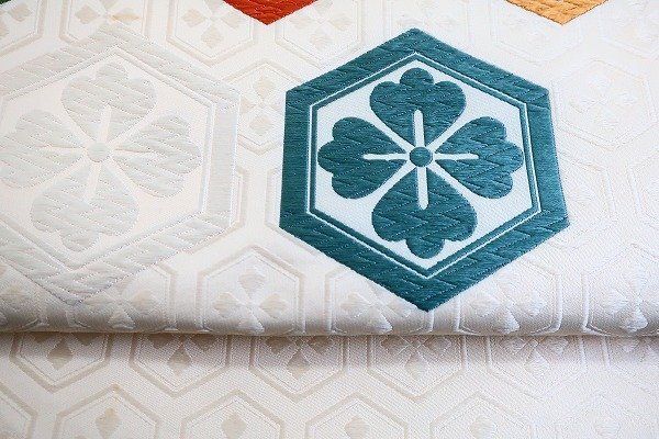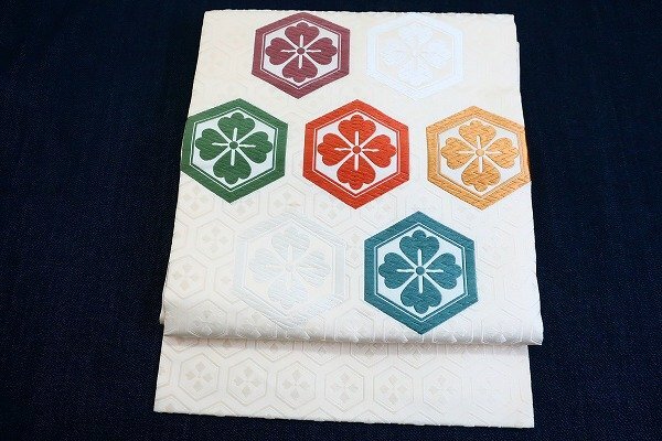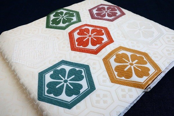オフホワイトの絹地に、唐織で亀甲文があしらわれた名古屋帯です。 |