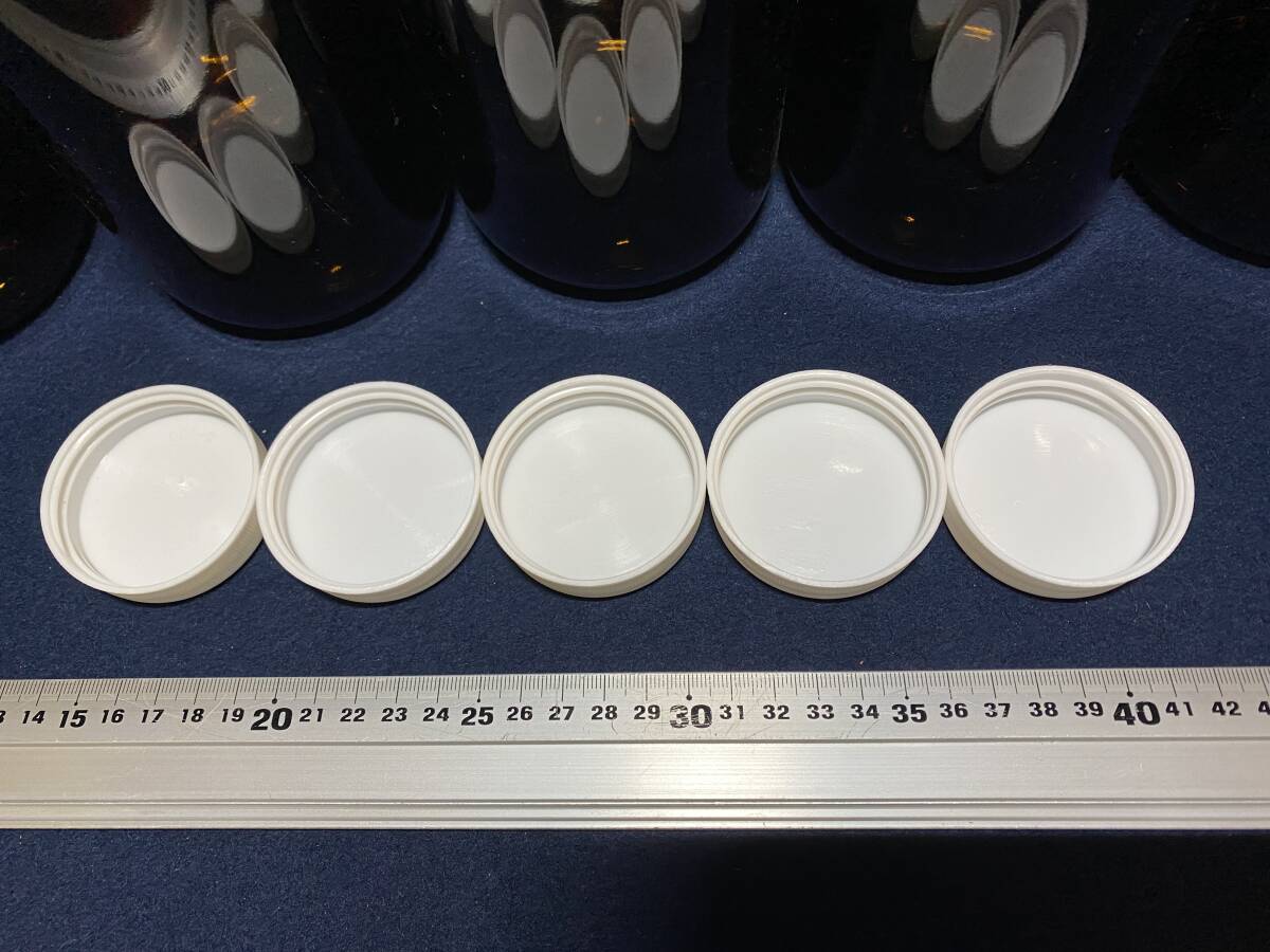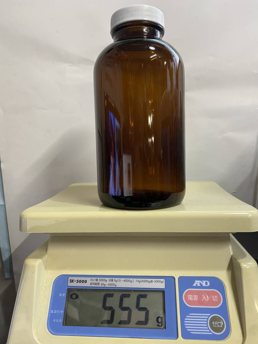 白い樹脂系の蓋付きで 硝子自体は茶色系の 商品。