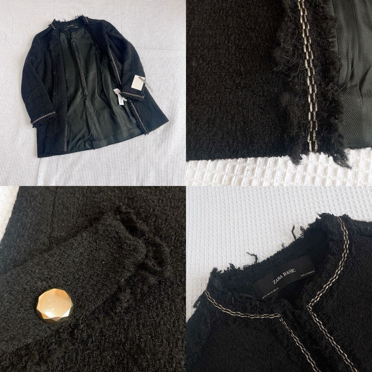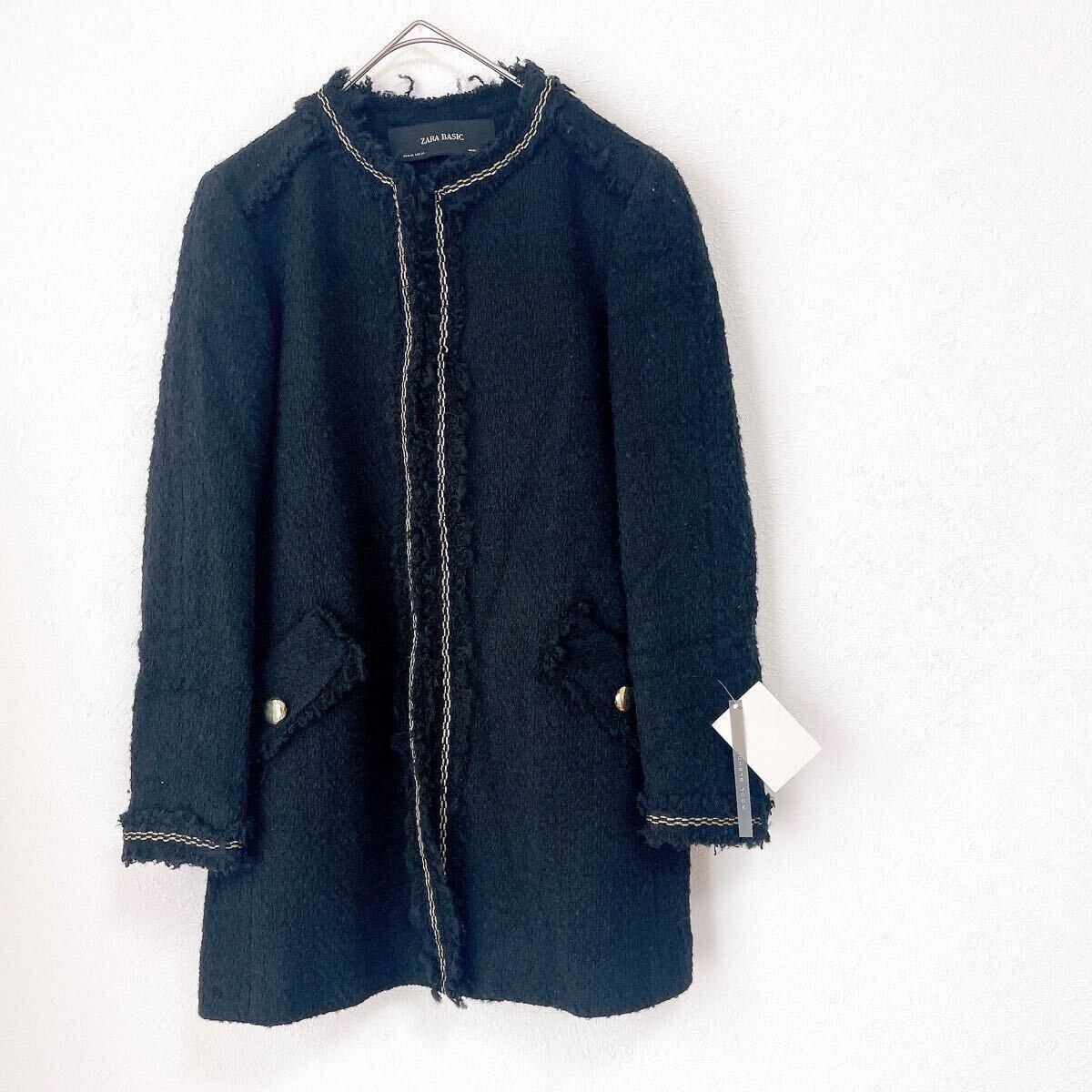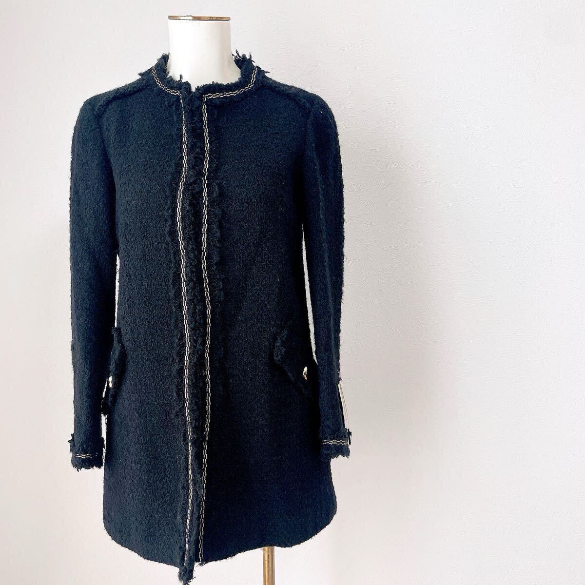 ★新品★ザラZARAツイード長袖ロングジャケット コート アウター ブルゾン黒ブラック ノーカラーSSサイズXSサイズ金ゴールド釦ボタン