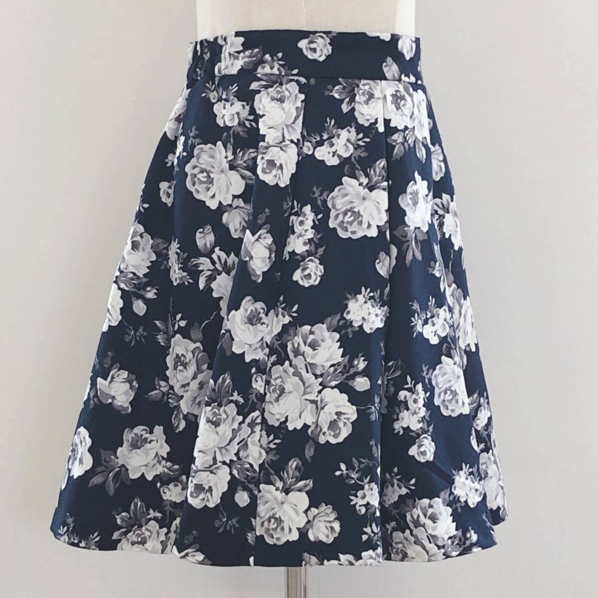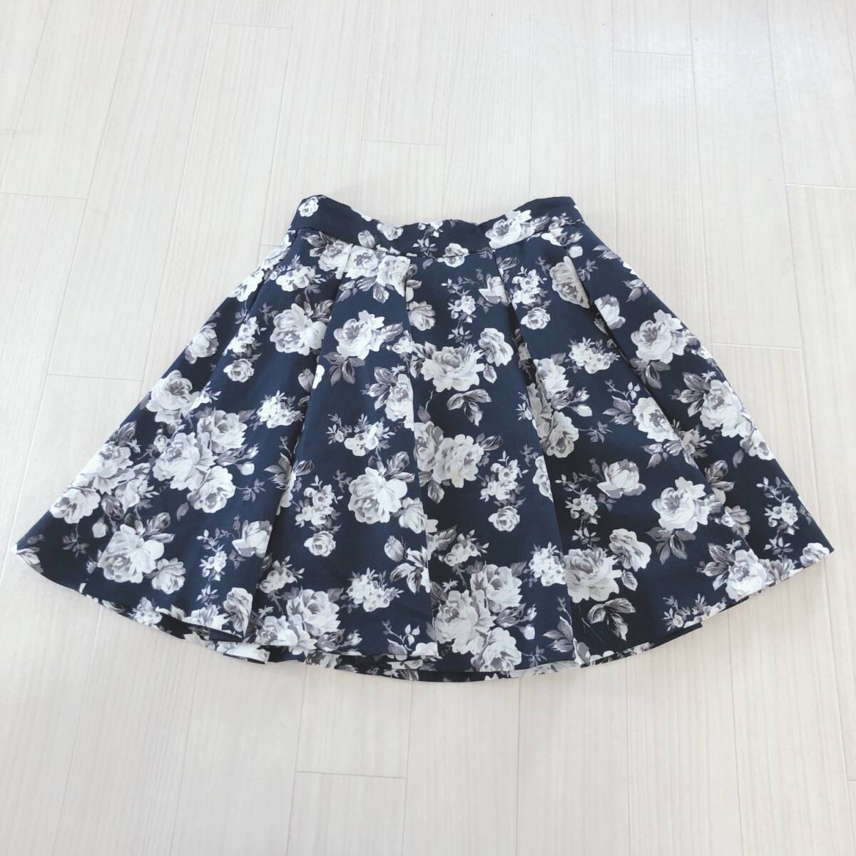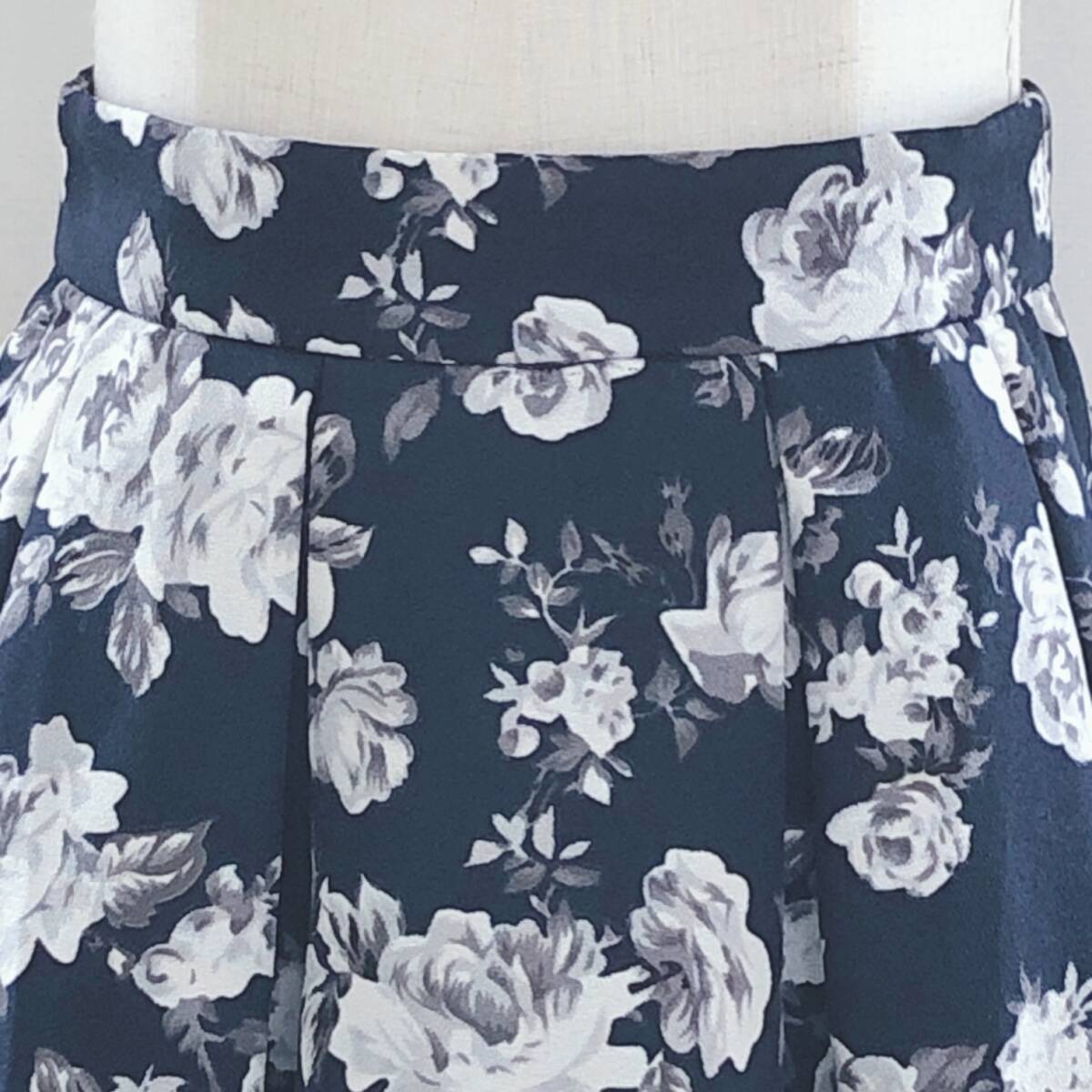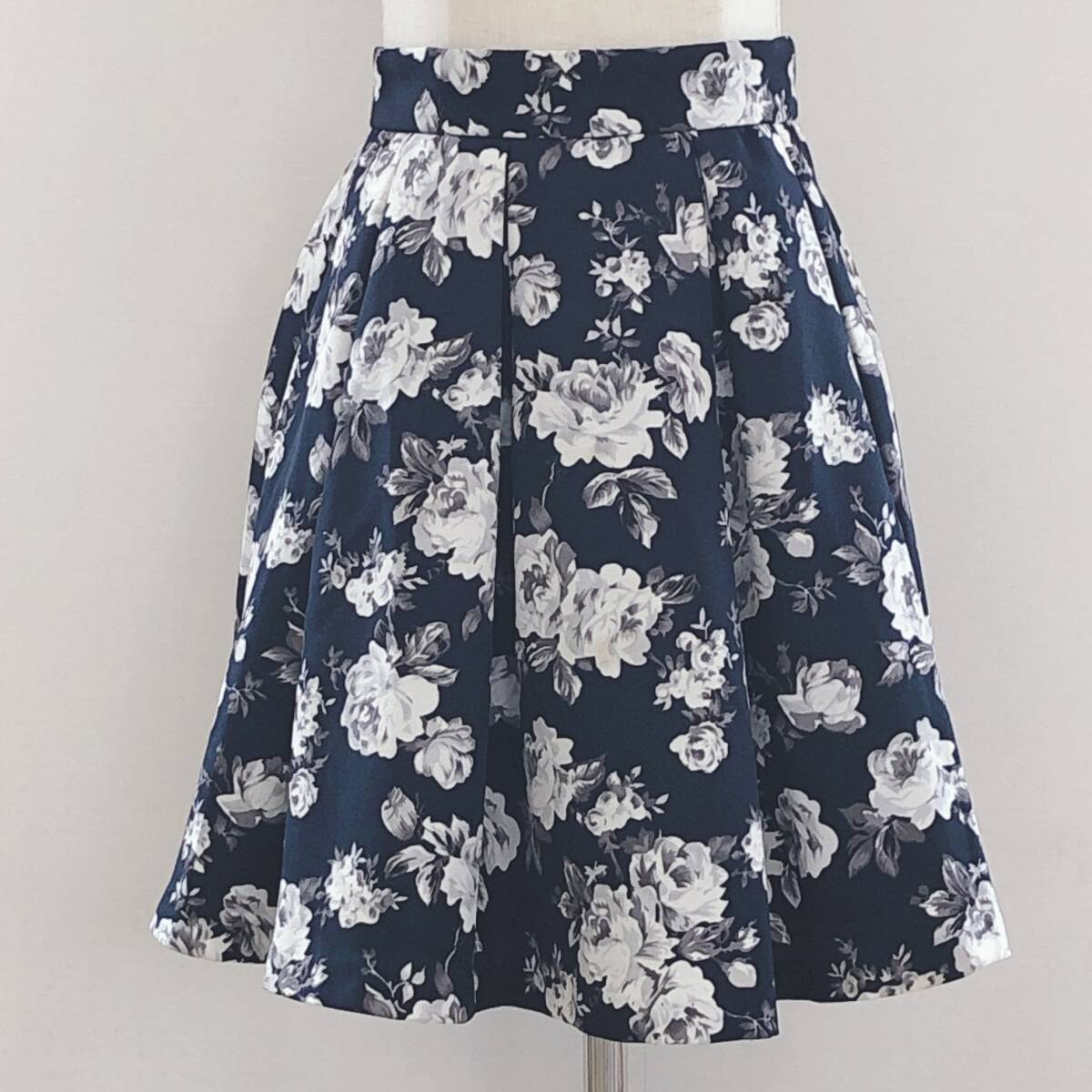 YX1385 INGNIレディーススカート膝丈 薄手 ウエストゴム 裏地 ファスナー M ネイビー 紺 花柄 シンプル かわいい フェミニン おしゃれ 春夏