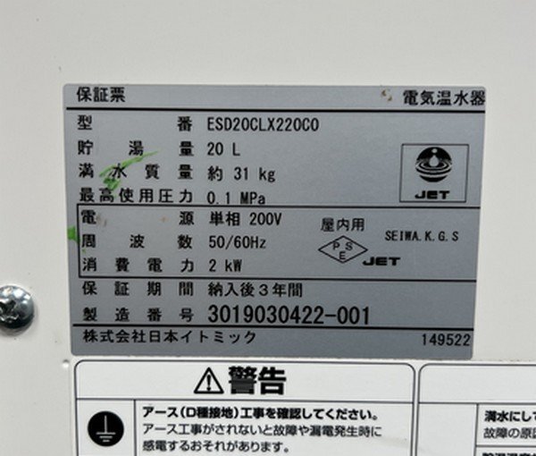 §【iTomic イトミック 電気温水器 ESN20CLX220C0 単相200V 貯湯量20L ESNシリーズ 床置式】Q01110