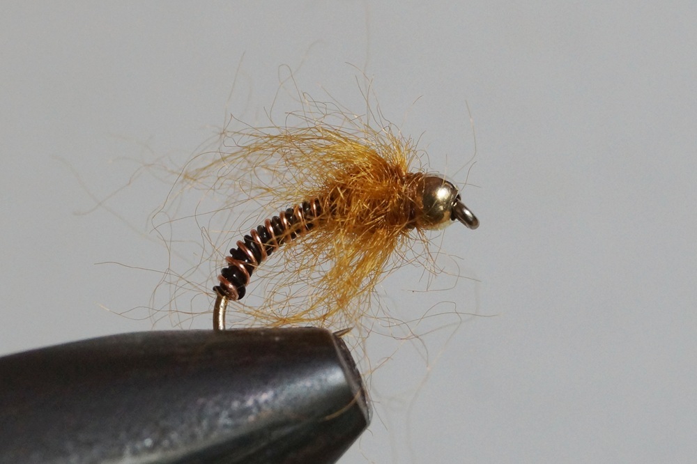ポリウレタン銅線と黒線を縞状に巻きあげたブラッシーです。バーブレス・カーブフック#12を使用した7本です。ブラスと黒の縞模様で、腹節と銅線の輝きを際立たせた仕様です。