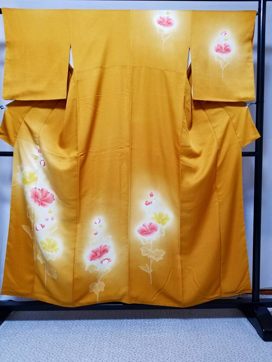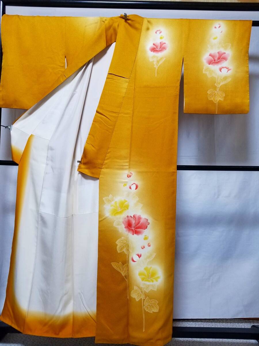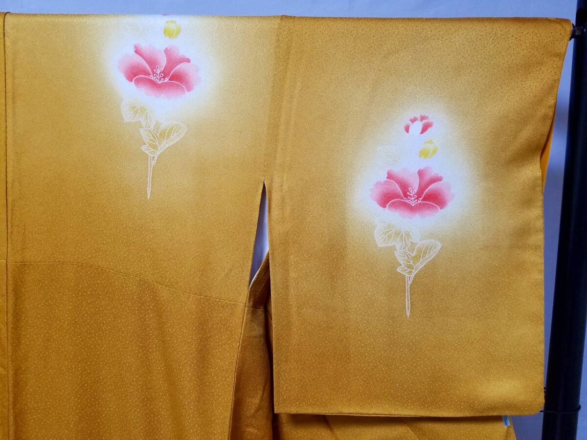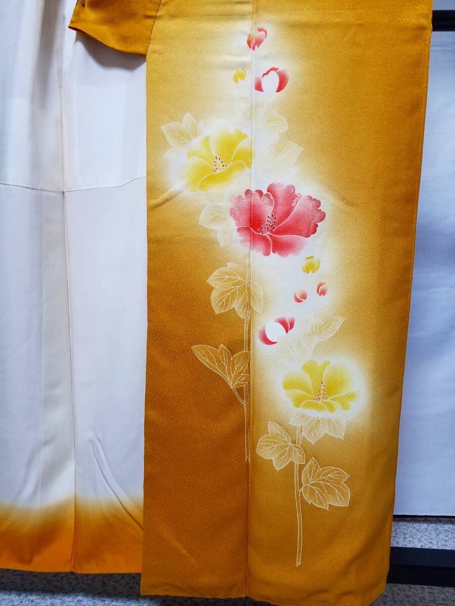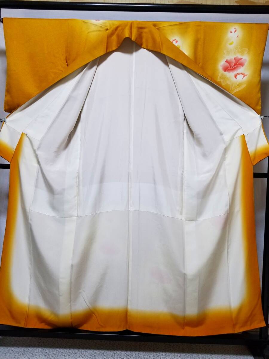 *手縫仕立て品 *中古品 *着用感なし *シミ.汚れなく美品 {生地} ☆正絹*紋繻子地「重め地」**粉雪のような地紋 ☆着物 重さ 約900g {お色} ☆狐色「濃い赤みの黄色」 ☆文様の周りの暈し染色は「黄み白色」です ☆見事な暈し染です {文様} ☆手描き染*手暈し染*手刺繍の花文様 ☆上前身頃の花には極細糸での微細手刺繍 {胴裏地} ☆正絹 羽二重地{純白色}*美品 {八掛地} ☆正絹 精華縮緬地{金茶色*濃い赤みの黄色}*美品 ◎消費税は.お預かりしておりません◎ {寸法} 身丈 {肩から裾まで} 約159cm {内あげ 前身 約6cm 後身 約16cm} 裄丈 約65cm {袖付け 縫い代 袖側 約1.5cm 身側 約2cm} 袖丈 約48.5cm 袖幅 約33cm 前幅 約23.5cm 後幅 約29.5cm *広衿{スナップ付き} (発送方法) ●大阪から ゆうぱっく.おてがる配送 ◎t6227jp 桐輪 「呉服の桐正」でも色々と出品しております {注意事項} (注意事項 必ずお読みください!) ★基本的に土、日、祝日、ゴールデンウィーク、お盆、年末年始はお休みさせて頂いておりますので、ご連絡が遅れる場合もございますので、ご了承ください。 ★どうぞ自己紹介欄も、是非御覧になって下さいませ。 ●落札後にヤフーから届くメールに、メッセージを記載しておりますので、 そちらも必ずご覧下さいませ。 ●当方、ストア出品ではなく、一日中パソコンに向かっておらず、ご連絡は夜になる事が多いです。その点御理解の上、ご入札下さい。 ●お急ぎの場合など、到着希望の日にちが特に近い場合、ご要望にお答えできかねる場合もございます。もちろん、出来る限り、早急に対応はさせて頂きますが、その点は、何卒ご了承下さいませ。 入札前に、発送が間に合うかご質問頂けるとありがたいです ★★基本的に返品、クレームはお受け致しておりませんが、万が一、商品に不都合(大幅な寸法間違い 記載以外の着用不可能な位の、大きなシミ、傷みなどの見落とし)などがございました場合、まず、取引ナビにてご連絡下さいませ。 迅速に対応させて頂きます。 ただし ●商品がお客様の元に到着後、1週間以上経過したもの。 ●お客様側で加工など、手を加えた物。 ●お色目が、思っていたものと違っていた、または、思っていた感じと違っていた。 (画像はできるだけ実物に近い色で写るように努力していますが、素人の撮影ですので、どうしてもPCによって多少違ってくる事があります。出来るだけ、分かりやすいように説明は入れさせて頂きます。分かりにくい場合、ご質問下さい。) 以上につきましては、対応出来ませんので、ご理解下さい。 ★複数商品の落札予定のある場合、ご連絡頂きましたら、1週間程でしたら、お取り置させて頂きます。 お気軽に、お申し出下さいませ。 ★送料は、1個で発送が無理な場合は、こちらよりご連絡させて頂きます。 | |||