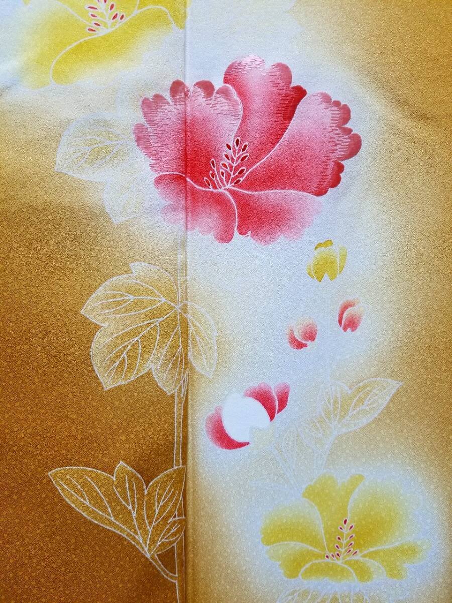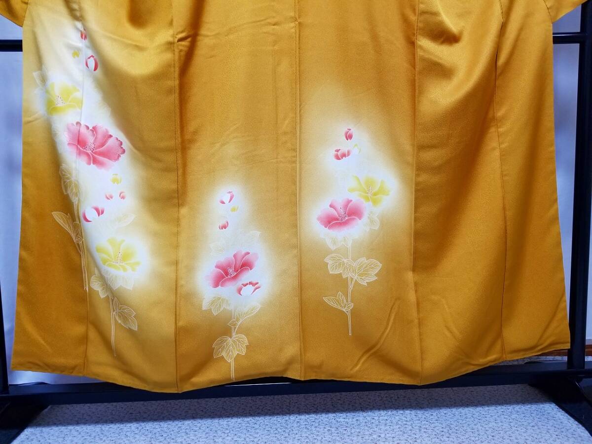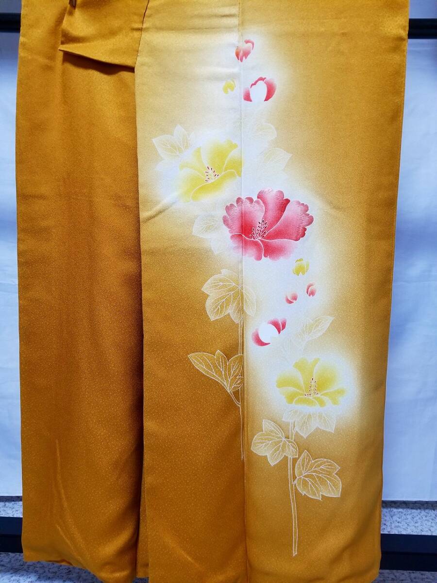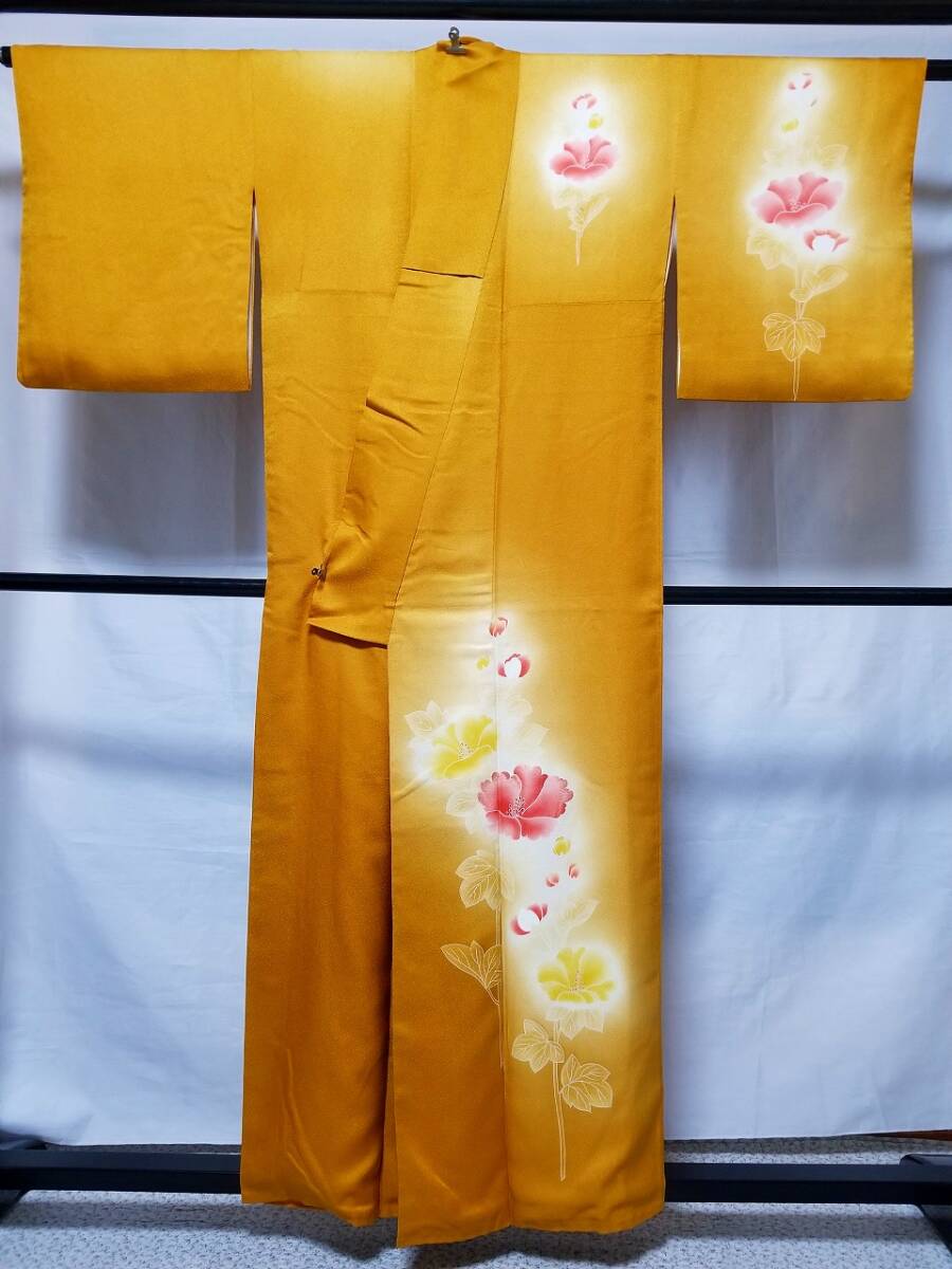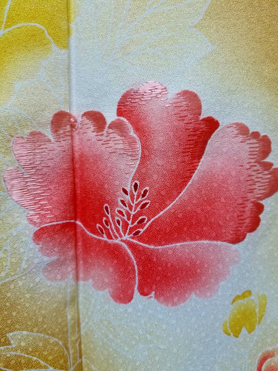 *手縫仕立て品 *中古品 *着用感なし *シミ.汚れなく美品 {生地} ☆正絹*紋繻子地「重め地」**粉雪のような地紋 ☆着物 重さ 約900g {お色} ☆狐色「濃い赤みの黄色」 ☆文様の周りの暈し染色は「黄み白色」です ☆見事な暈し染です {文様} ☆手描き染*手暈し染*手刺繍の花文様 ☆上前身頃の花には極細糸での微細手刺繍 {胴裏地} ☆正絹 羽二重地{純白色}*美品 {八掛地} ☆正絹 精華縮緬地{金茶色*濃い赤みの黄色}*美品 ◎消費税は.お預かりしておりません◎ {寸法} 身丈 {肩から裾まで} 約159cm {内あげ 前身 約6cm 後身 約16cm} 裄丈 約65cm {袖付け 縫い代 袖側 約1.5cm 身側 約2cm} 袖丈 約48.5cm 袖幅 約33cm 前幅 約23.5cm 後幅 約29.5cm *広衿{スナップ付き} (発送方法) ●大阪から ゆうぱっく.おてがる配送 ◎t6227jp 桐輪 「呉服の桐正」でも色々と出品しております {注意事項} (注意事項 必ずお読みください!) ★基本的に土、日、祝日、ゴールデンウィーク、お盆、年末年始はお休みさせて頂いておりますので、ご連絡が遅れる場合もございますので、ご了承ください。 ★どうぞ自己紹介欄も、是非御覧になって下さいませ。 ●落札後にヤフーから届くメールに、メッセージを記載しておりますので、 そちらも必ずご覧下さいませ。 ●当方、ストア出品ではなく、一日中パソコンに向かっておらず、ご連絡は夜になる事が多いです。その点御理解の上、ご入札下さい。 ●お急ぎの場合など、到着希望の日にちが特に近い場合、ご要望にお答えできかねる場合もございます。もちろん、出来る限り、早急に対応はさせて頂きますが、その点は、何卒ご了承下さいませ。 入札前に、発送が間に合うかご質問頂けるとありがたいです ★★基本的に返品、クレームはお受け致しておりませんが、万が一、商品に不都合(大幅な寸法間違い 記載以外の着用不可能な位の、大きなシミ、傷みなどの見落とし)などがございました場合、まず、取引ナビにてご連絡下さいませ。 迅速に対応させて頂きます。 ただし ●商品がお客様の元に到着後、1週間以上経過したもの。 ●お客様側で加工など、手を加えた物。 ●お色目が、思っていたものと違っていた、または、思っていた感じと違っていた。 (画像はできるだけ実物に近い色で写るように努力していますが、素人の撮影ですので、どうしてもPCによって多少違ってくる事があります。出来るだけ、分かりやすいように説明は入れさせて頂きます。分かりにくい場合、ご質問下さい。) 以上につきましては、対応出来ませんので、ご理解下さい。 ★複数商品の落札予定のある場合、ご連絡頂きましたら、1週間程でしたら、お取り置させて頂きます。 お気軽に、お申し出下さいませ。 ★送料は、1個で発送が無理な場合は、こちらよりご連絡させて頂きます。 | |||