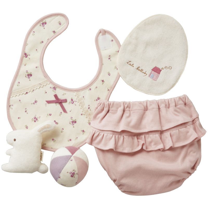 【材質】レーススタイ:(表)綿100%、(裏)表パイル・中ポリウレタンフィルムコーティング加工、フリルパンツ・授乳スタイ:綿100%、マスコット:綿100%(オーガニックコットン)、(中綿)ポリエステル100%、ボール:綿100%、(中綿)ポリエステル100%
