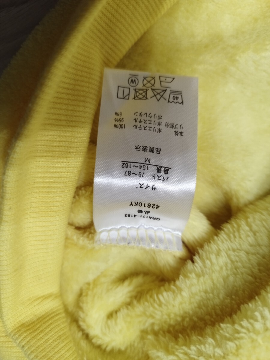 サイズはレディースM、平置きで身幅約47cm、着丈約64cm、ぬいぐるみのようなあったか素材です。