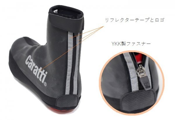 ・リフレクター(ファスナー部のダブルストライプ、Carattiロゴ)が夜間の視認性を強化。