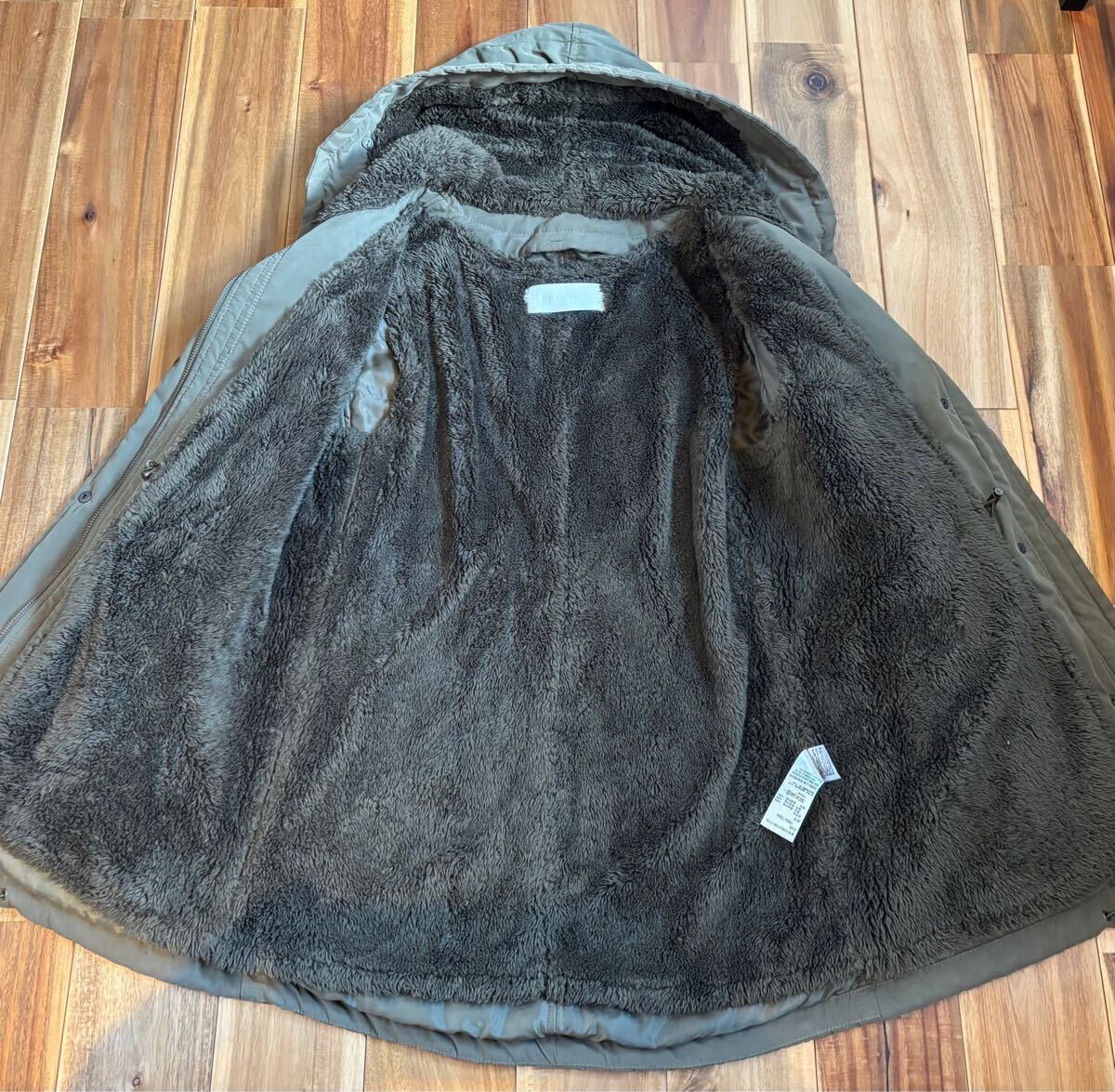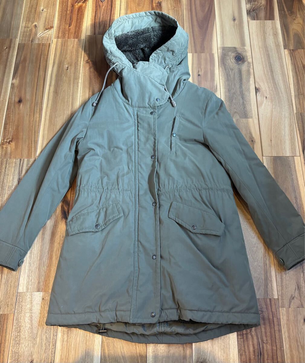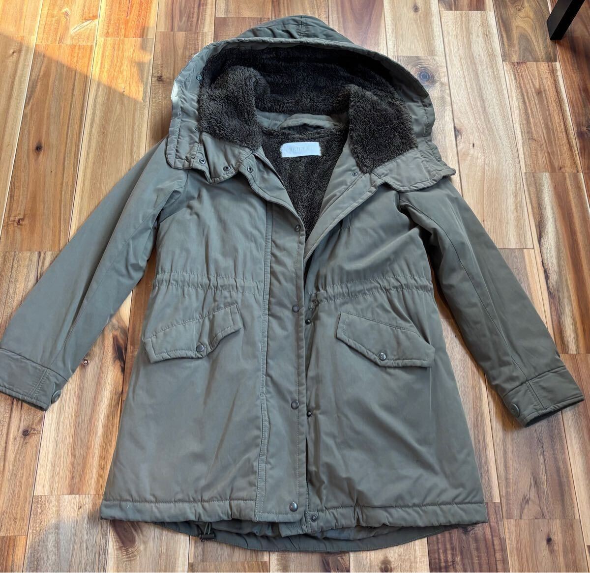 取り外し出来るフリース裏地とボアフード付きのオリーブグリーンモッズコート。