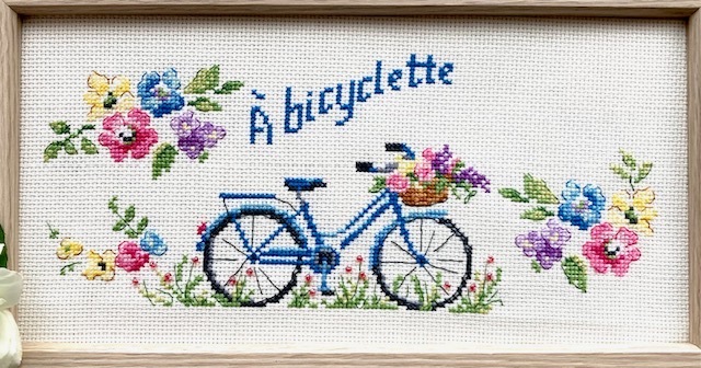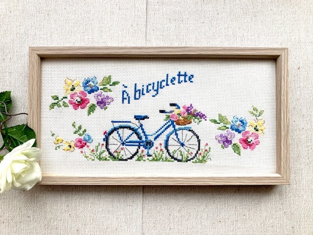 クロスステッチ刺繍でお花と自転車のお柄をハンドメイドしました。