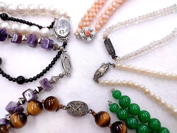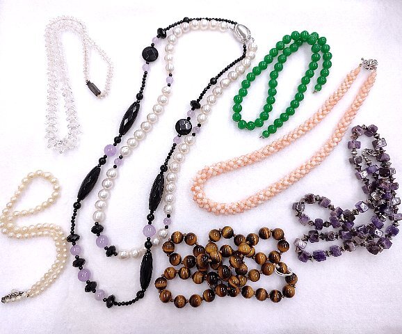 ★ネックレス全長 虎目石 約61cm アメジスト 約63cm 緑色 約39cm(金具無し) 真珠&黒色 約50cm さんご 約42cm 水晶 約41cm 真珠 約36cm 約) 355.4g (総量) |